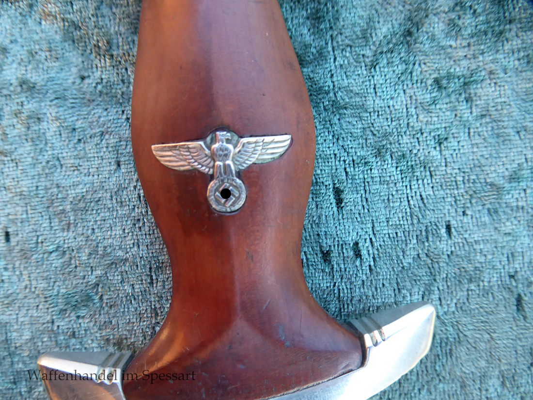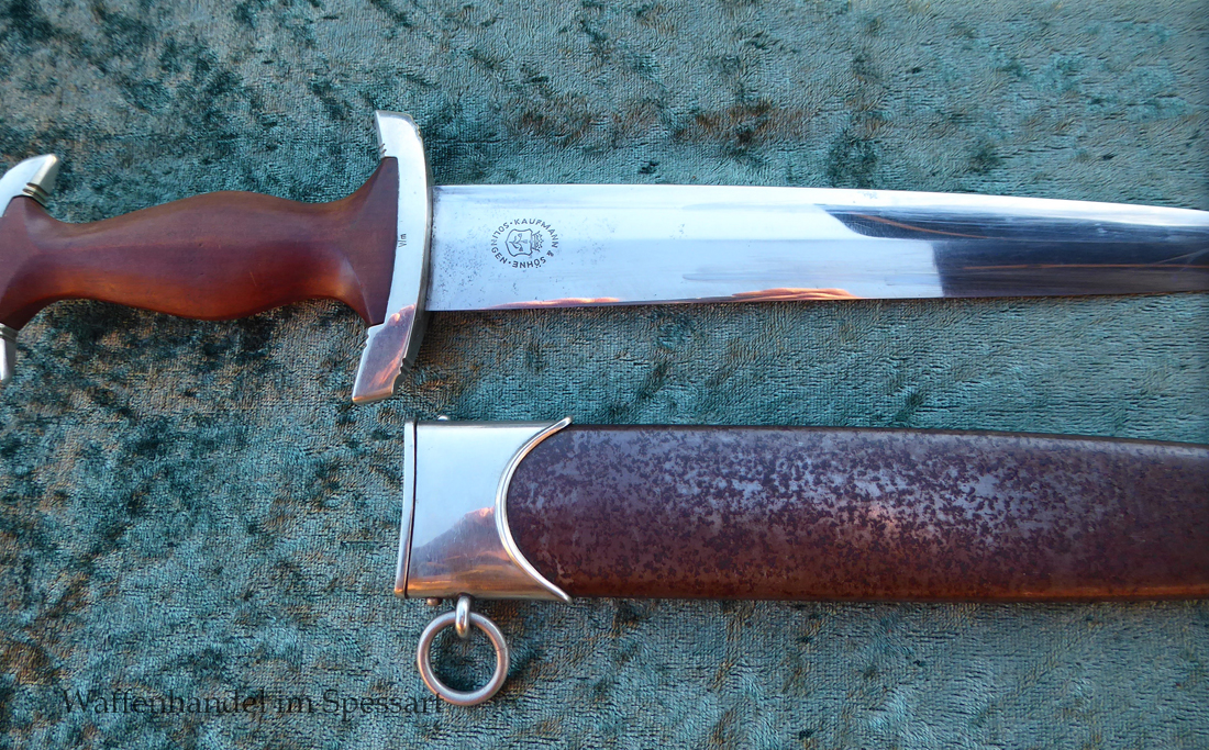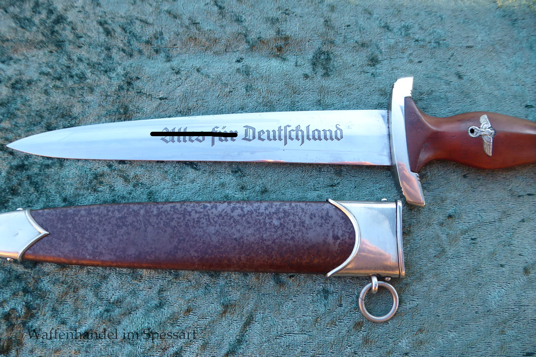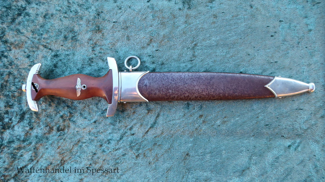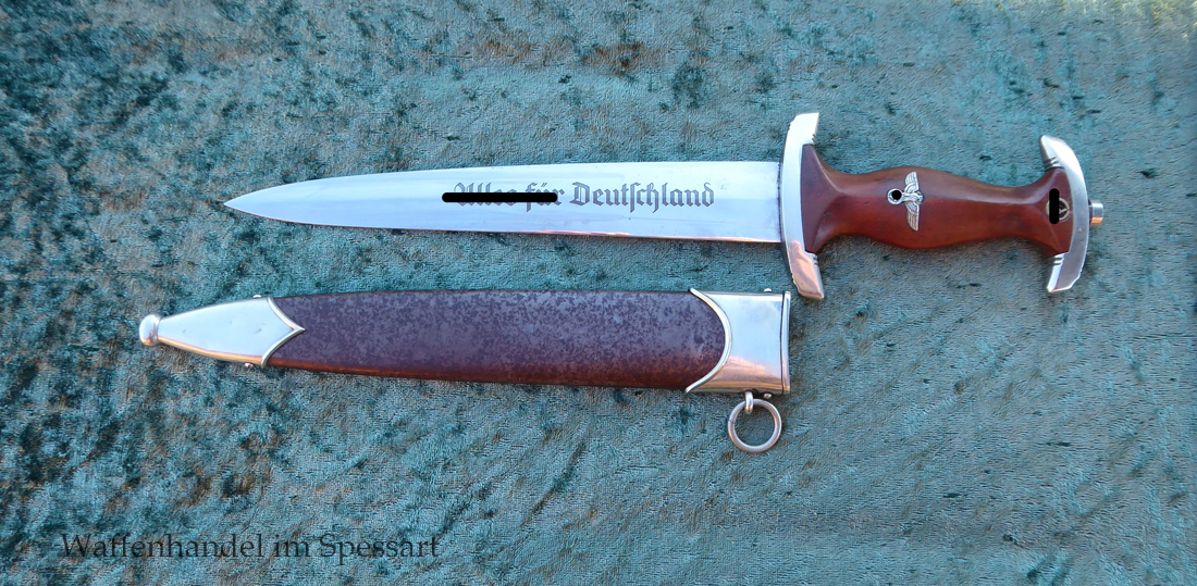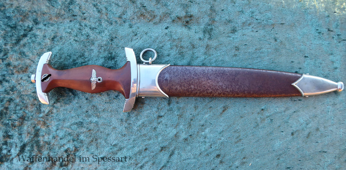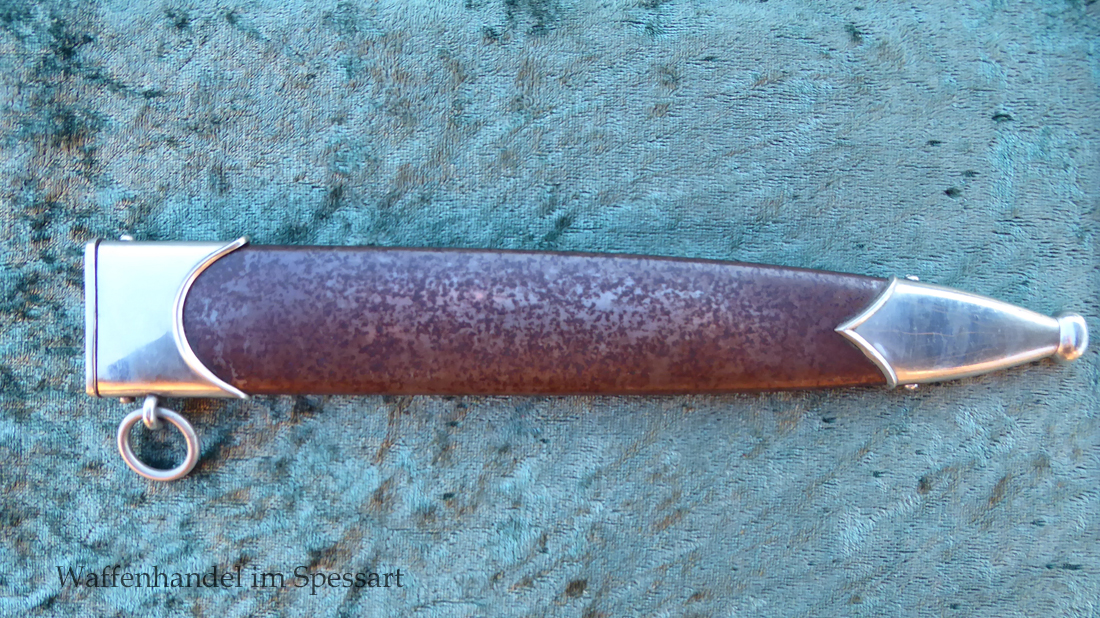 Hersteller Kaufmann & Söhne Solingen. Gaustempel Wm für Gau Westmark auf der Parierstange geschlagen. Die Griff- und Scheidenbeschläge sind aus Neusilber. Der Adler ist in Neusilberausführung. Die Scheide ist original bräuniert und hat altersbedingt Flecken aber keine Rostnarben.. Die Klinge ist geätzter Devise Alles für Deutschland. Die Klinge ist orginal blank erhalten!. Der Dolch geht gleitend und saugend in die Scheide.