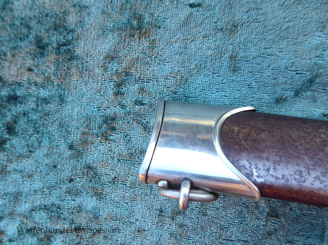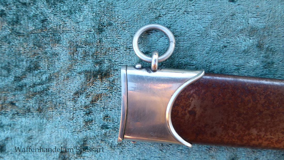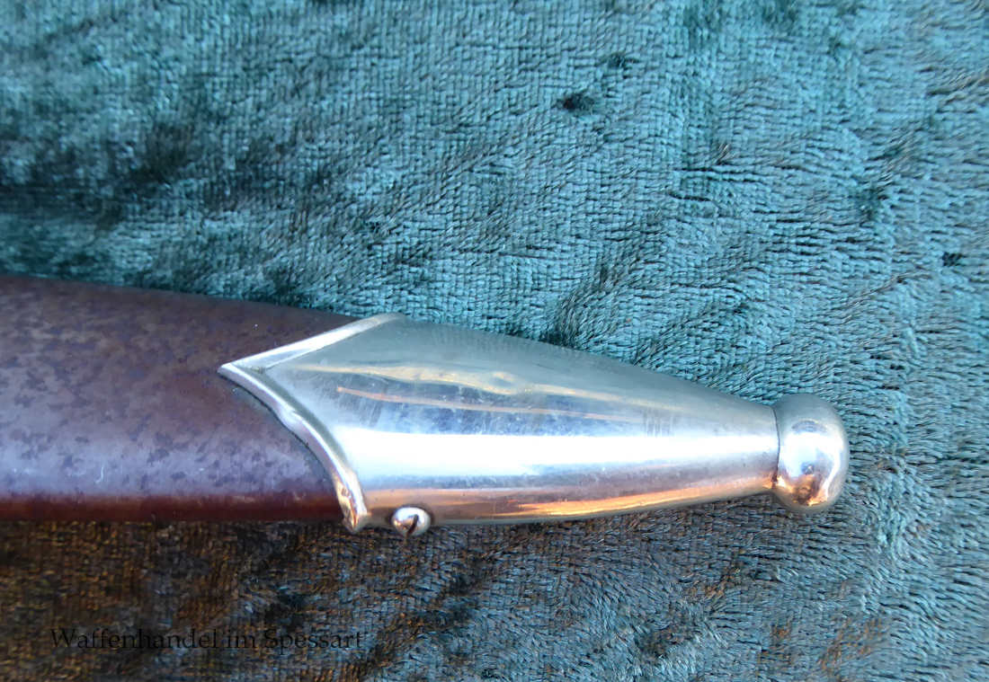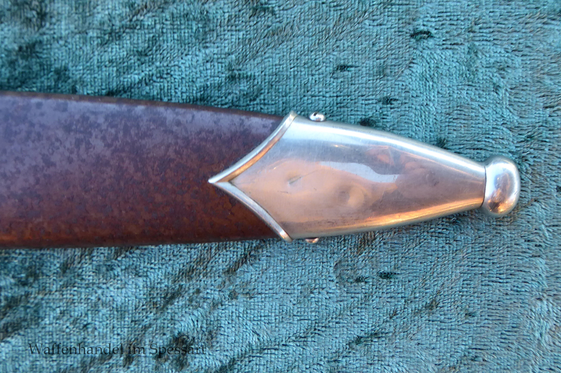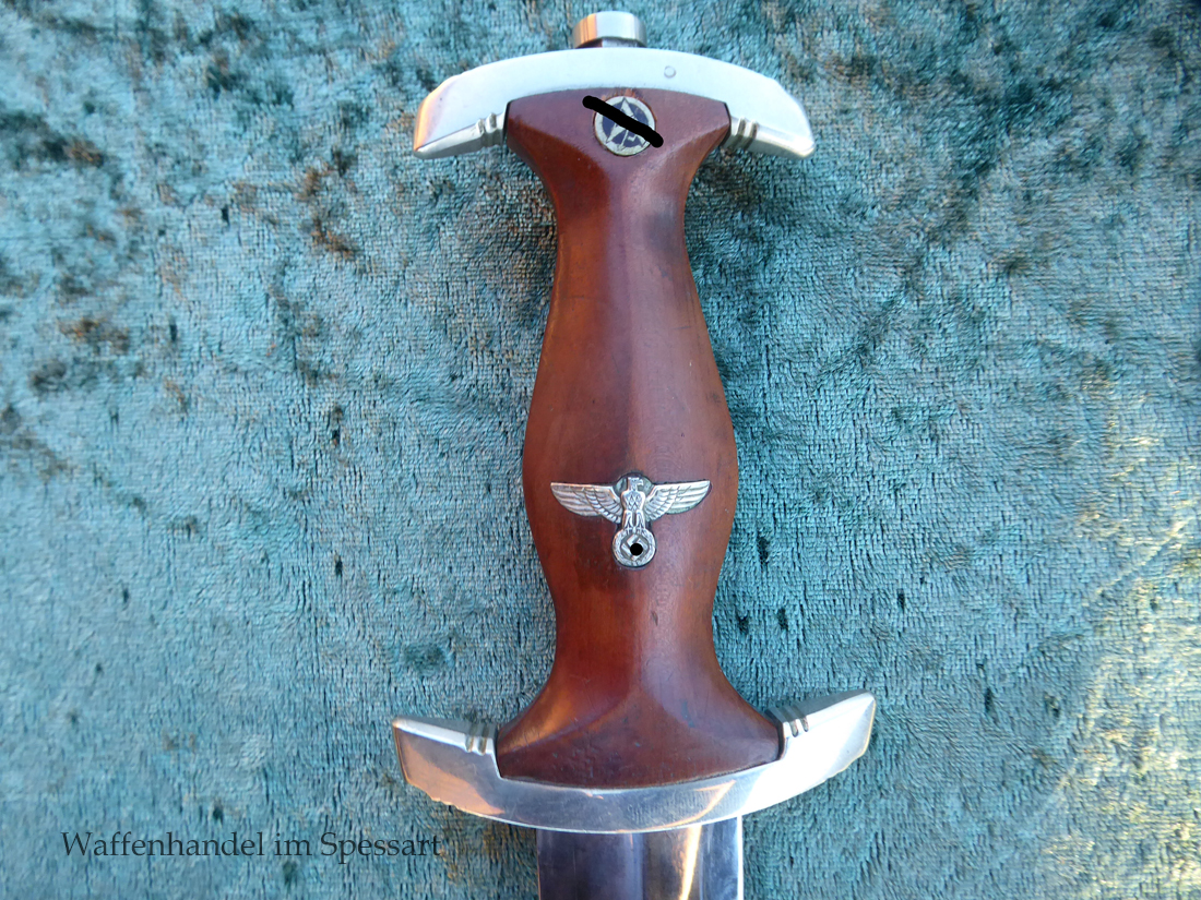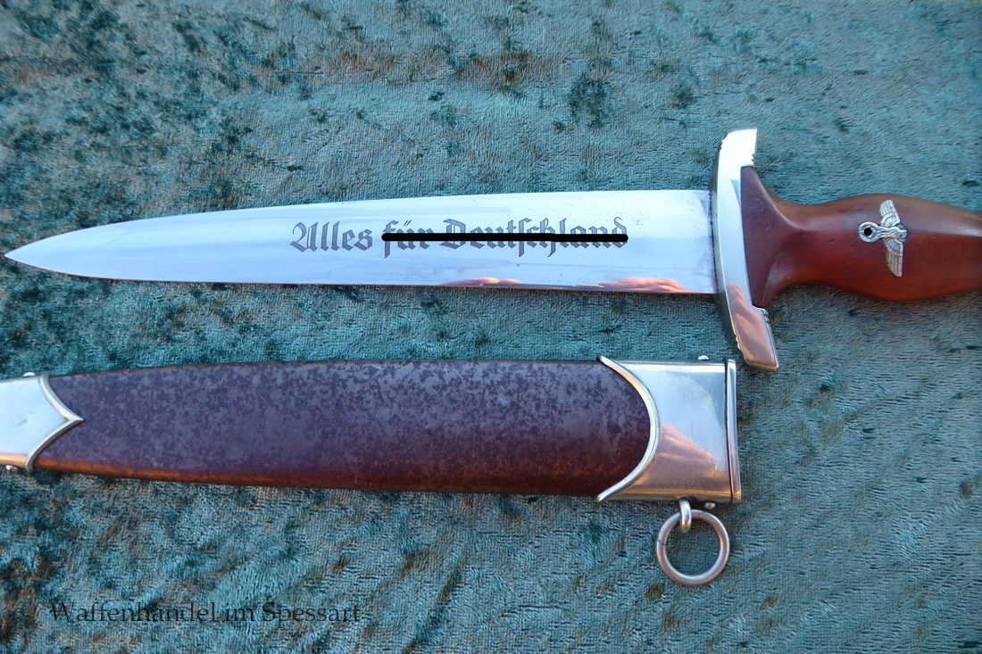 Hersteller Kaufmann & Söhne Solingen. Gaustempel Wm für Gau Westmark auf der Parierstange geschlagen. Die Griff- und Scheidenbeschläge sind aus Neusilber. Der Adler ist in Neusilberausführung. Die Scheide ist original bräuniert und hat altersbedingt Flecken aber keine Rostnarben.. Die Klinge ist geätzter Devise Alles für Deutschland. Die Klinge ist orginal blank erhalten!. Der Dolch geht gleitend und saugend in die Scheide.