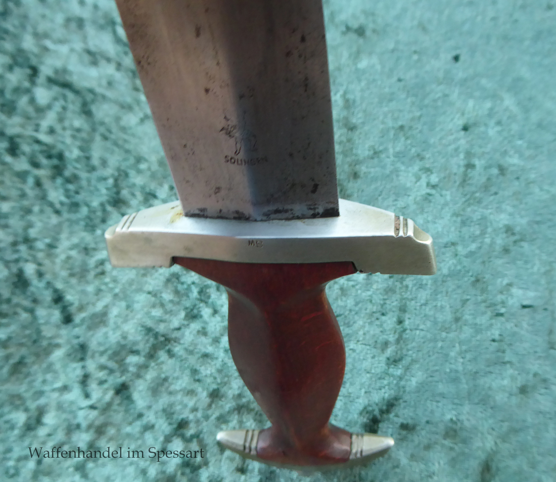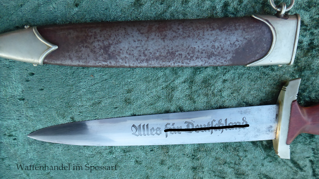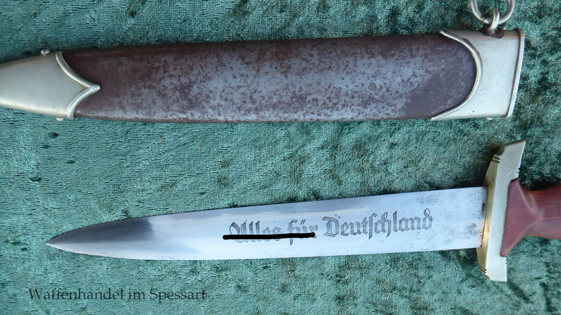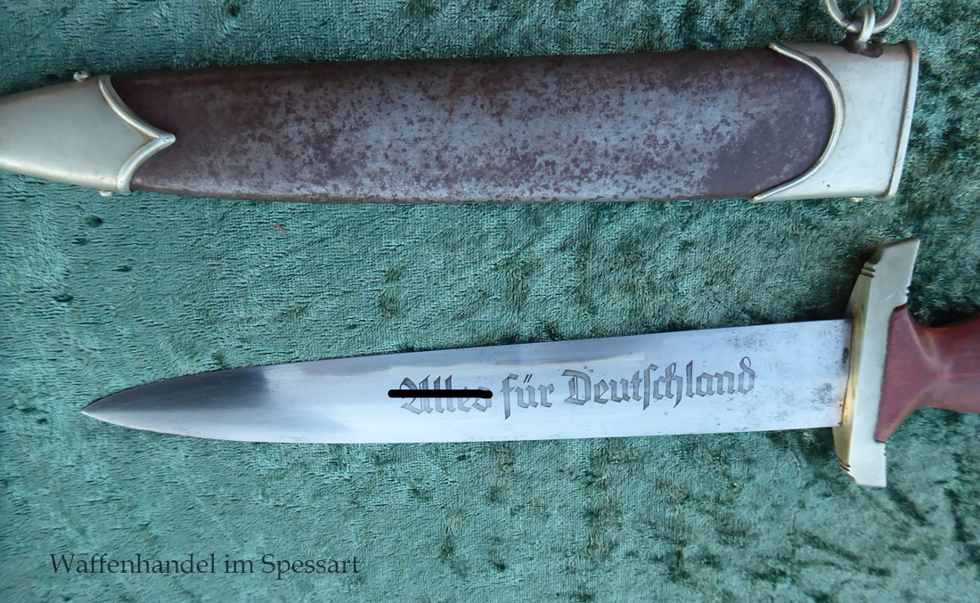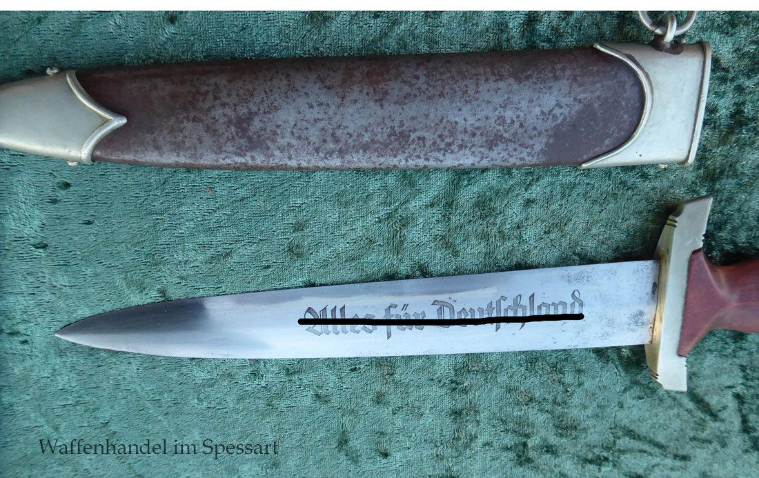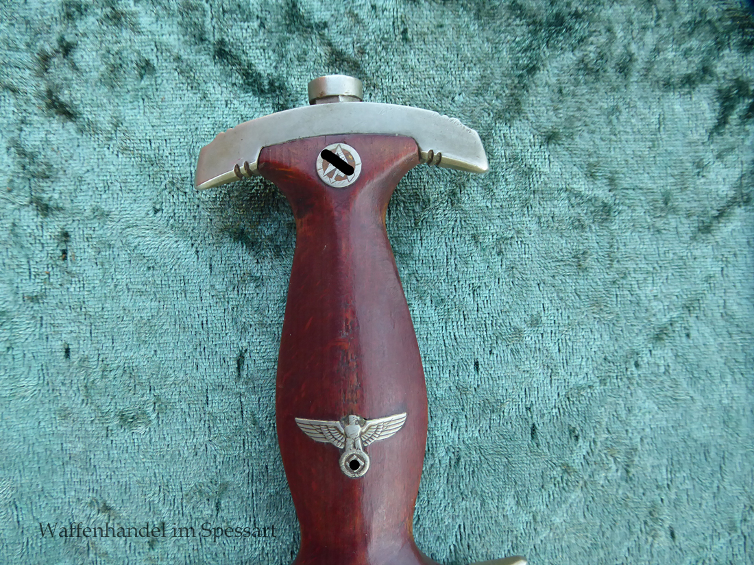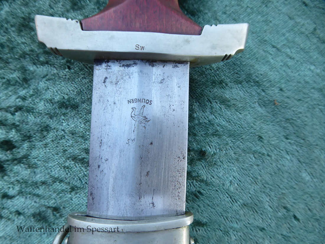 Hersteller Ernst Pack & Söhne Solingen (Ritterwerk). Gaustempel SW für Gau Südwest auf der Parierstange geschlagen. Auf dem oberen Beschlag der Scheide Trägerinitialen W Sch. Auf der Rückseite der Klinge wurde die Röhm Wittmung wie vorgeschrieben in den 30-er jahren entfernt. Die Griff- und Scheidenbeschläge sind aus Neusilber, der Ortbeschlag der Scheide aus vernickeltem Stahl, so orig. montiert!. Der Adler ist in Neusilberausführung. Die Scheide ist bräuniert, hat Patina und Tragespuren. Die Klinge ist geätzter Devise Alles für Deutschland. Die Klinge ist fast blank und hat geringe Fleckchen. Der Dolch geht gleitend und saugend in die Scheide.