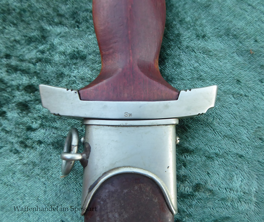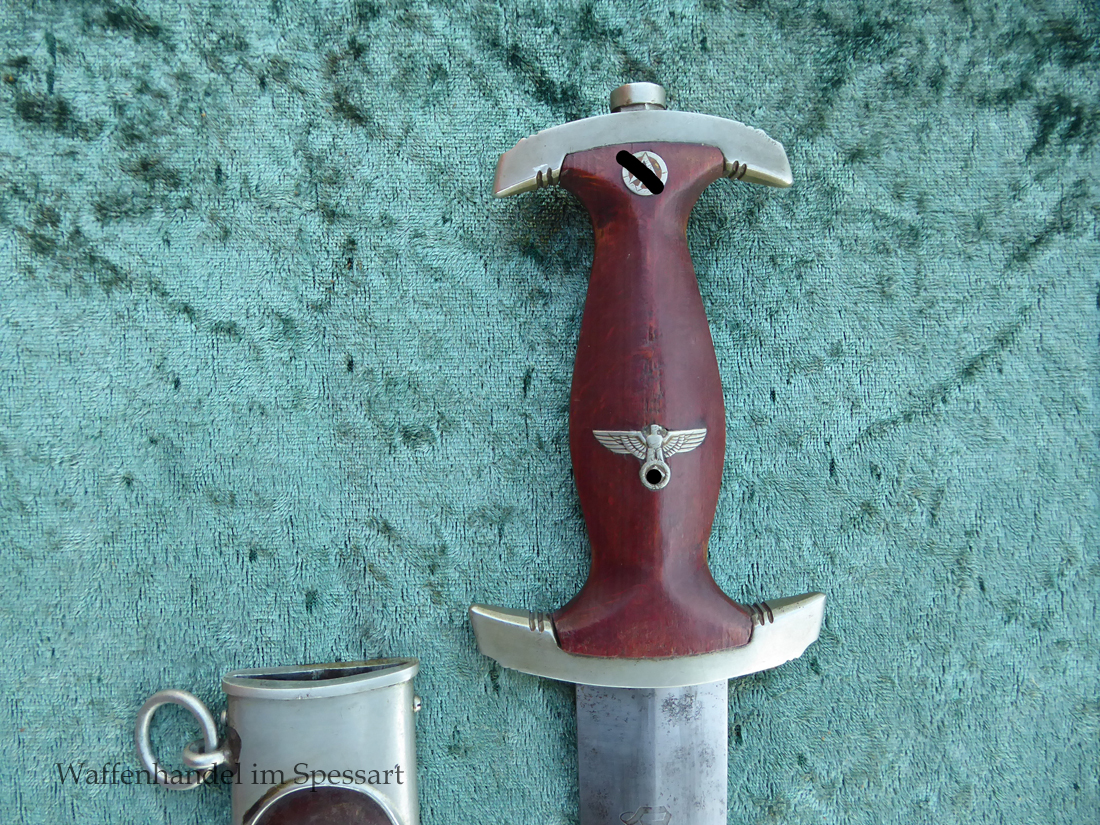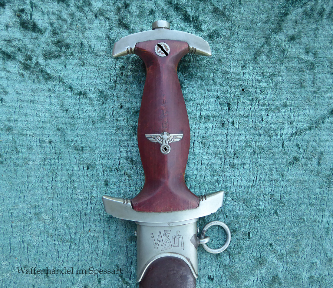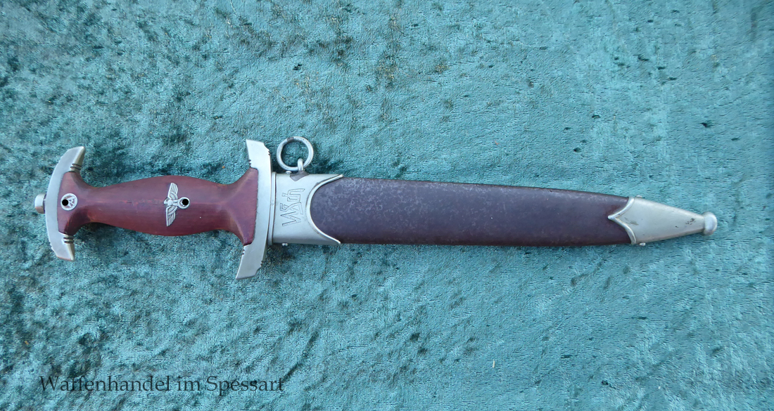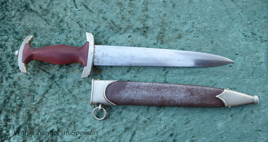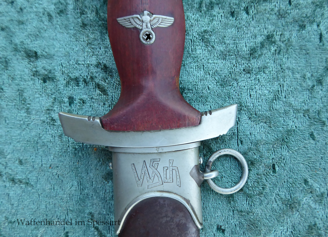 Hersteller Ernst Pack & Söhne Solingen (Ritterwerk). Gaustempel SW für Gau Südwest auf der Parierstange geschlagen. Auf dem oberen Beschlag der Scheide Trägerinitialen W Sch. Auf der Rückseite der Klinge wurde die Röhm Wittmung wie vorgeschrieben in den 30-er jahren entfernt. Die Griff- und Scheidenbeschläge sind aus Neusilber, der Ortbeschlag der Scheide aus vernickeltem Stahl, so orig. montiert!. Der Adler ist in Neusilberausführung. Die Scheide ist bräuniert, hat Patina und Tragespuren. Die Klinge ist geätzter Devise Alles für Deutschland. Die Klinge ist fast blank und hat geringe Fleckchen. Der Dolch geht gleitend und saugend in die Scheide.