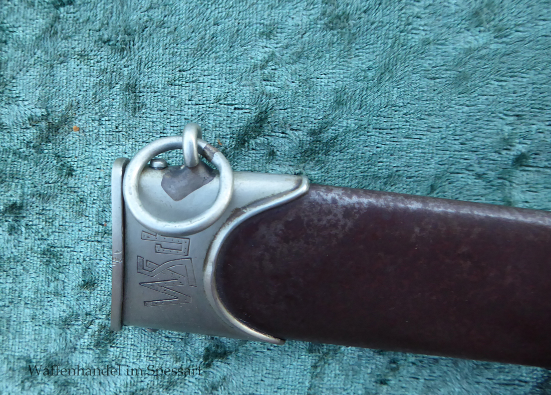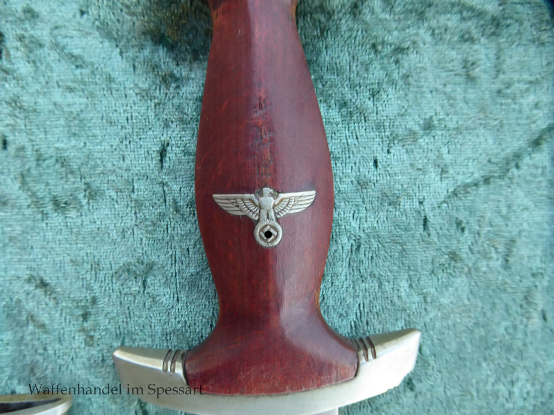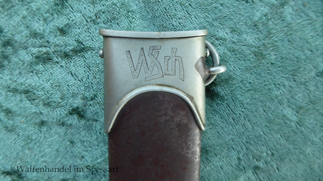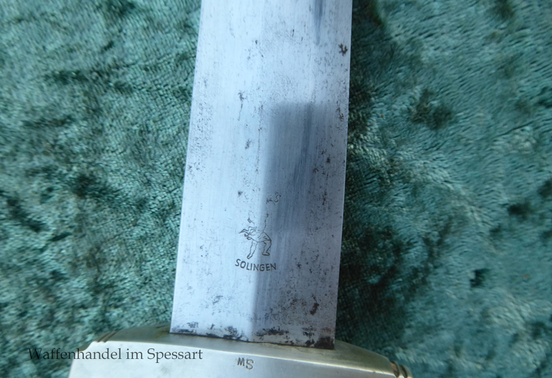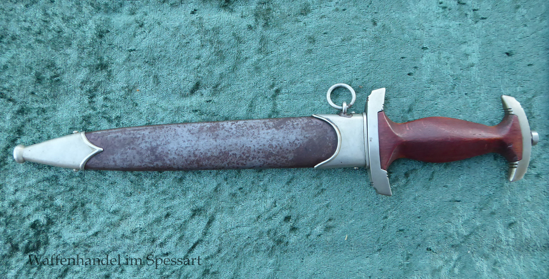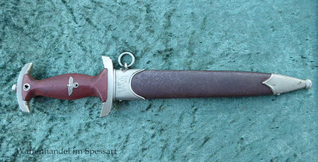 Hersteller Ernst Pack & Söhne Solingen (Ritterwerk). Gaustempel SW für Gau Südwest auf der Parierstange geschlagen. Auf dem oberen Beschlag der Scheide Trägerinitialen W Sch. Auf der Rückseite der Klinge wurde die Röhm Wittmung wie vorgeschrieben in den 30-er jahren entfernt. Die Griff- und Scheidenbeschläge sind aus Neusilber, der Ortbeschlag der Scheide aus vernickeltem Stahl, so orig. montiert!. Der Adler ist in Neusilberausführung. Die Scheide ist bräuniert, hat Patina und Tragespuren. Die Klinge ist geätzter Devise Alles für Deutschland. Die Klinge ist fast blank und hat geringe Fleckchen. Der Dolch geht gleitend und saugend in die Scheide.