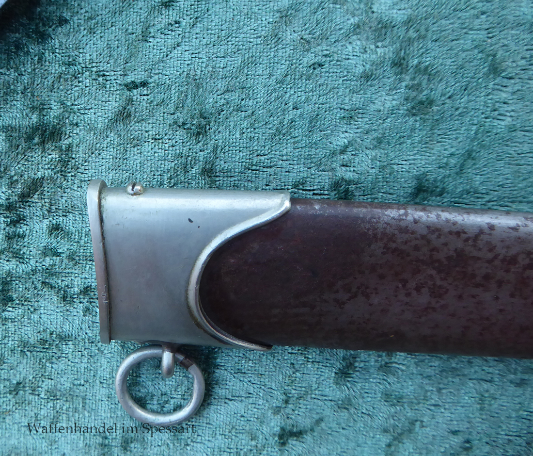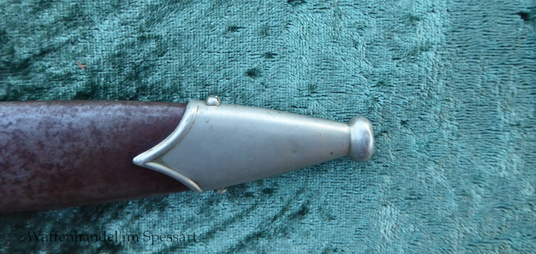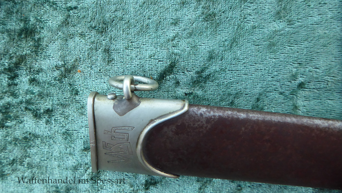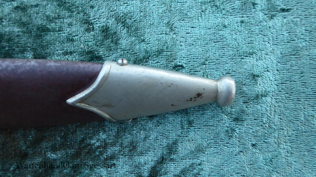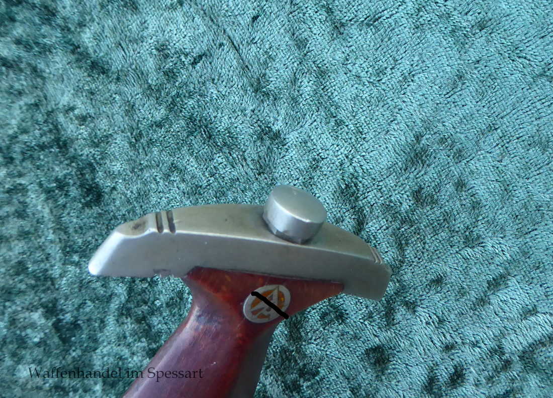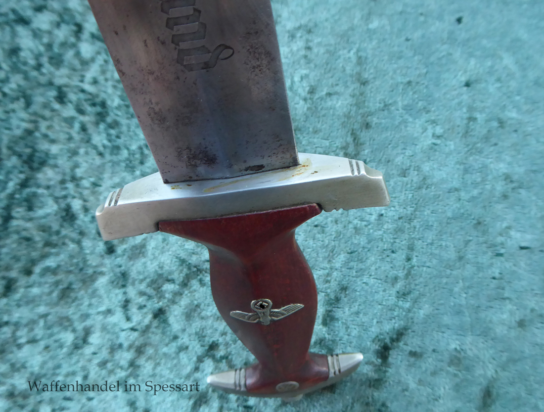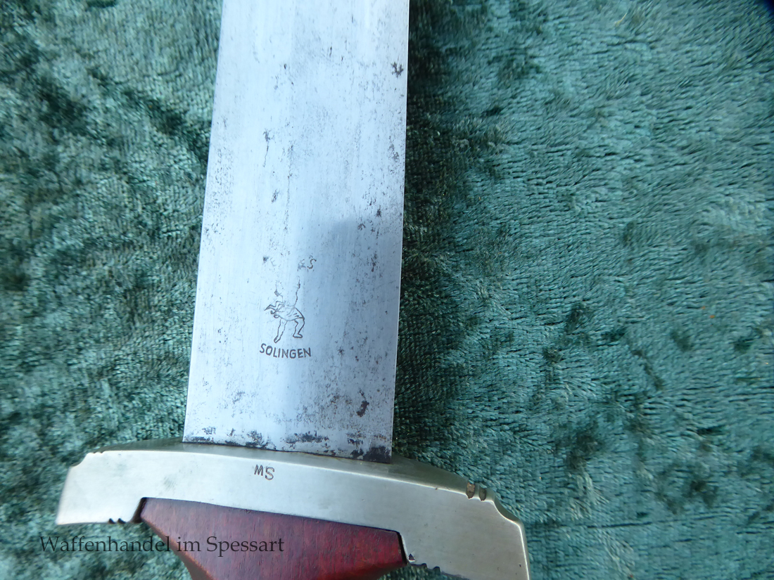 Hersteller Ernst Pack & Söhne Solingen (Ritterwerk). Gaustempel SW für Gau Südwest auf der Parierstange geschlagen. Auf dem oberen Beschlag der Scheide Trägerinitialen W Sch. Auf der Rückseite der Klinge wurde die Röhm Wittmung wie vorgeschrieben in den 30-er jahren entfernt. Die Griff- und Scheidenbeschläge sind aus Neusilber, der Ortbeschlag der Scheide aus vernickeltem Stahl, so orig. montiert!. Der Adler ist in Neusilberausführung. Die Scheide ist bräuniert, hat Patina und Tragespuren. Die Klinge ist geätzter Devise Alles für Deutschland. Die Klinge ist fast blank und hat geringe Fleckchen. Der Dolch geht gleitend und saugend in die Scheide.