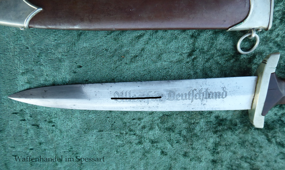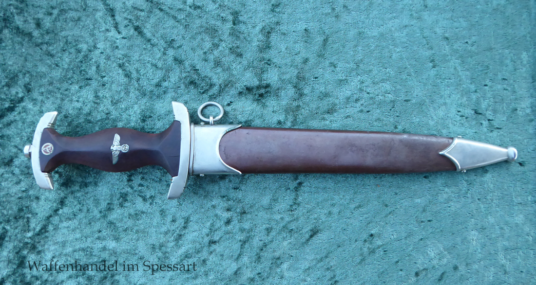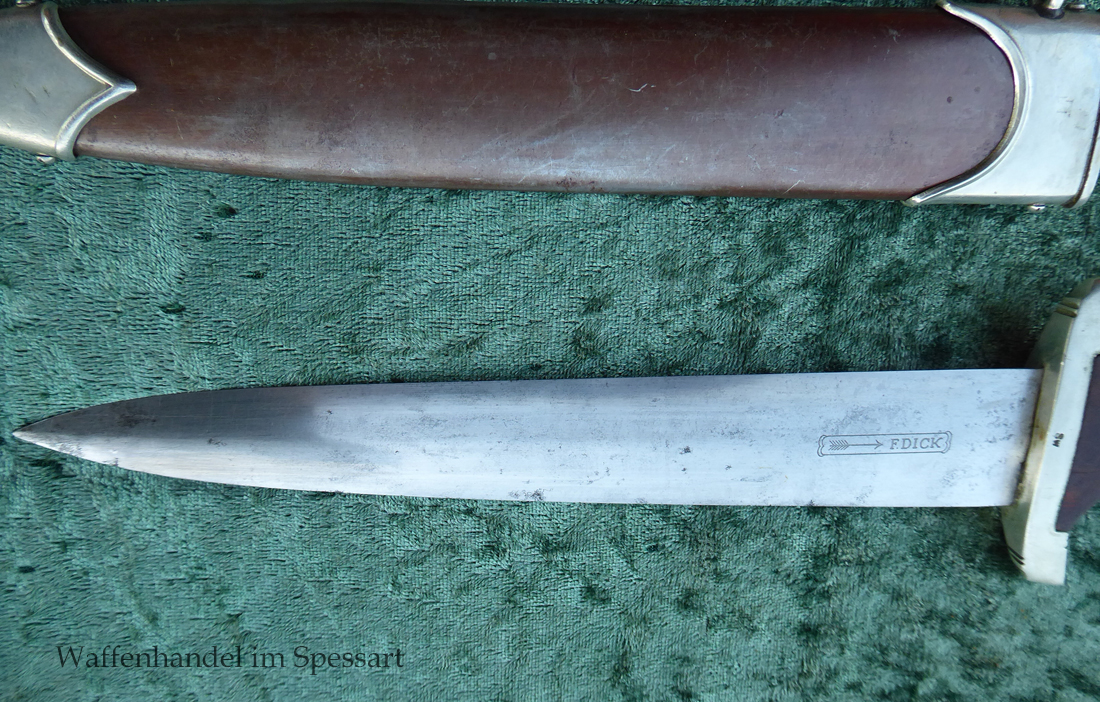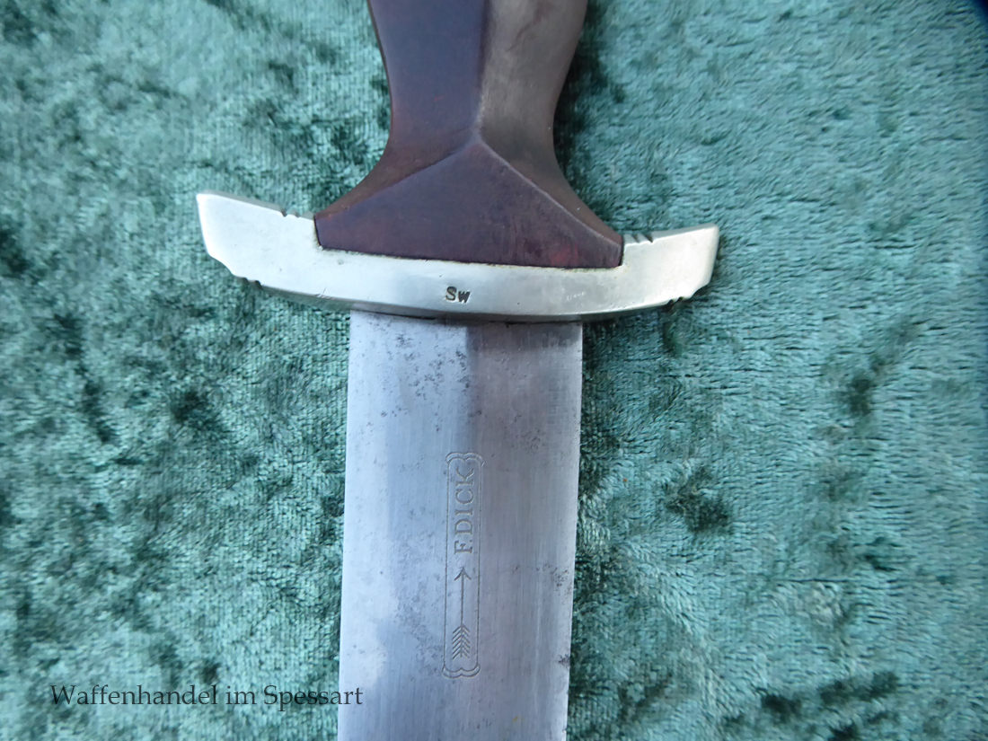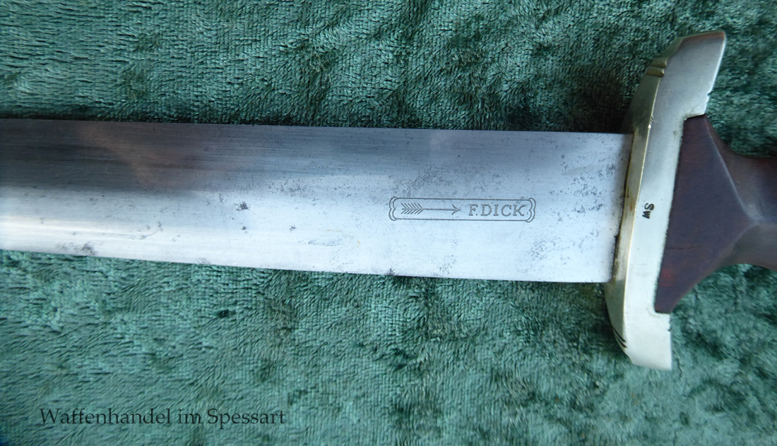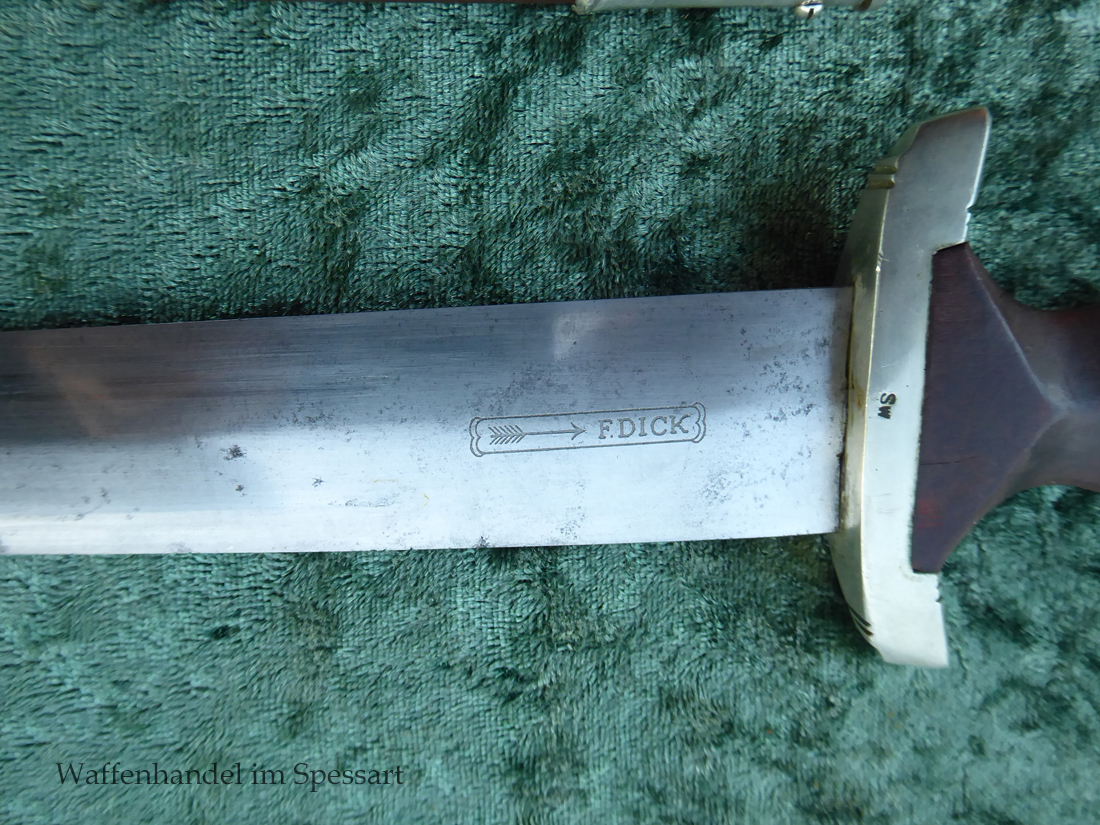 Hersteller F. Dick. Gaustempel SW für Gau Südwest auf der Parierstange geschlagen. Die Griff- und Scheidenbeschläge sind aus Neusilber. Der Adler ist in Neusilberausführung. Die orig. Bräunierung auf der Scheide ist sehr gut erhalten und zum größten Teil noch mit dem orig. Schutzlack überzogen. Die Klinge ist geätzter Devise Alles für Deutschland. Sehr gut erhaltene Klinge mit Spuren von Heraus- und Hineinschieben. Sehr gut erhaltener ungereinigter Doch der in allen Teilen original zusammengehörig.