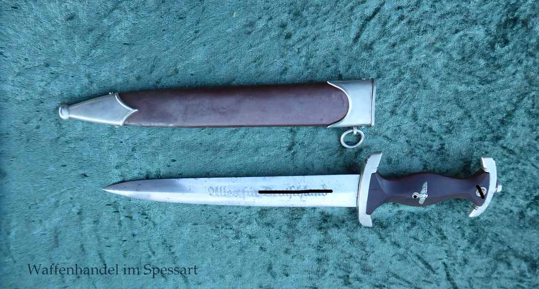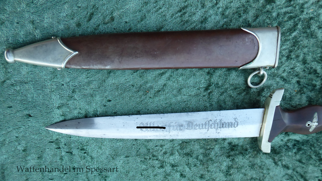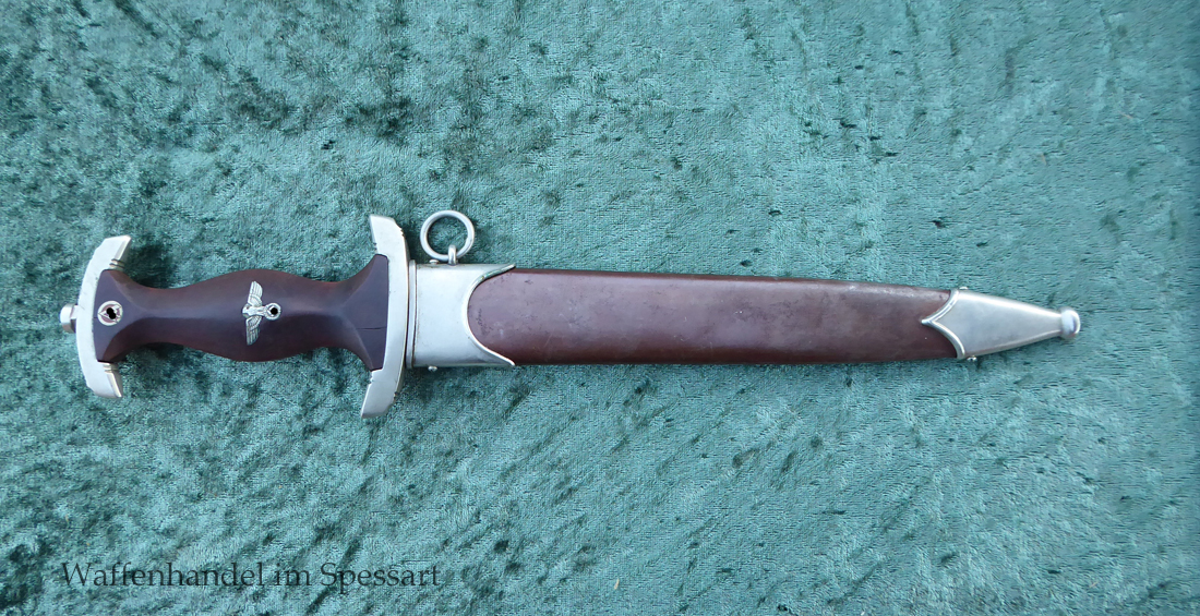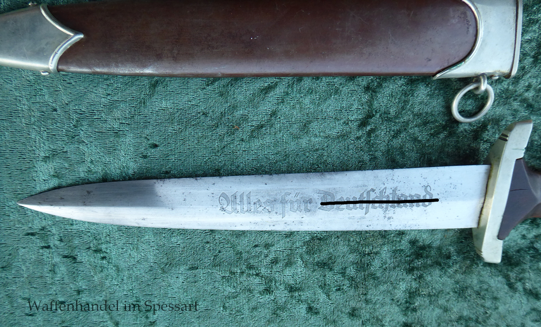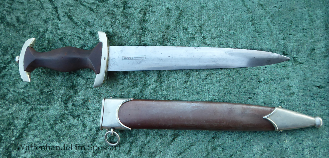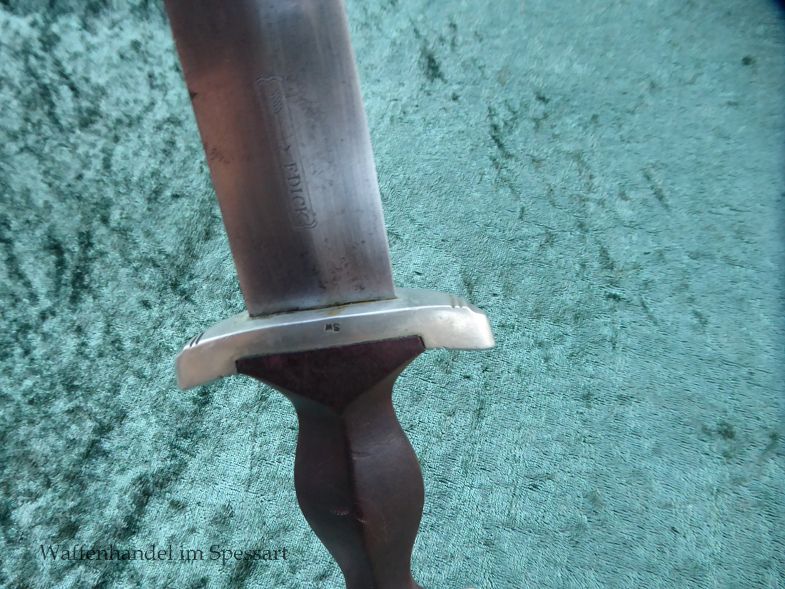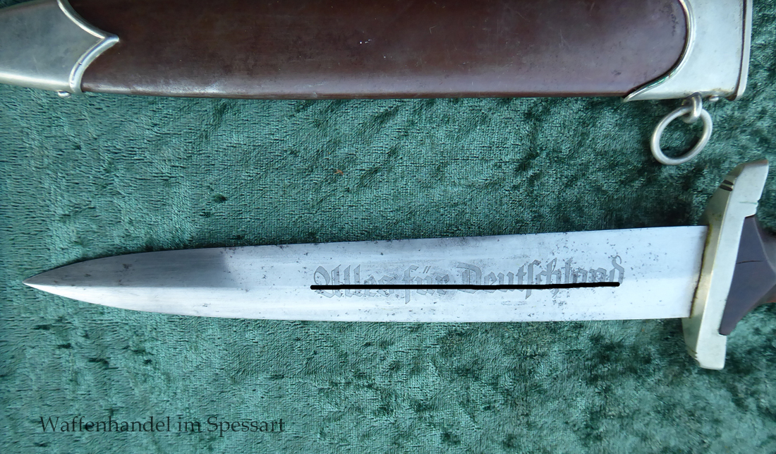 Hersteller F. Dick. Gaustempel SW für Gau Südwest auf der Parierstange geschlagen. Die Griff- und Scheidenbeschläge sind aus Neusilber. Der Adler ist in Neusilberausführung. Die orig. Bräunierung auf der Scheide ist sehr gut erhalten und zum größten Teil noch mit dem orig. Schutzlack überzogen. Die Klinge ist geätzter Devise Alles für Deutschland. Sehr gut erhaltene Klinge mit Spuren von Heraus- und Hineinschieben. Sehr gut erhaltener ungereinigter Doch der in allen Teilen original zusammengehörig.