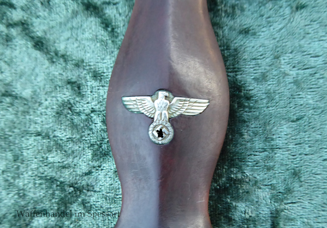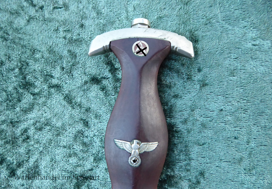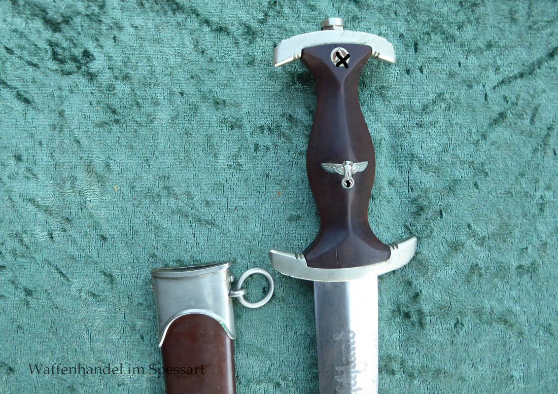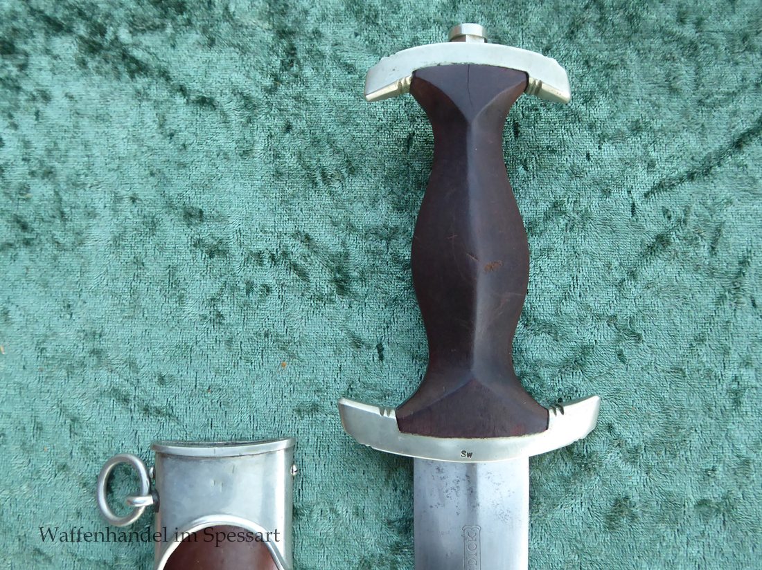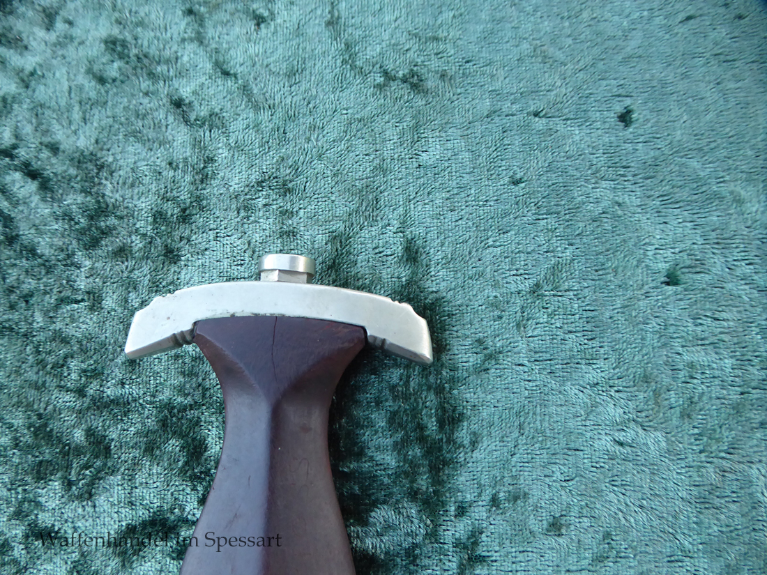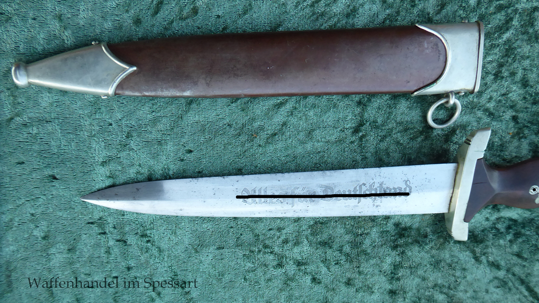 Hersteller F. Dick. Gaustempel SW für Gau Südwest auf der Parierstange geschlagen. Die Griff- und Scheidenbeschläge sind aus Neusilber. Der Adler ist in Neusilberausführung. Die orig. Bräunierung auf der Scheide ist sehr gut erhalten und zum größten Teil noch mit dem orig. Schutzlack überzogen. Die Klinge ist geätzter Devise Alles für Deutschland. Sehr gut erhaltene Klinge mit Spuren von Heraus- und Hineinschieben. Sehr gut erhaltener ungereinigter Doch der in allen Teilen original zusammengehörig.