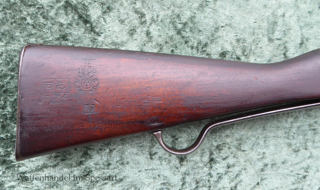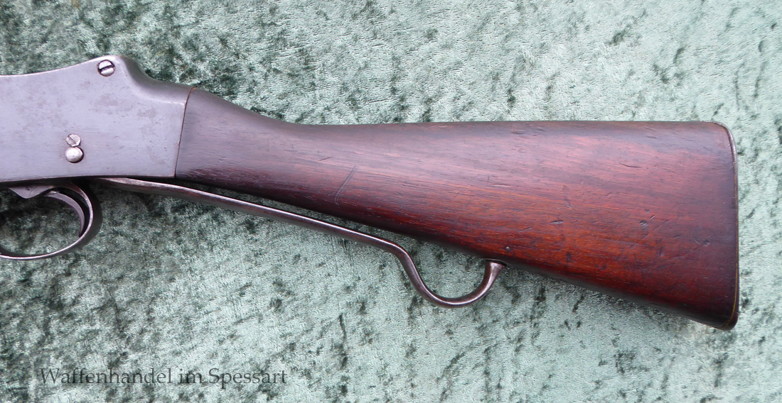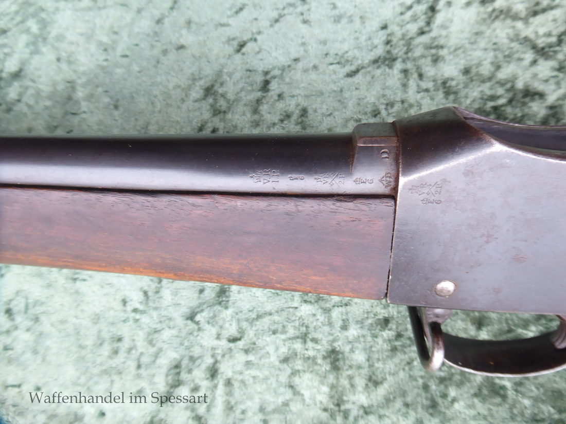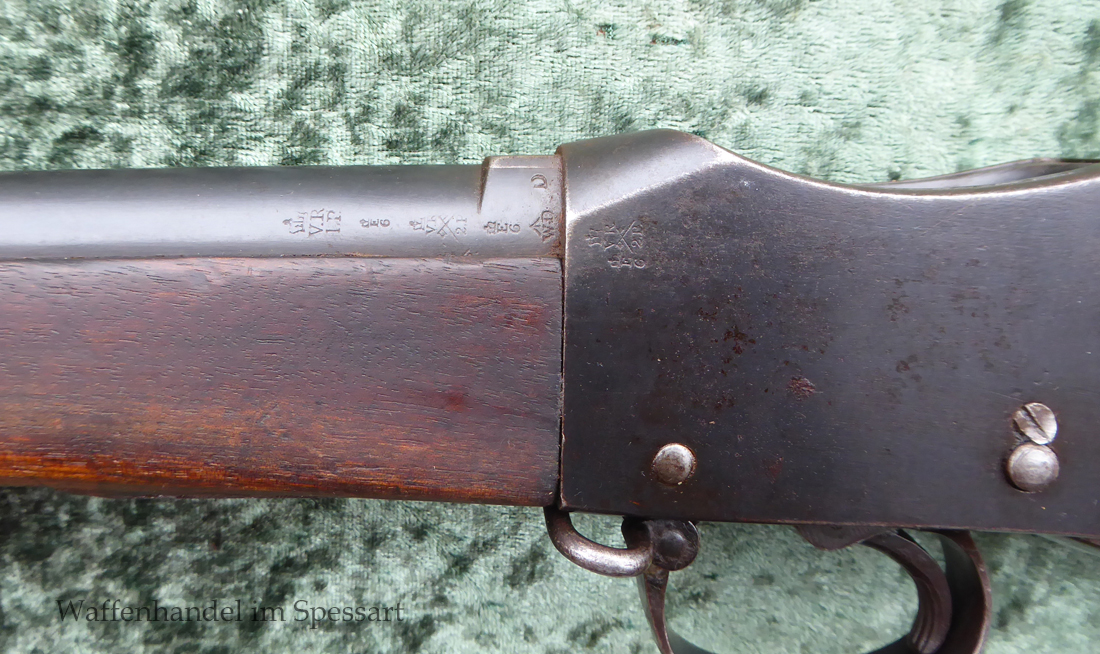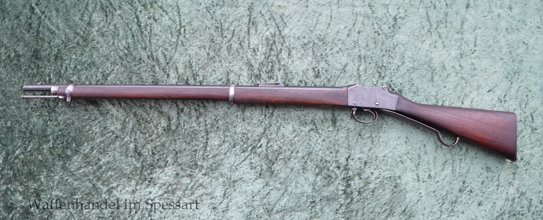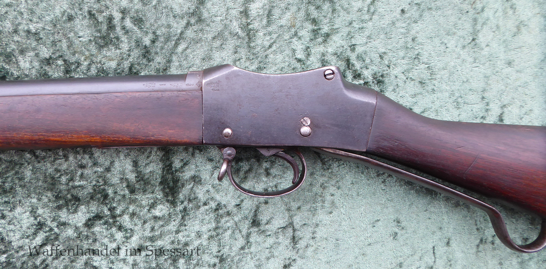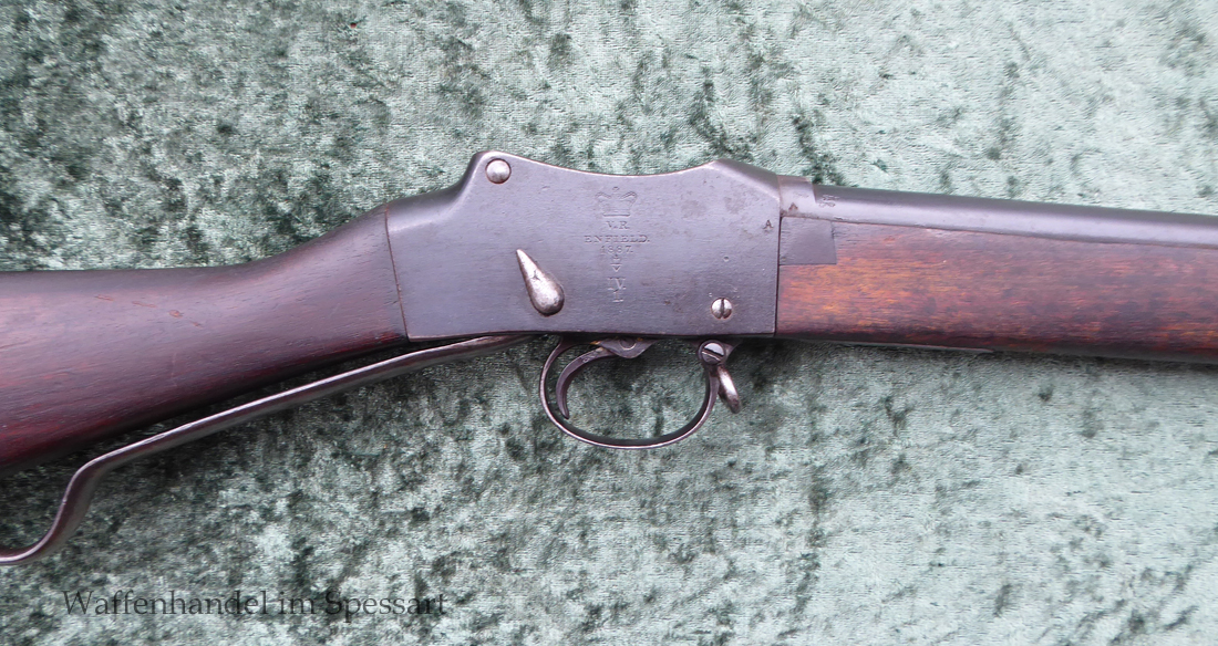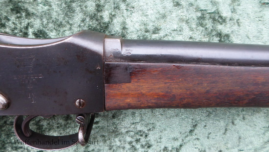 Hersteller Enfield. Kal..577/450Martini. Baujahr 1887. Ser.Nr. 579. Das Laufinnere hat klassische Felder und Züge für Bleigeschosse. Es ist fast blank. Sehr gut original brünierte Metallteile. Schöner Schaft mit deutlicher tiefer Bestempelungen.Unter anderem Matras Arsenal. Das Gewehr hat die britischen Beschußzeichen und auf vielen Teilen den Broad Arrow Stempel.