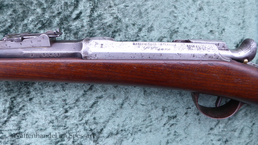 Ursprünglicher Hersteller Manufacture d’armes de Saint-Étienne (MAS). Kaliber 11,15x60RM71. Ser.Nr. J 35856. Nummerngleich. Scharfkantiges fast blankes Laufinnere. Am Lauf Reste der Bürnierung. Das System ist gering fleckig. Die preußischen Schaftabnahmen sind noch sichtbar. Baujahr der Änderung auf der Systemhülse 1873 gestempelt.