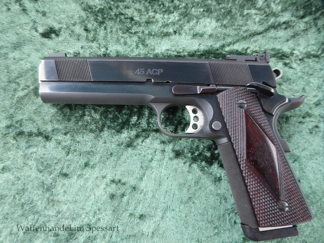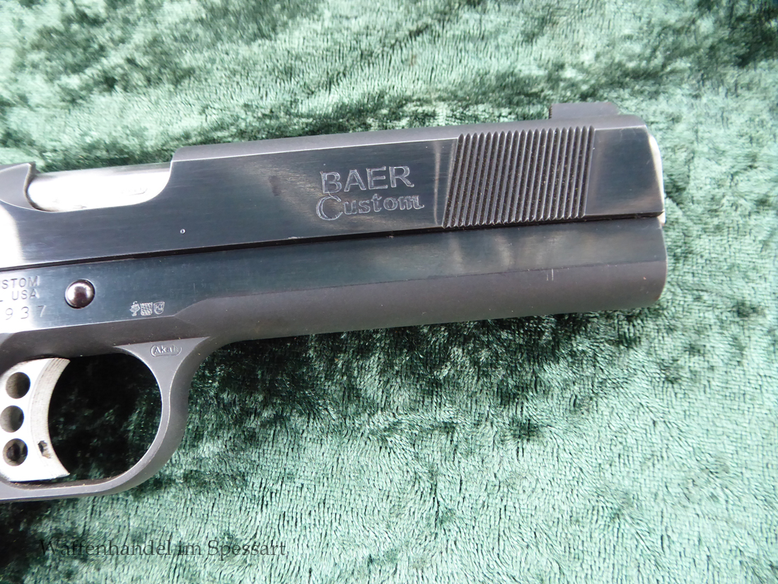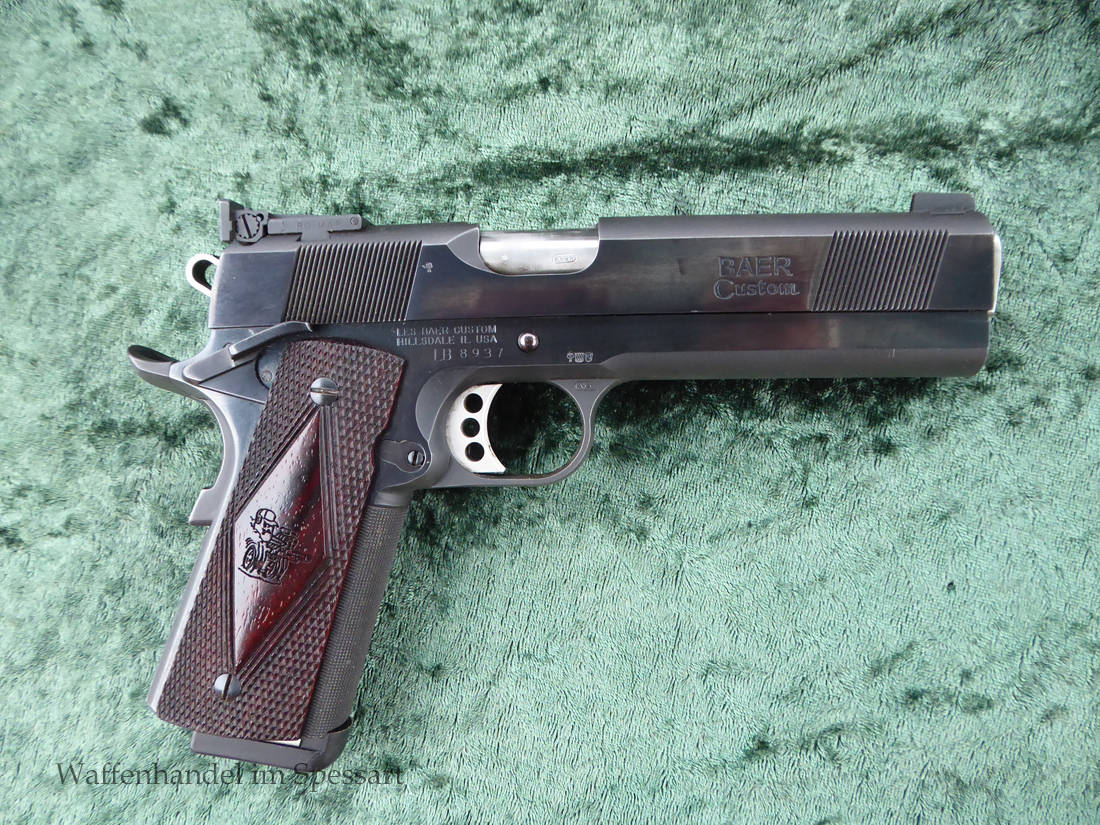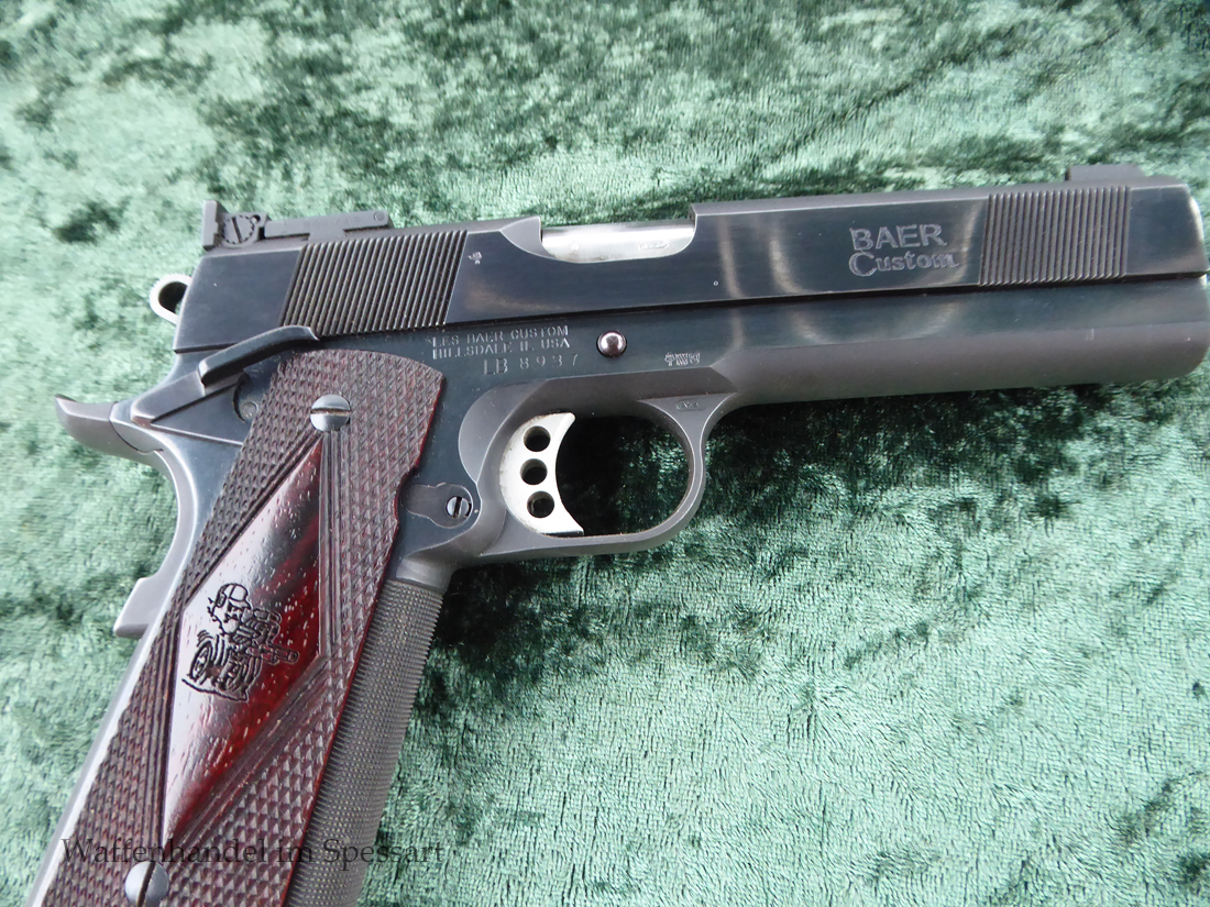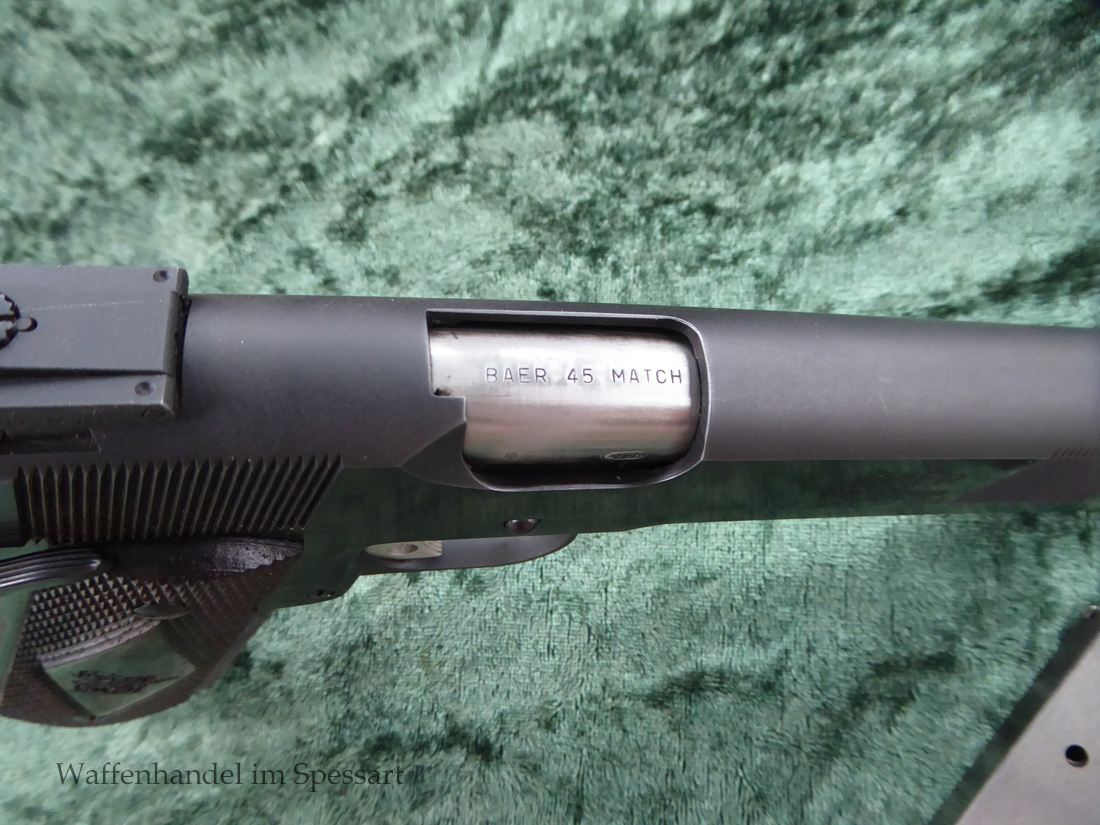 Kaliber.45Auto. Les Baer 5" Matchlauf, Match-Bushing. Les Baer Schlitten mit Front und Rear Griffrillen, Baer "Monolith" Griffstück mit Long Dust Cover, 30 LPI-Griffstückcheckering, vergrößertes Auswurffenster, Aluminium-Matchabzug, Bo-Mar-Visierung, Commander de Luxe Hammer und Sear, Baer-Beavertail, beidseitige Sicherung, gecheckerte Holzgriffschalen, 8-Schuß Magazin mit Abschluß.