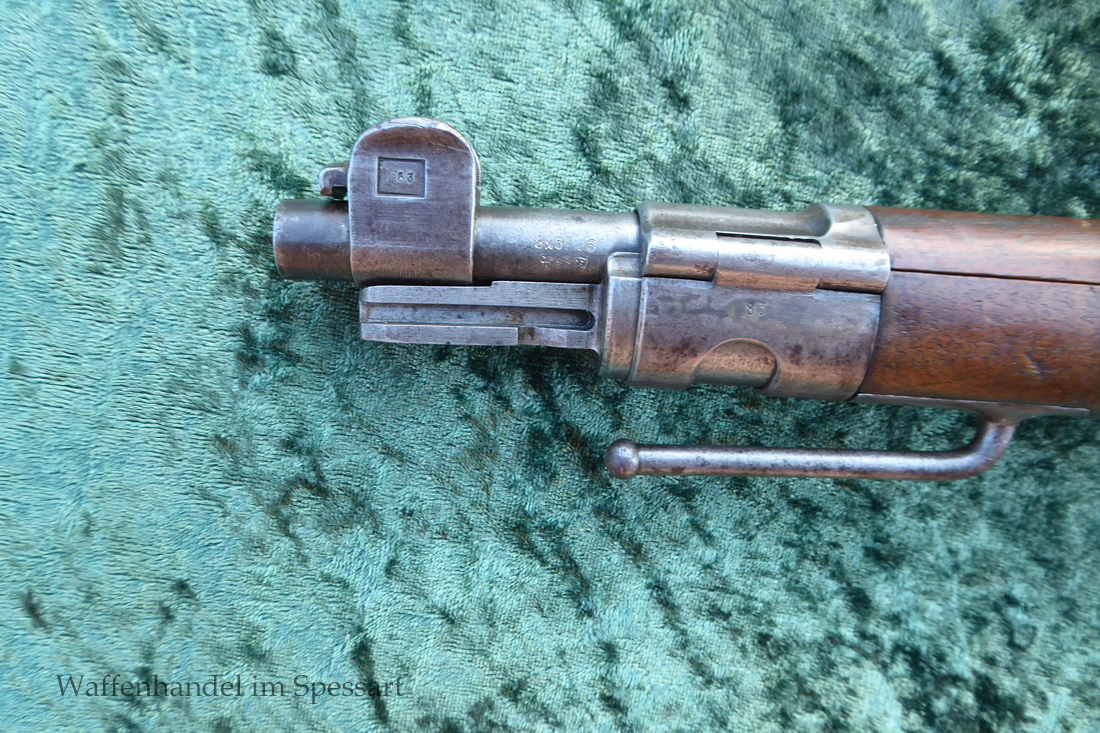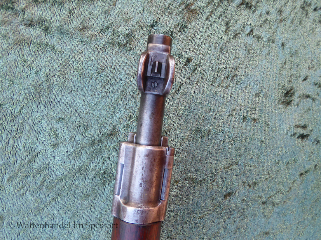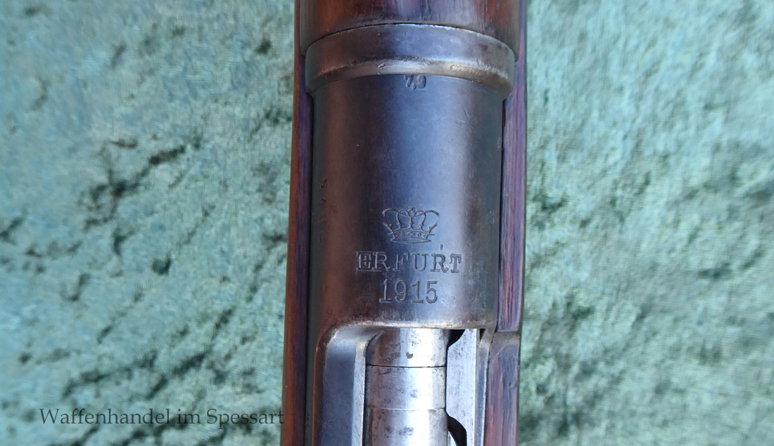 Hergestellt in der Gewehrfabrik in Erfurt 1915. Kal.8x57is. Ser.Nr.5483b. Nummerngleich. Das Laufinnere hat tiefe scharfkantige Felder und Züge. Es ist blank!!! Originale zum Teil abgegriffene Brünierung. Alle Schaftstempel deutlich erhalten.