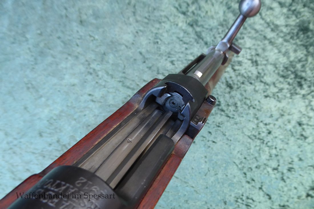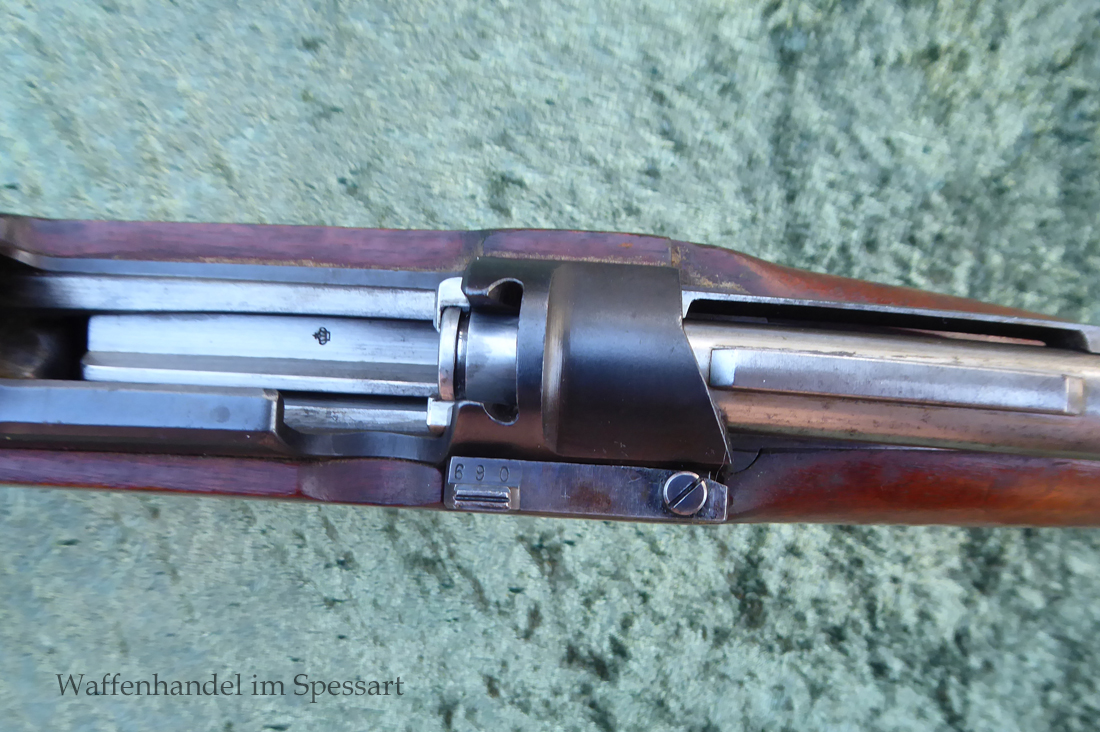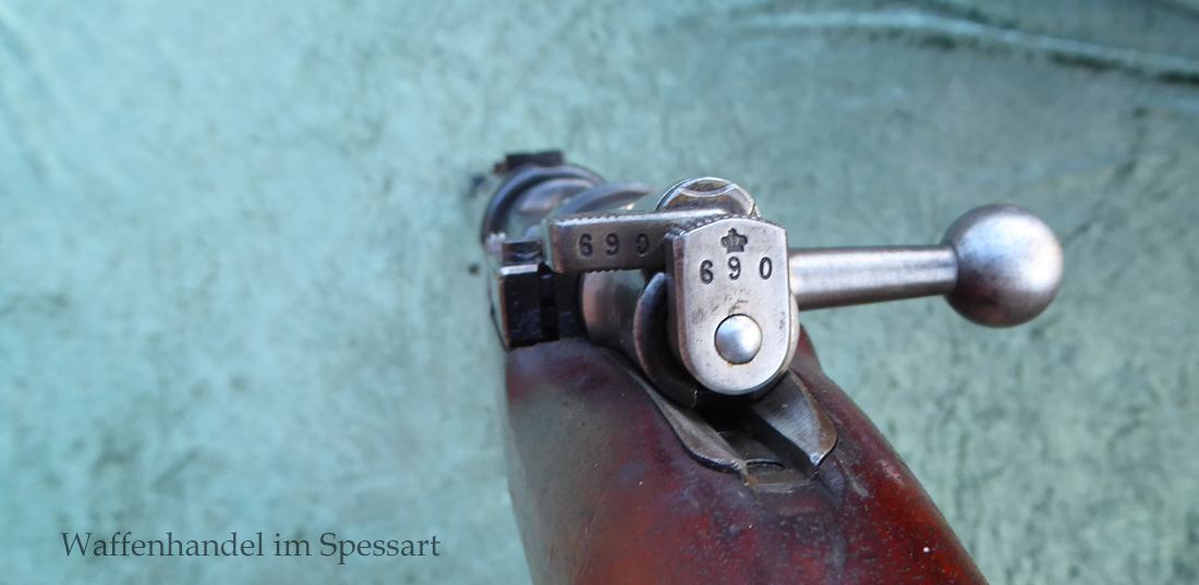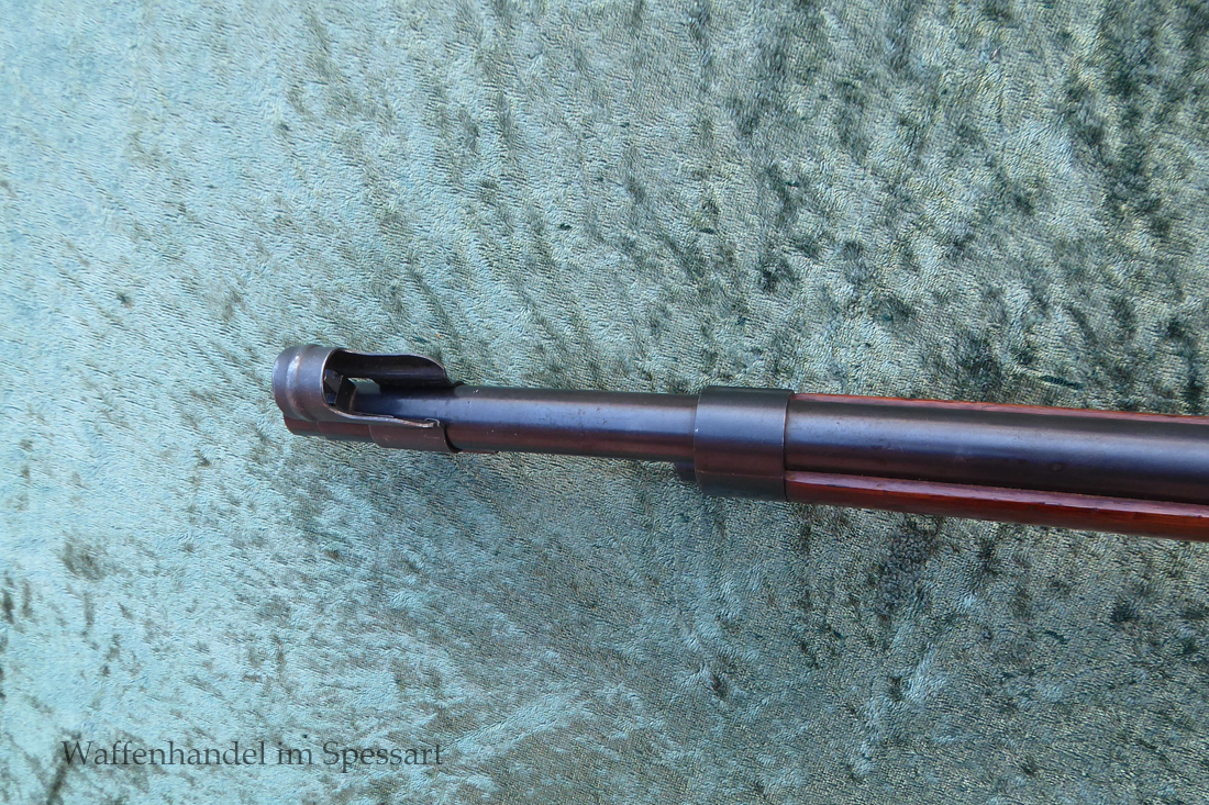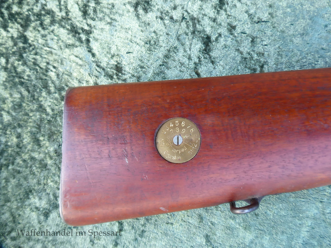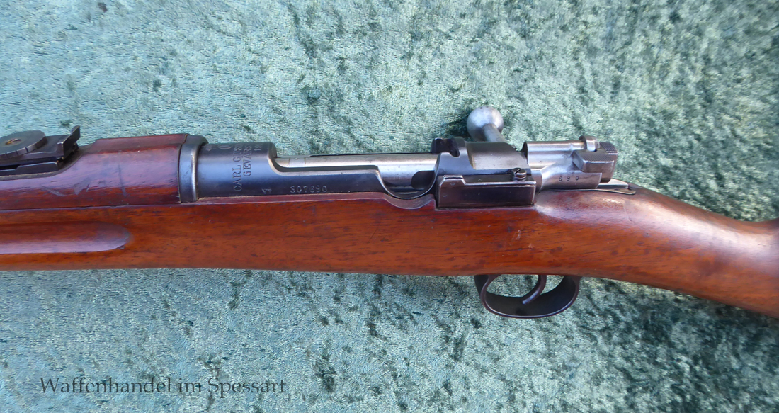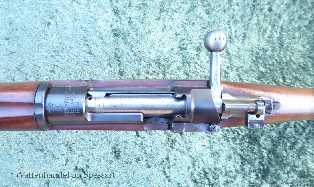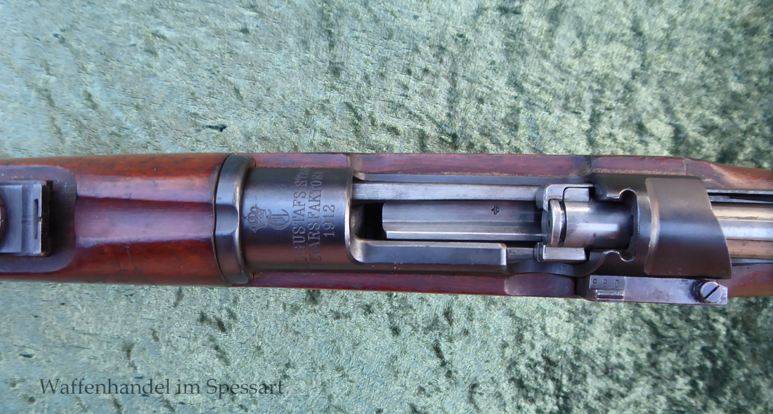 Hersteller Carl Gustafs Stads. Baujahr 1912. Kal.6,5x55Schwed. Ser.Nr. 307690. Nummerngleich. Scharfkantiges fast blankes Laufinnere. Orginale Brünierung. Deutliche tiefe Abnahmen im Schaft (keine der Arsenalüberholten Gewehre). Mit orig. darangwesenem Tunheden Feinvieiser.