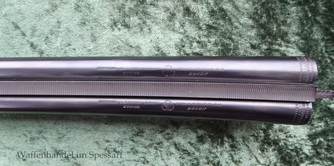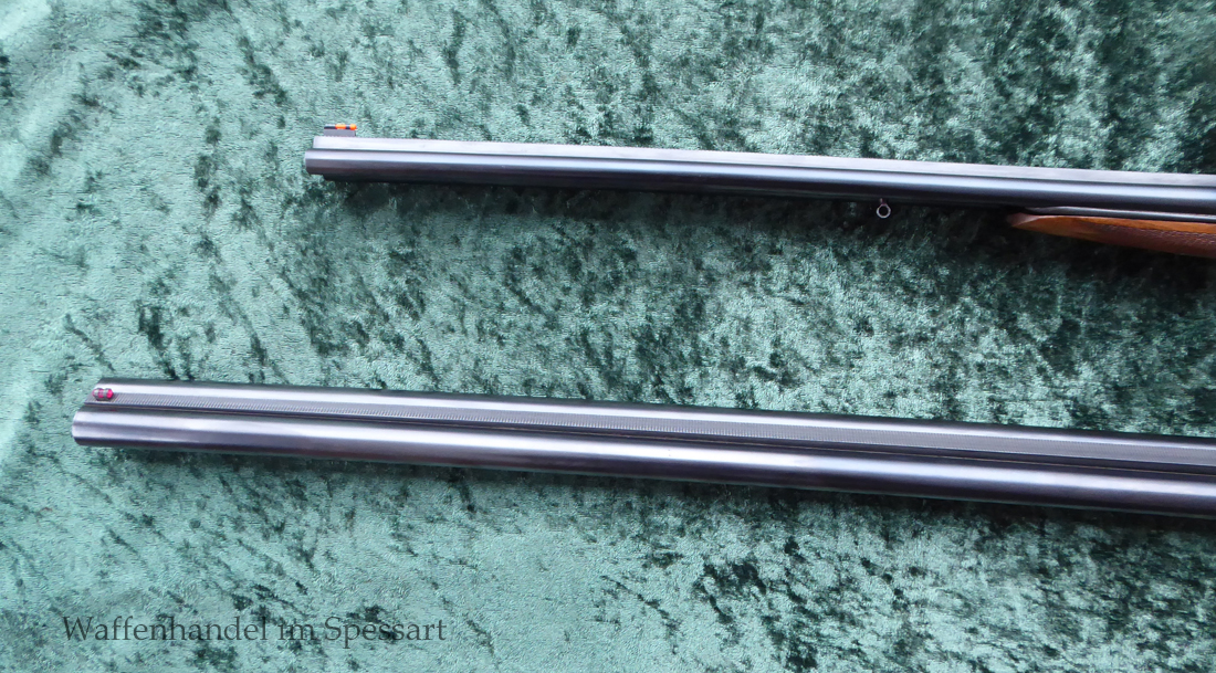 Der Doppelflinten Austauschlauf hat Kaliber 16/70. Ser.Nr. 526, Beschuß vom April 1948 in Suhl. Blanke Läufe. Länge 71 cm. Breite, sich nach vorne verjüngende, guillochierte Laufschiene mit rotem Fiberglaskorn.