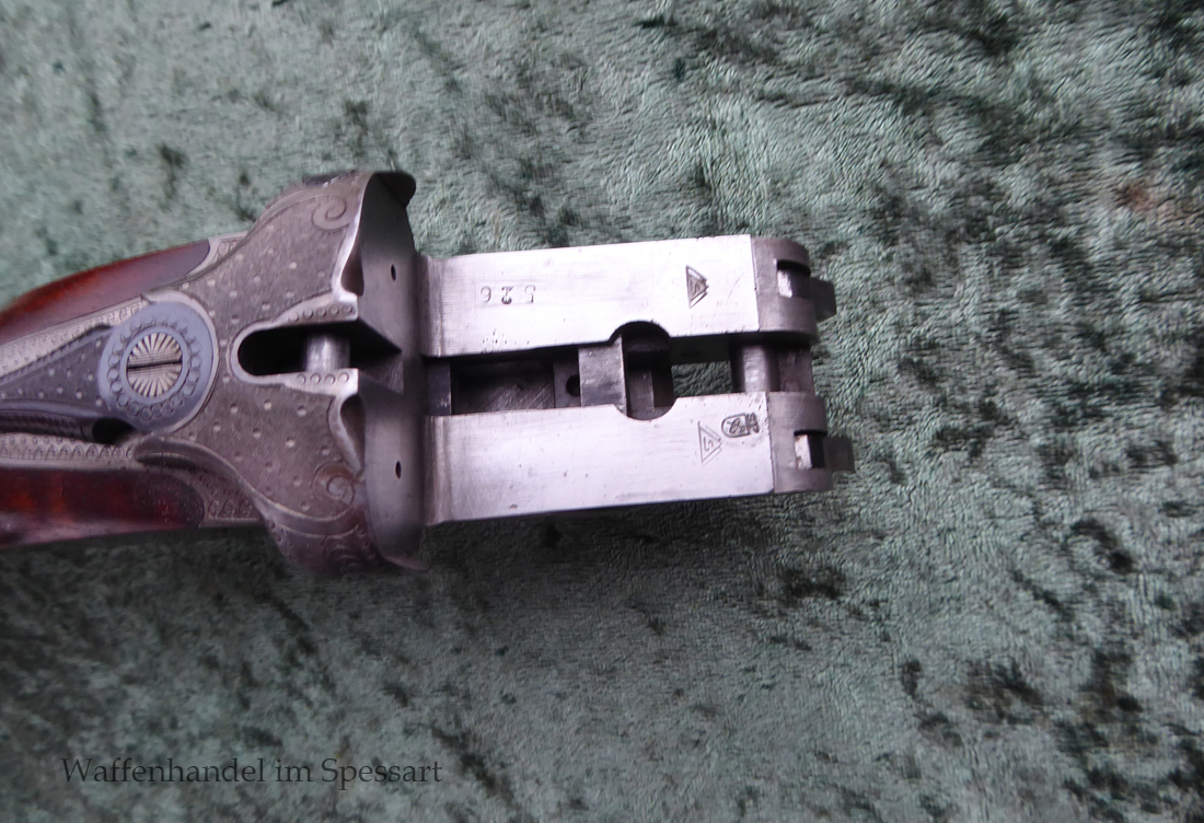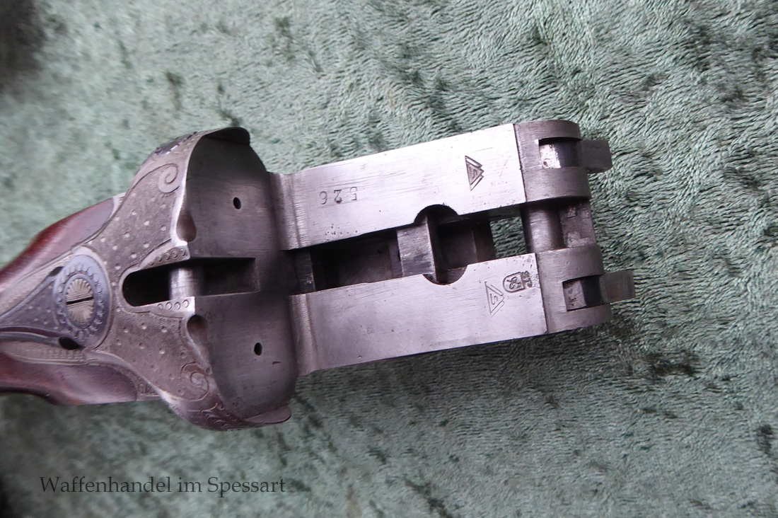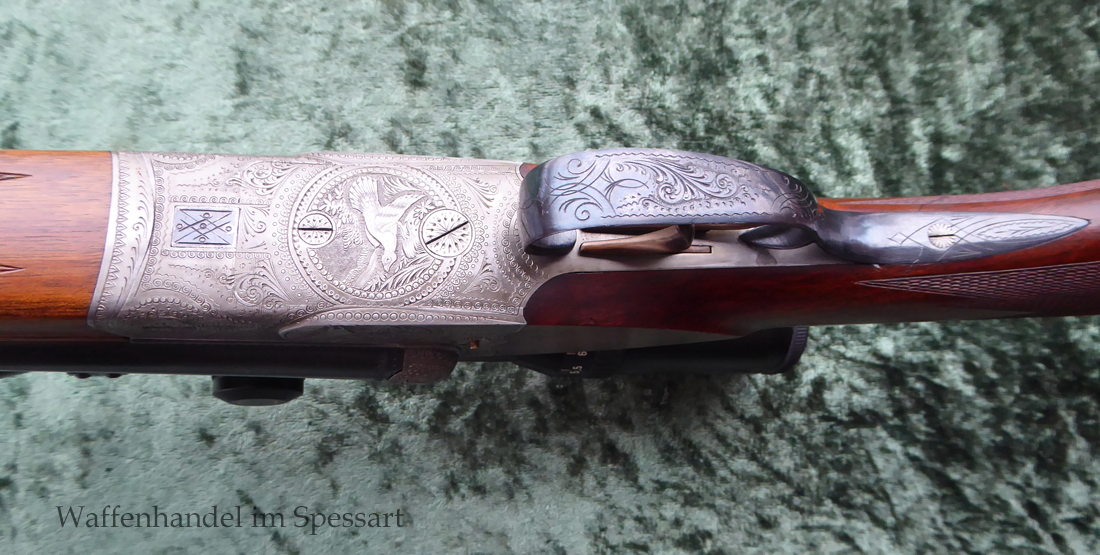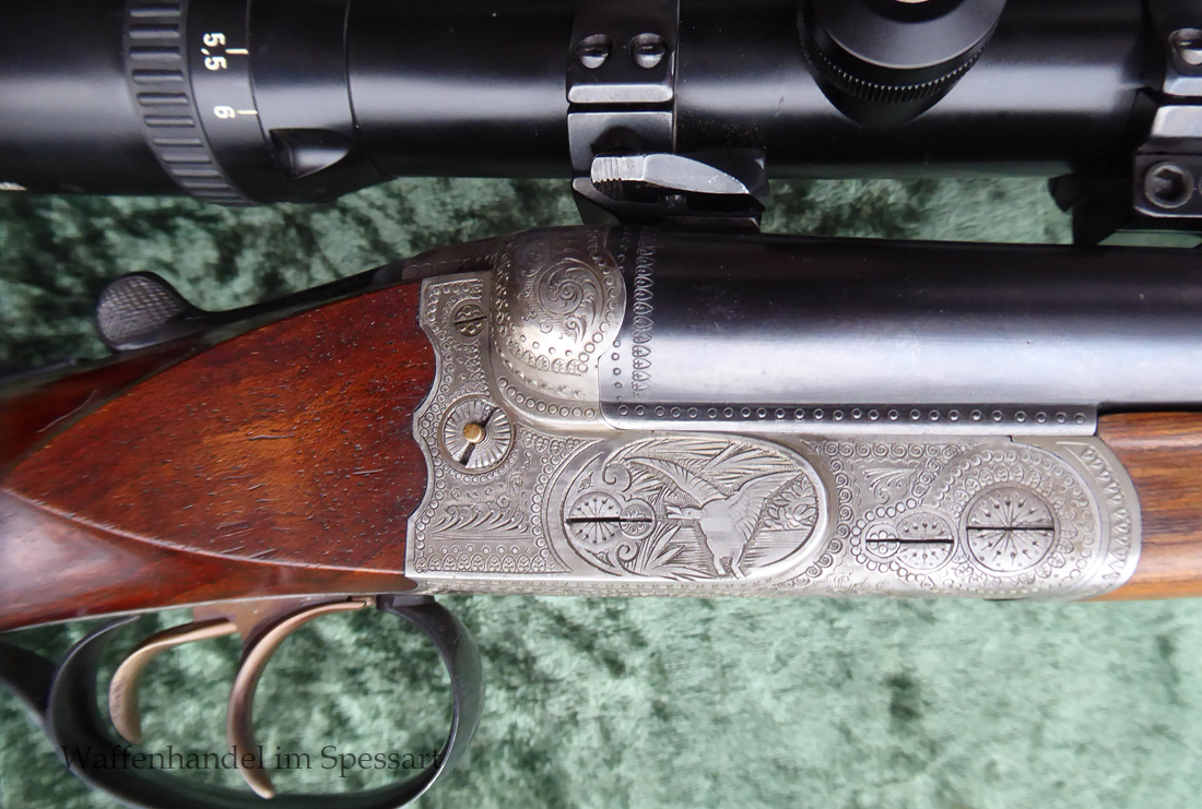 Kal. 8x57IRS, Kal. 16/70, Ser.Nr. 526, nummerngleich! Ansonsystem mit Signalstiften die anzeigen ob gespannt oder entspannt. Doppelte Laufhakenverriegelung mit einem Greener-Querriegel. Läufe aus Special Gewehrlaufstahl von Krupp Essen. Gültiger Beschuss aus 1948 aus Suhl. Stempel "S" Sonderklasse für ausgezeichnete Qualität. Guillochierte Laufschiene mit Standkimme und rotem Fiberglaskorn.Stahlbasküle mit flächendeckender Gravur. Rechts abstreichende Ente, links einfallende Ente.Auf dem Systemboden Auerhahn. Doppelabzug ohne Stecherfunktion. Schiebesicherung auf dem Kolbenhals. Schaft aus wertigem Nussbaummaserholz mit Pistolengriff und deutscher Backe. Schwarze Hornkappe als Schaftabschluss. Im Vorderschaft und am Kolbenhals seitlich Horneinlagen. ZF Schmidt und Bender 1,5-6 x 42, Abs. 4. Dieses ist mit einer Schwenkmontage montiert. Gesamtlänge Büchsflinte 103 cm. Lauflänge Büchsflinte 60cm. Schaftmaß 37,5cm. Gesamtlänge Flinte 114,5cm. Länge der Flintenläufe 72cm.