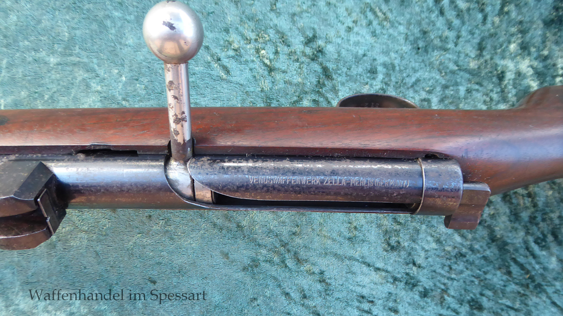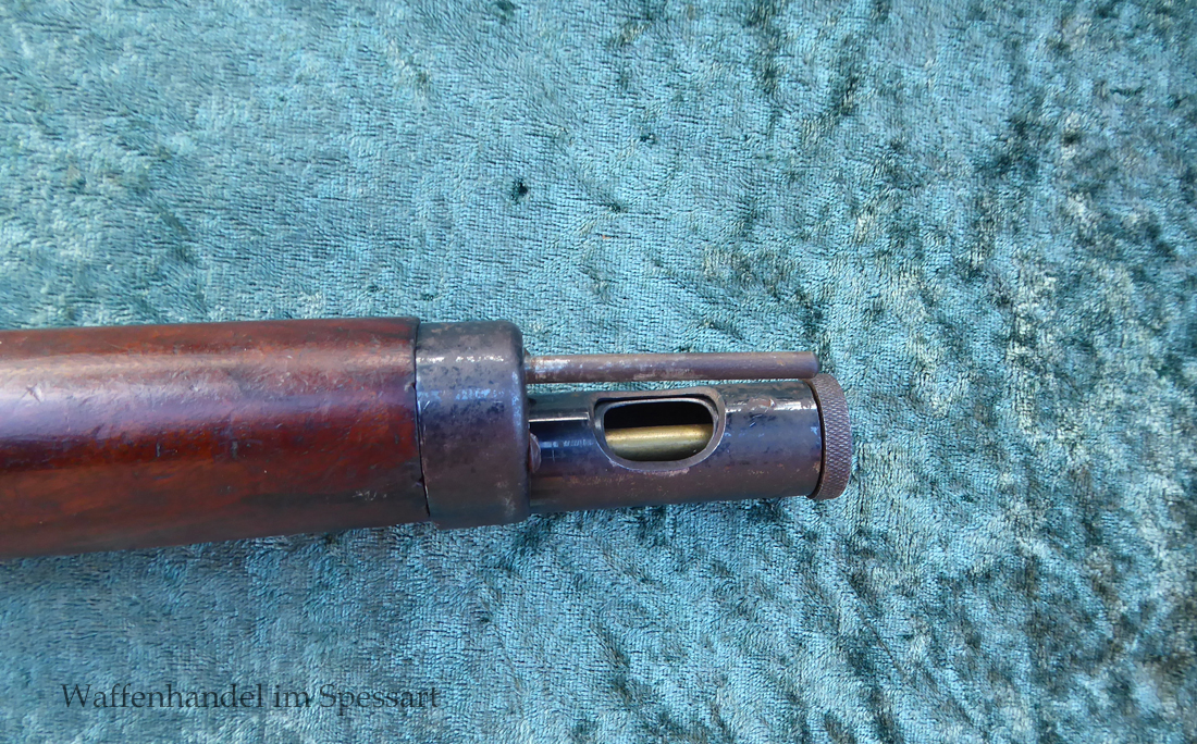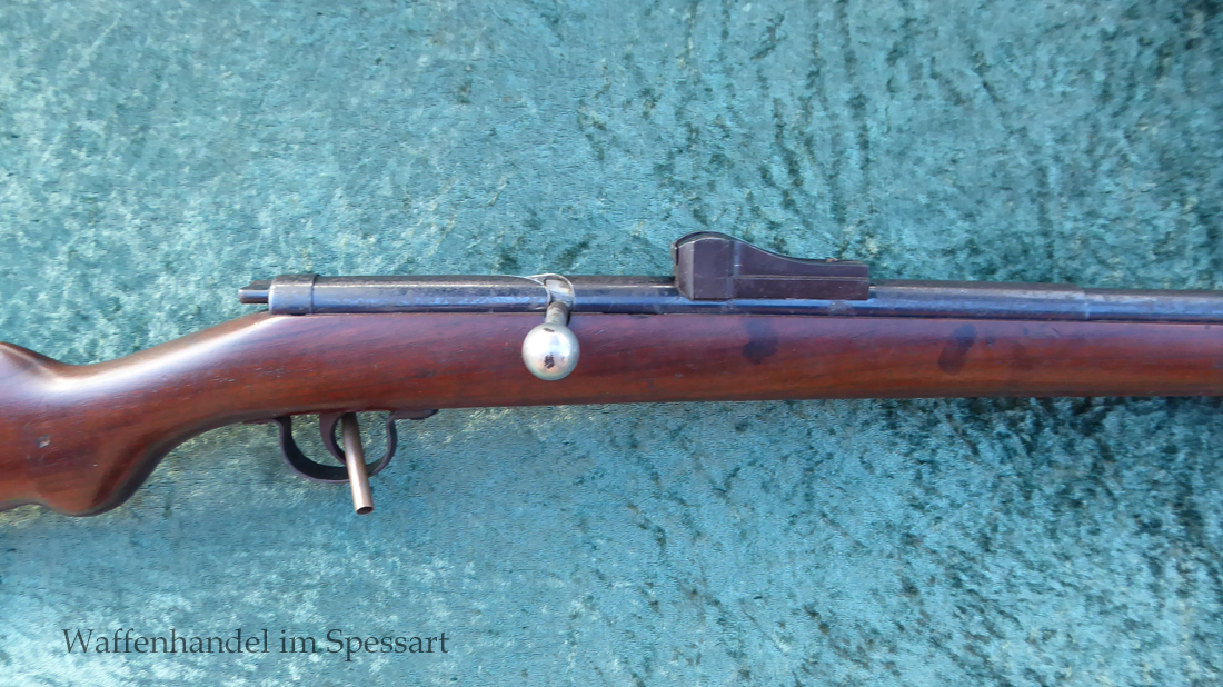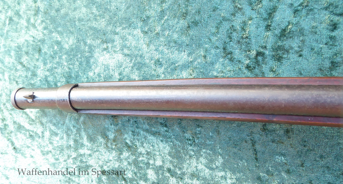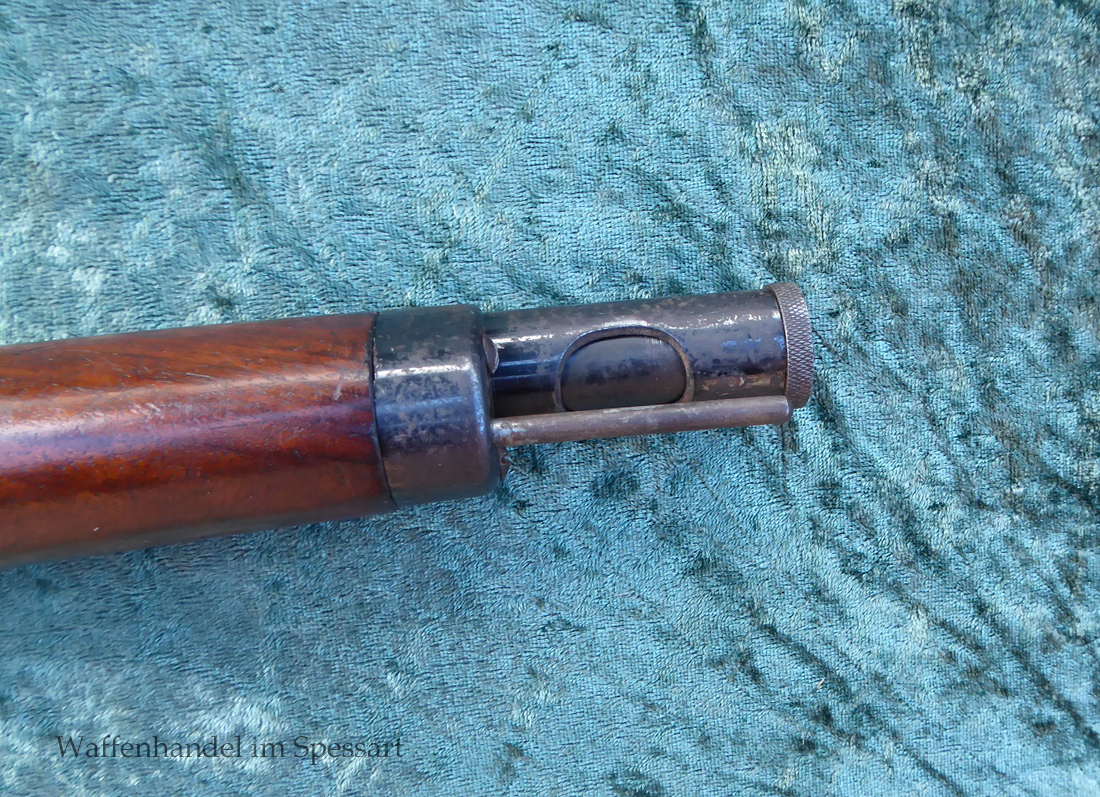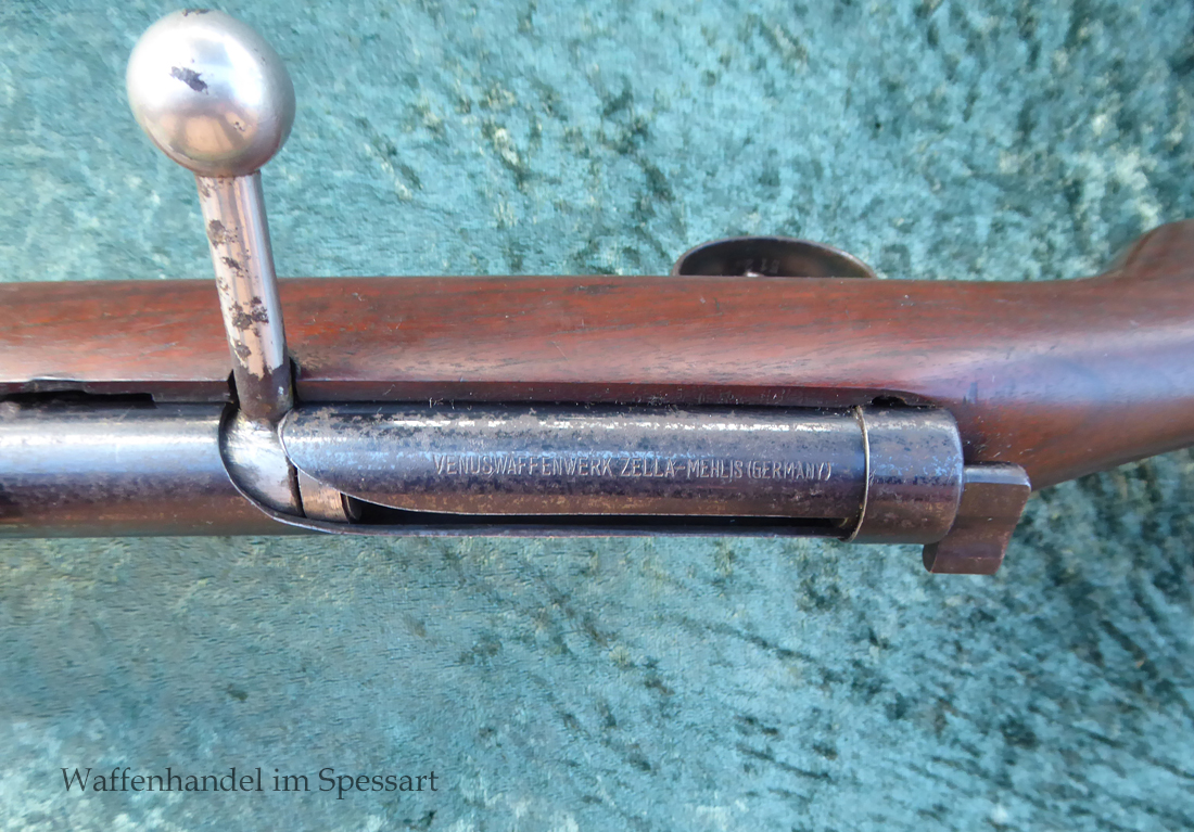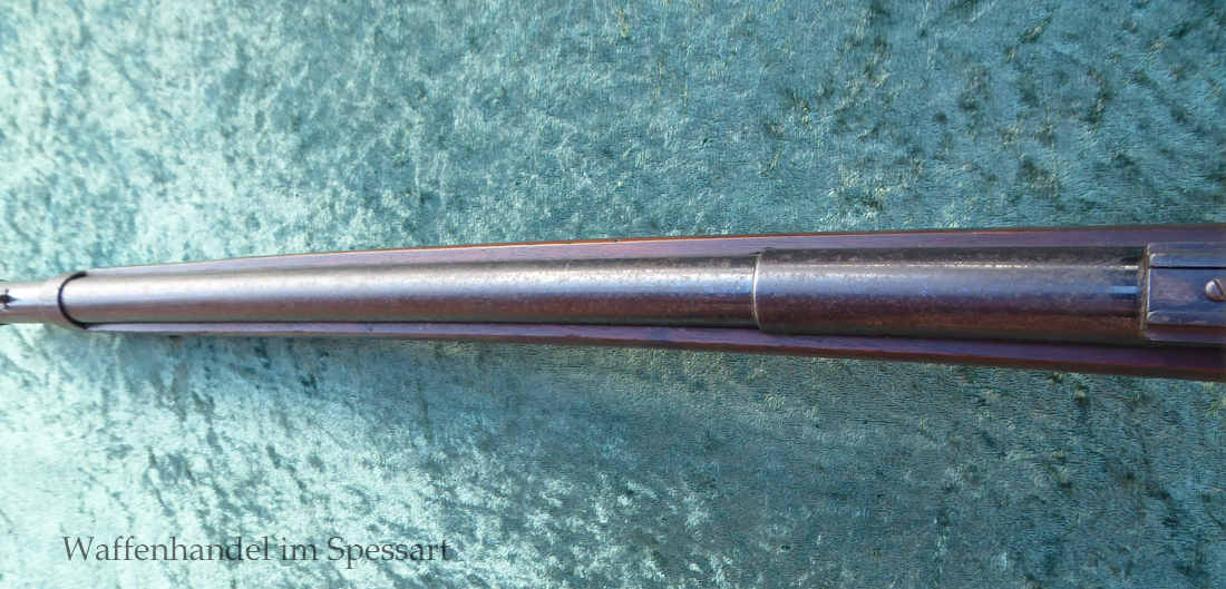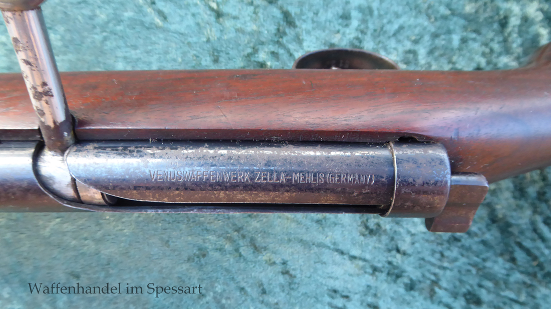 Hersteller Venus Waffenwerk Zella - Mehlis, Mod 1708, Kal.4,4mm Rundkugel. Sehr frühes Repetierluftgewehr im Art des Gewehr 98 mit einer Nachempfindung an das "hohe Visier" der Gewehres. Originale grieselige Brünierung. Das Magazin ist der Laufmantel, der vorne durch drehen unter der Laufmündung geöffnet und geschlossen werden kann. Inhalt 500 Kugeln! Repetiersystem mit guter strammer Feder. Dichtung schwächer.
