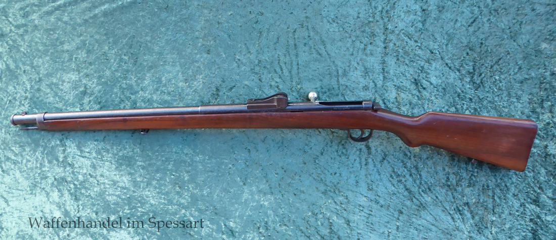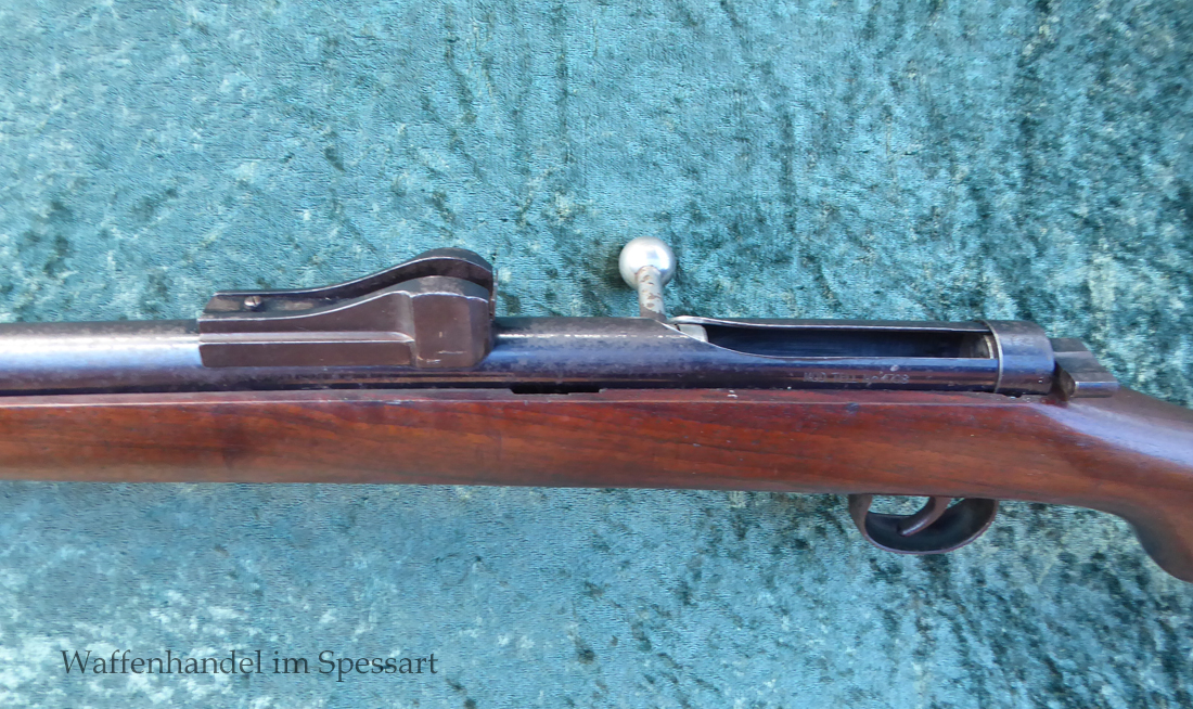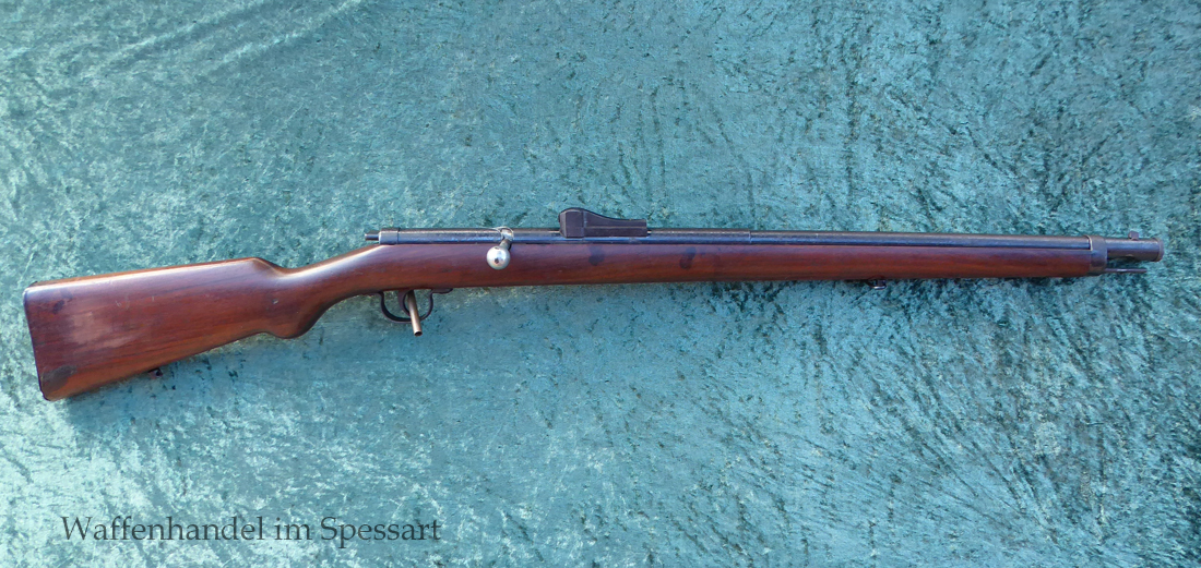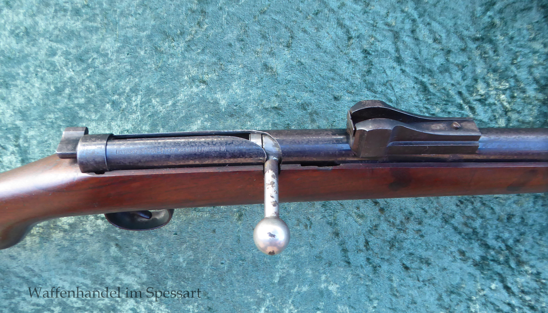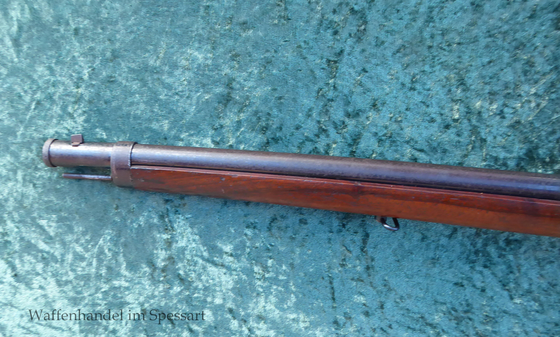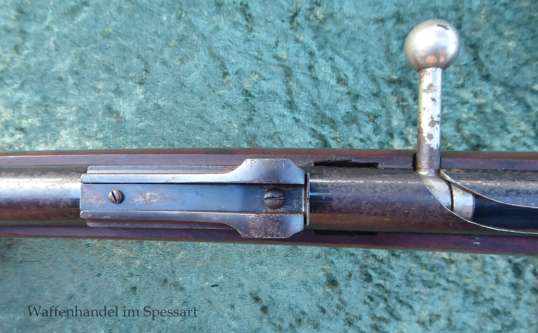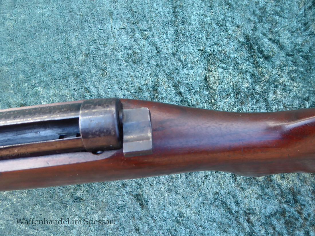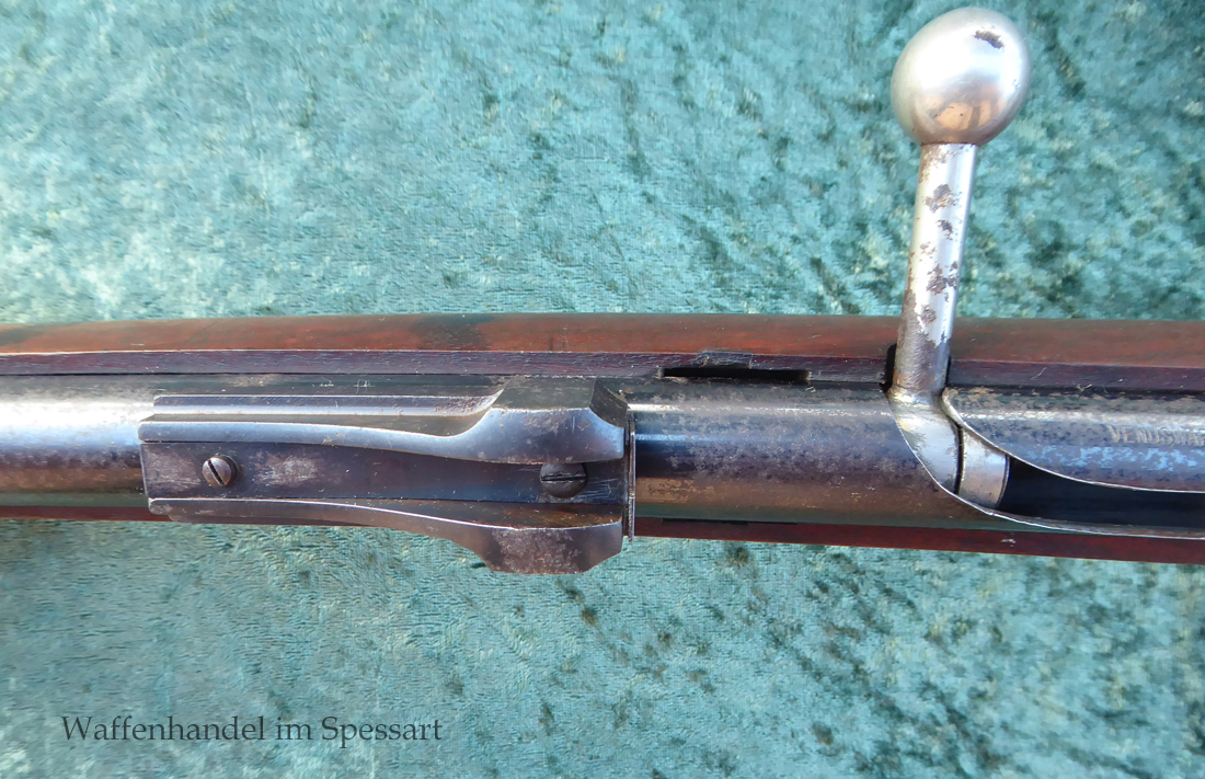 Hersteller Venus Waffenwerk Zella - Mehlis, Mod 1708, Kal.4,4mm Rundkugel. Sehr frühes Repetierluftgewehr im Art des Gewehr 98 mit einer Nachempfindung an das "hohe Visier" der Gewehres. Originale grieselige Brünierung. Das Magazin ist der Laufmantel, der vorne durch drehen unter der Laufmündung geöffnet und geschlossen werden kann. Inhalt 500 Kugeln! Repetiersystem mit guter strammer Feder. Dichtung schwächer.