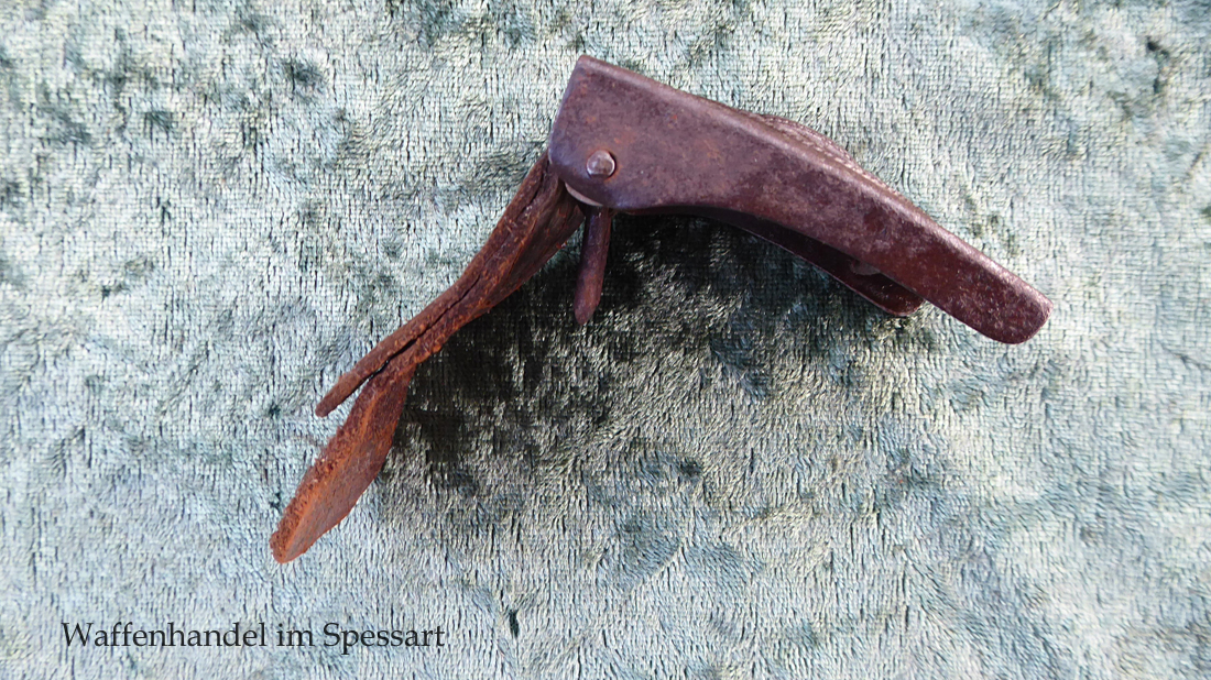 Aus Stahl / Eisen. Mit Lederzunge. Diese mit Hersteller (undeutlich) von 1916. Unberührter Dachbodenfund mit Patina und Flugrost.
