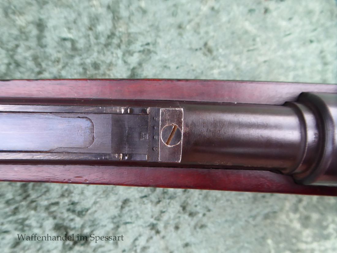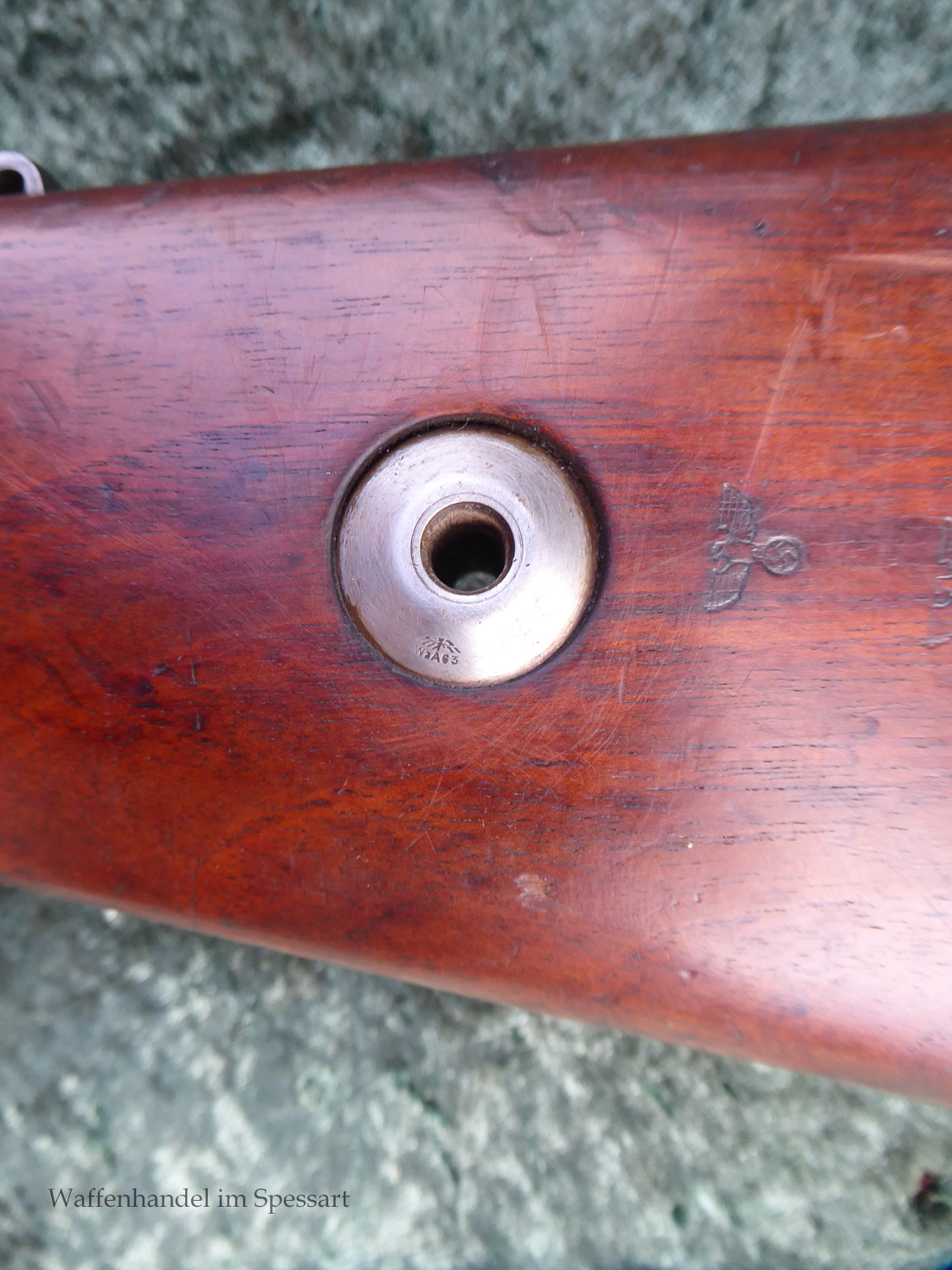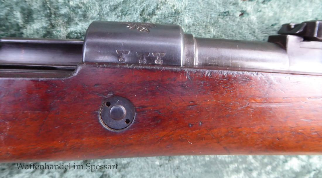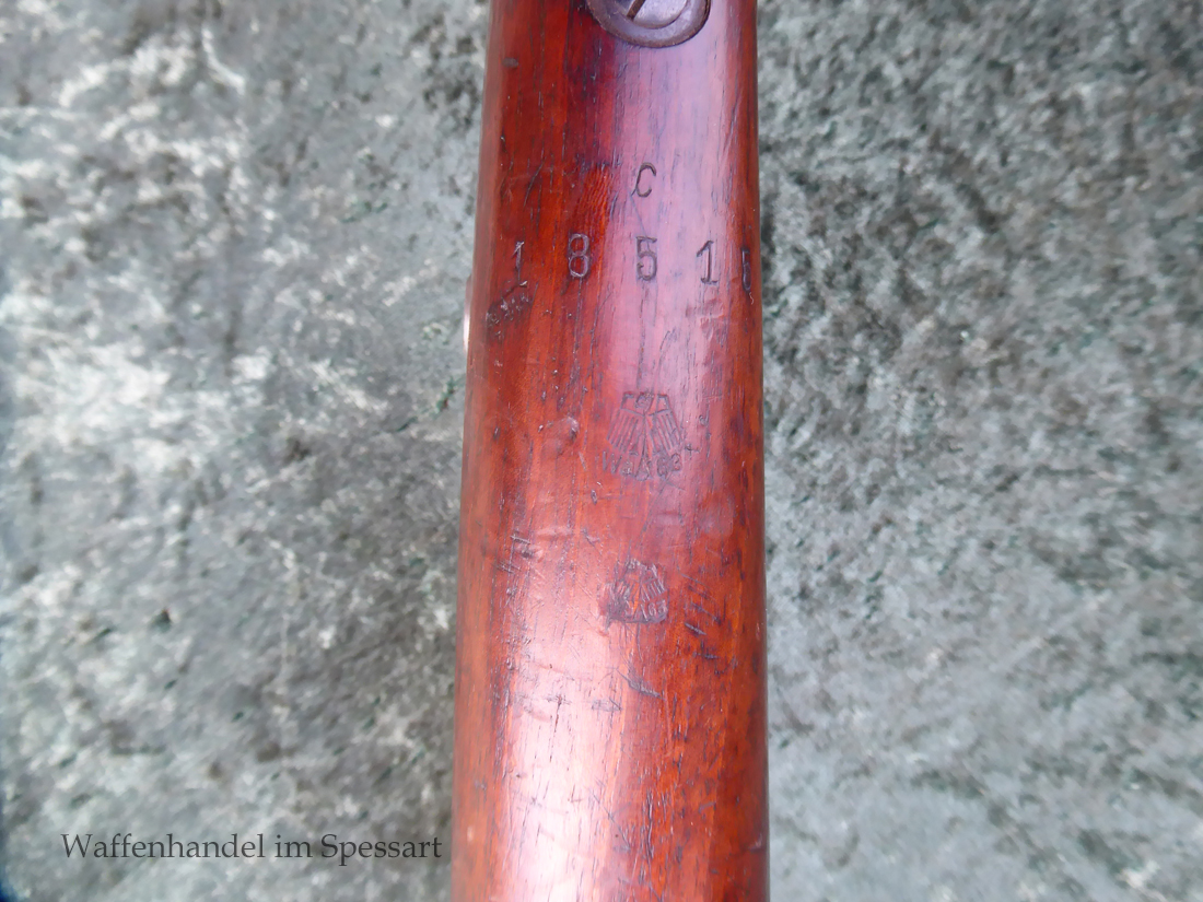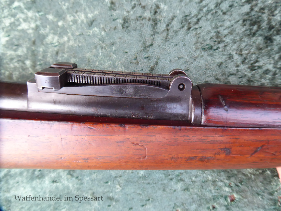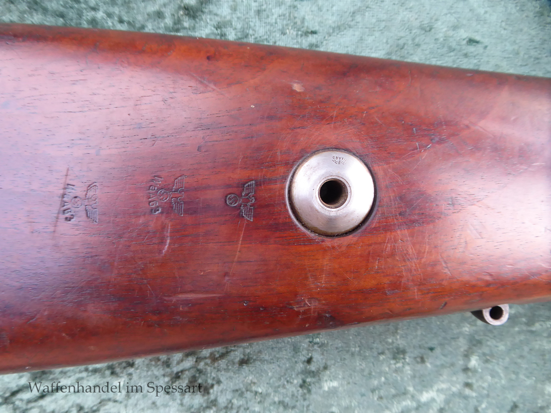 Hersteller Mauser Oberndorf. Kal.8x57is. Ser.Nr. C18515. Nummerngleich. Mit nummerngleichem Bajonett. Das Laufinnere hat scharfkantige Felder und Züge und ist blank. Gute und schöne originale Brünierung mit Spuren des Gebrauches. Der Nußbaum Schaft mit geringen Gebrauchspuren und allen tief erhaltenen Abnahmen. Durch die frühe Fertigung für Portugal bedingt haben alle Teile die Abnahme Waa 63. Diese Serie hat original ein Balkenkorn und eine Kimme mit U Ausschnitt für besseres Zielen!