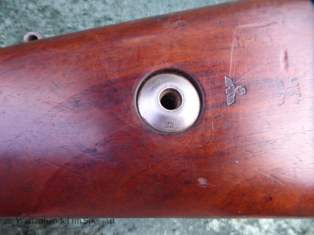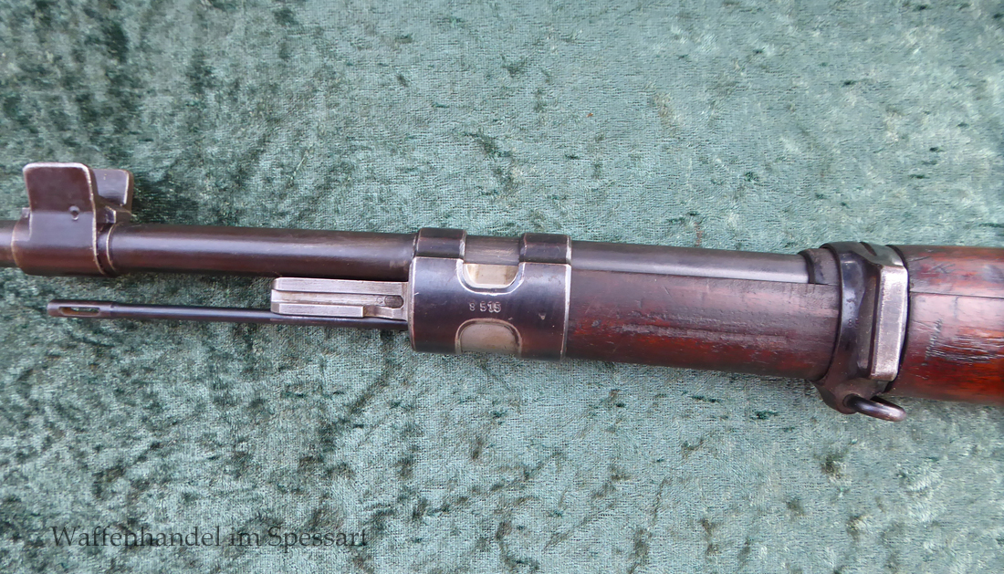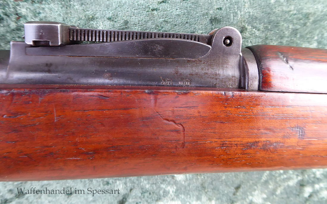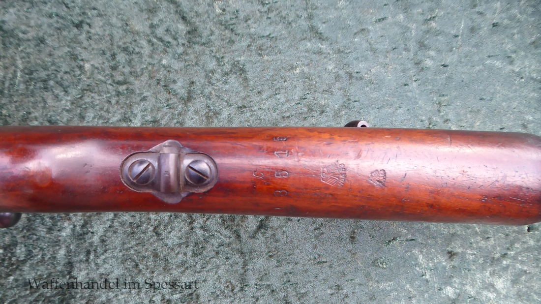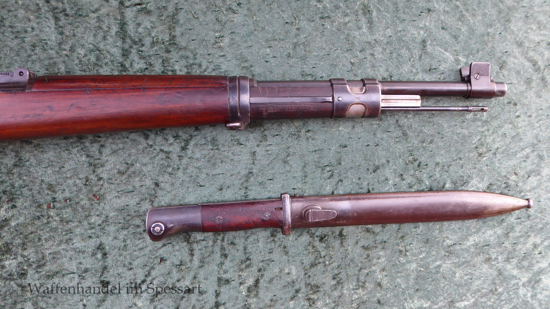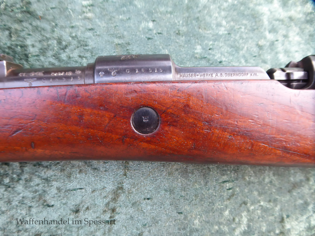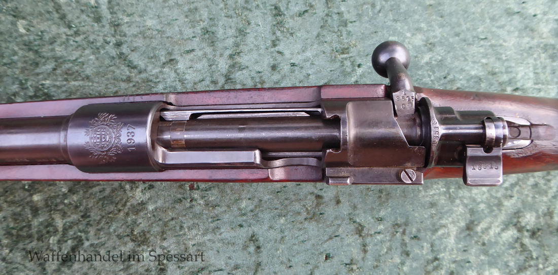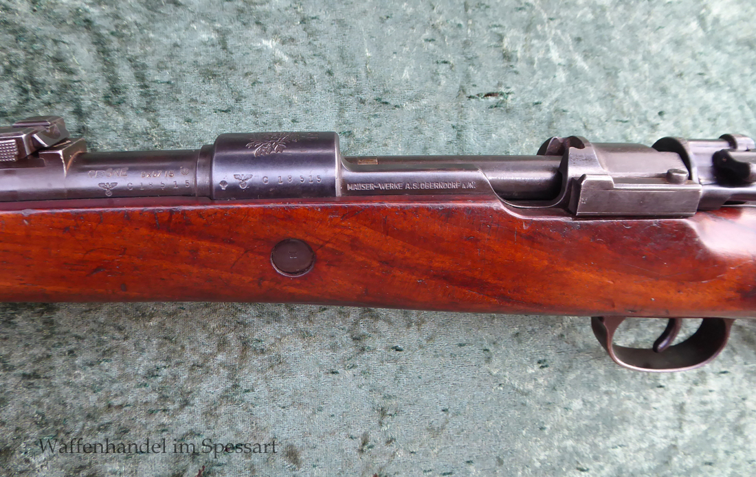 Hersteller Mauser Oberndorf. Kal.8x57is. Ser.Nr. C18515. Nummerngleich. Mit nummerngleichem Bajonett. Das Laufinnere hat scharfkantige Felder und Züge und ist blank. Gute und schöne originale Brünierung mit Spuren des Gebrauches. Der Nußbaum Schaft mit geringen Gebrauchspuren und allen tief erhaltenen Abnahmen. Durch die frühe Fertigung für Portugal bedingt haben alle Teile die Abnahme Waa 63. Diese Serie hat original ein Balkenkorn und eine Kimme mit U Ausschnitt für besseres Zielen!