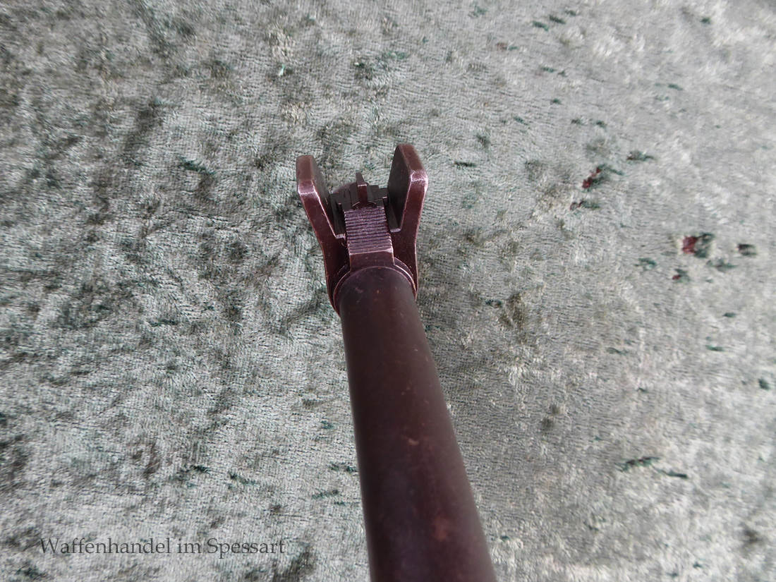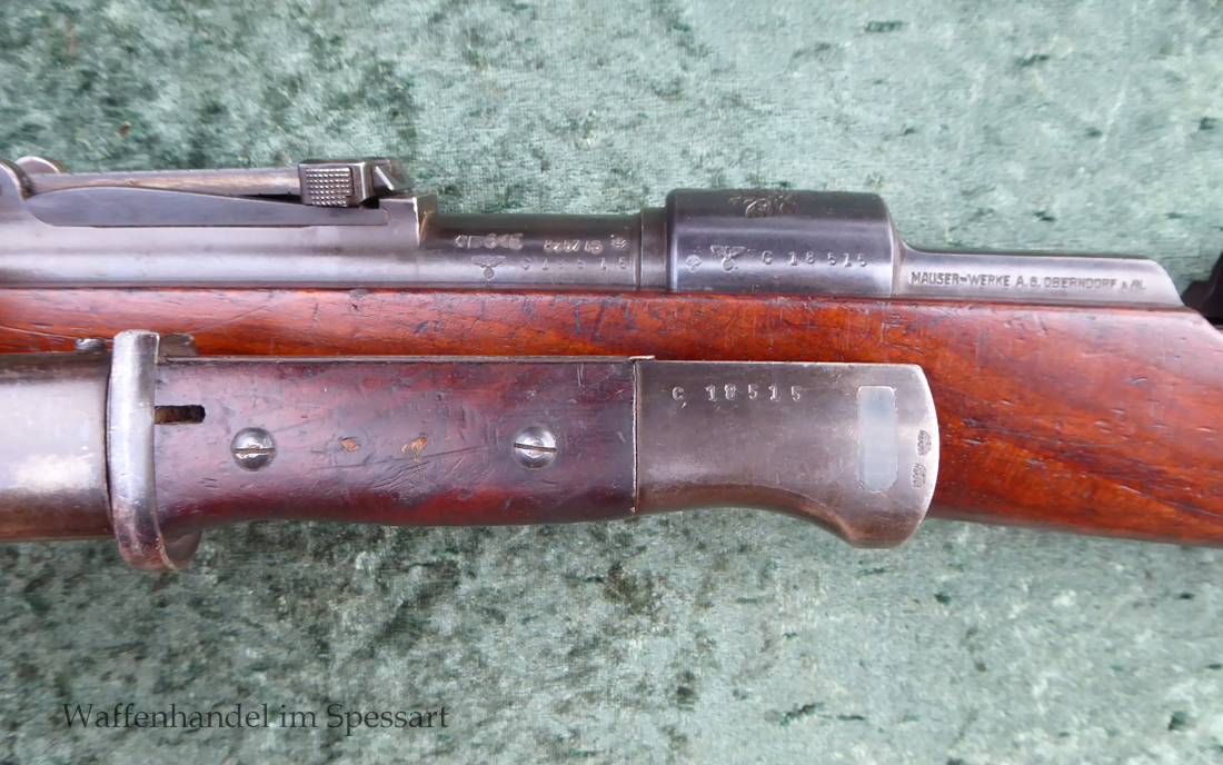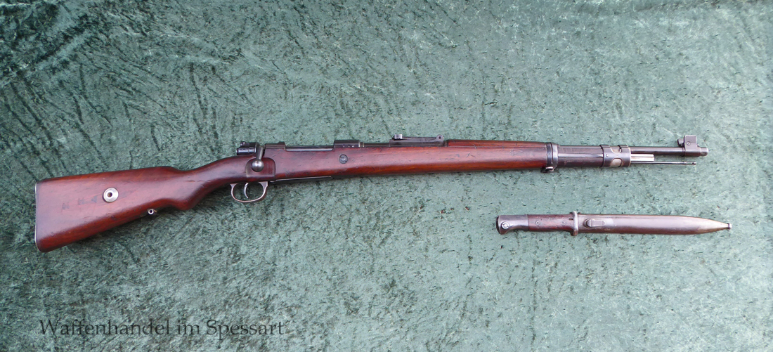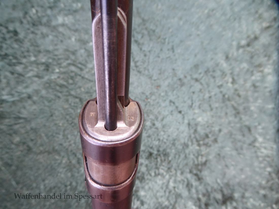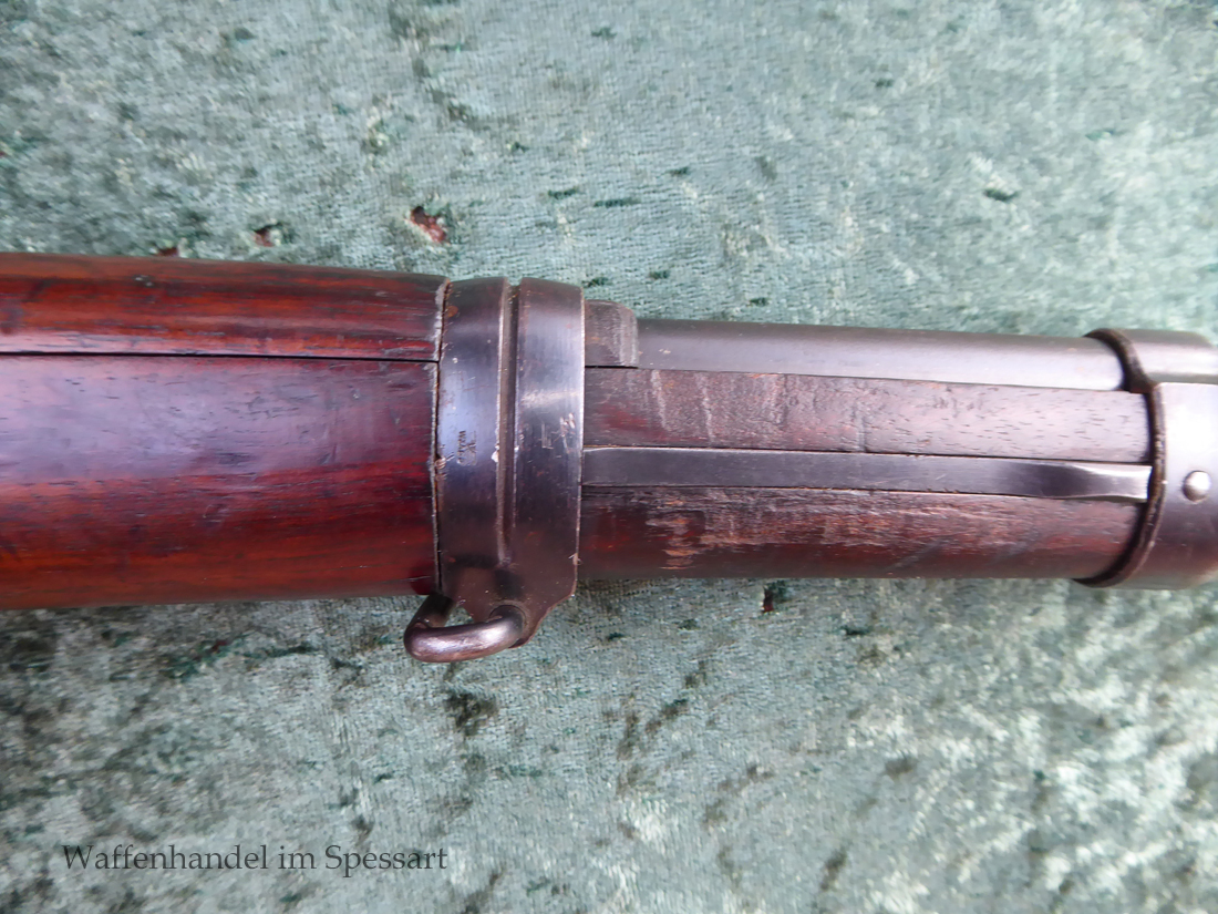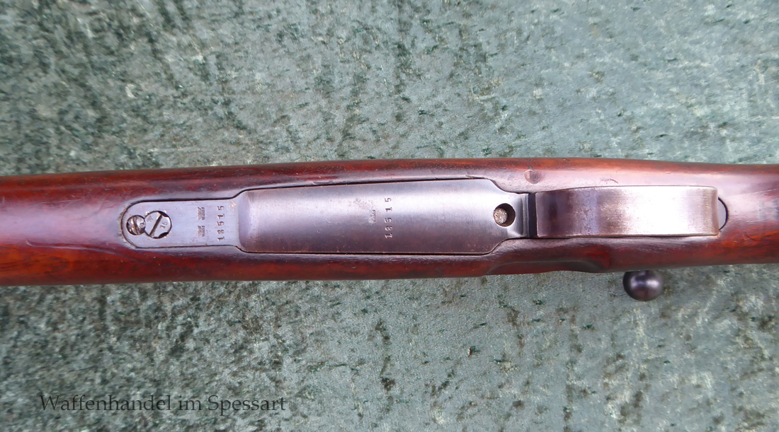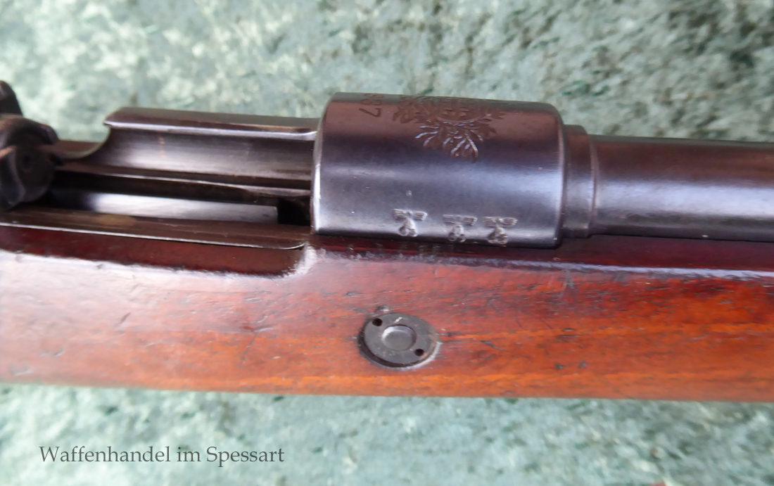 Hersteller Mauser Oberndorf. Kal.8x57is. Ser.Nr. C18515. Nummerngleich. Mit nummerngleichem Bajonett. Das Laufinnere hat scharfkantige Felder und Züge und ist blank. Gute und schöne originale Brünierung mit Spuren des Gebrauches. Der Nußbaum Schaft mit geringen Gebrauchspuren und allen tief erhaltenen Abnahmen. Durch die frühe Fertigung für Portugal bedingt haben alle Teile die Abnahme Waa 63. Diese Serie hat original ein Balkenkorn und eine Kimme mit U Ausschnitt für besseres Zielen!