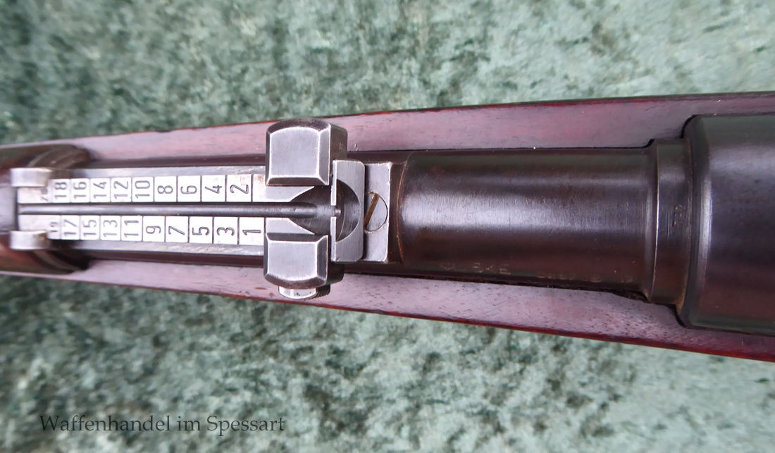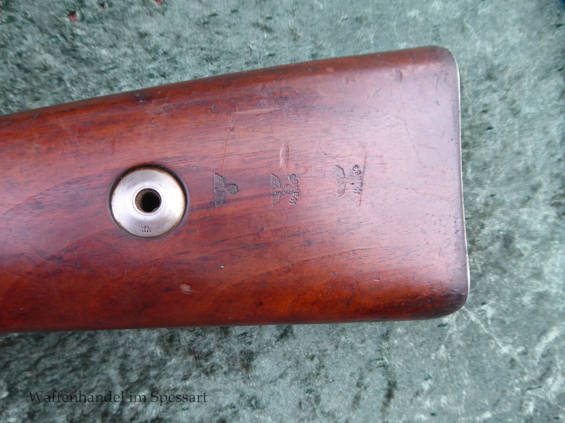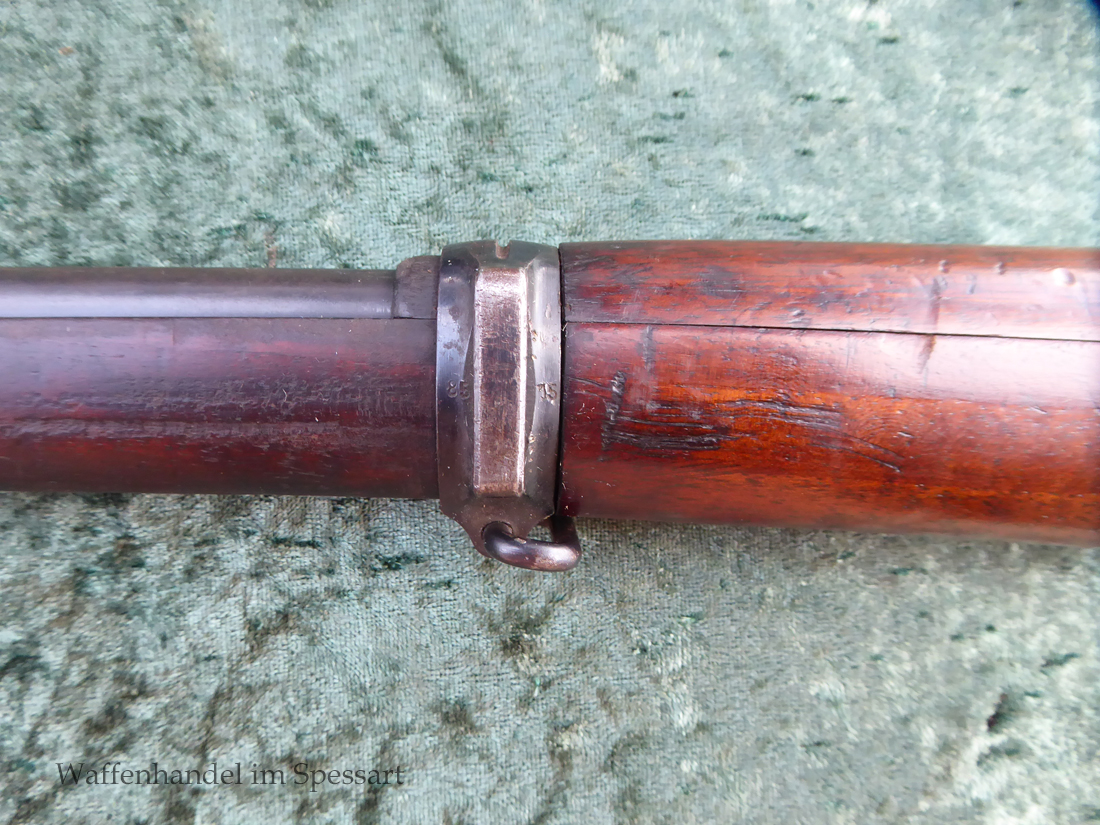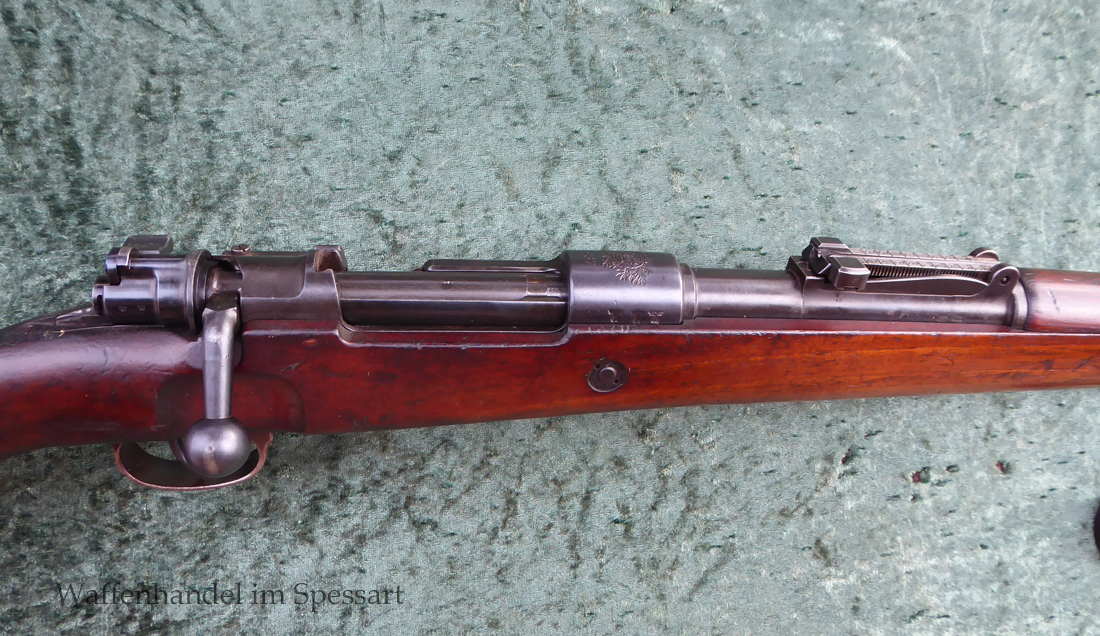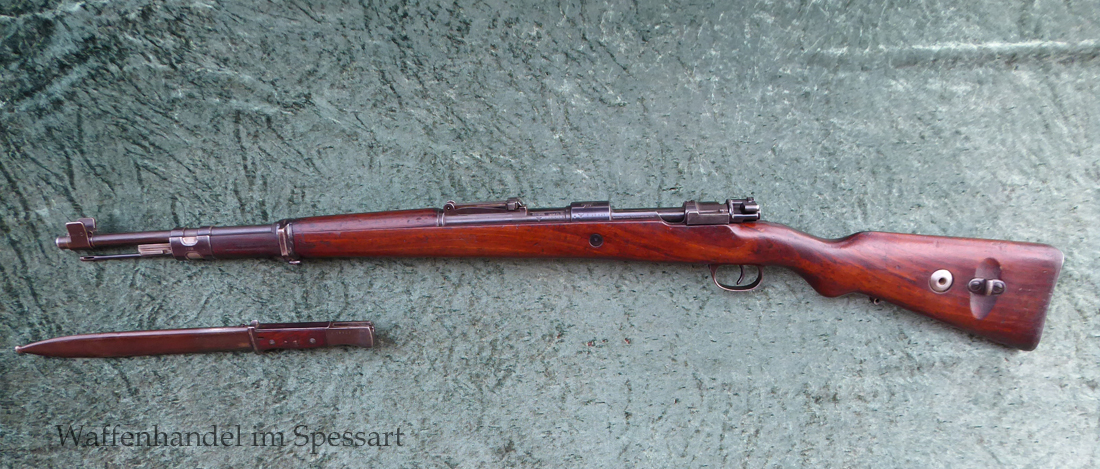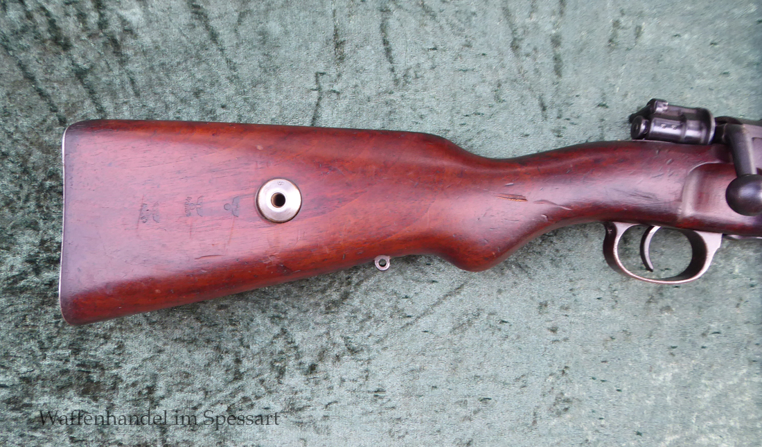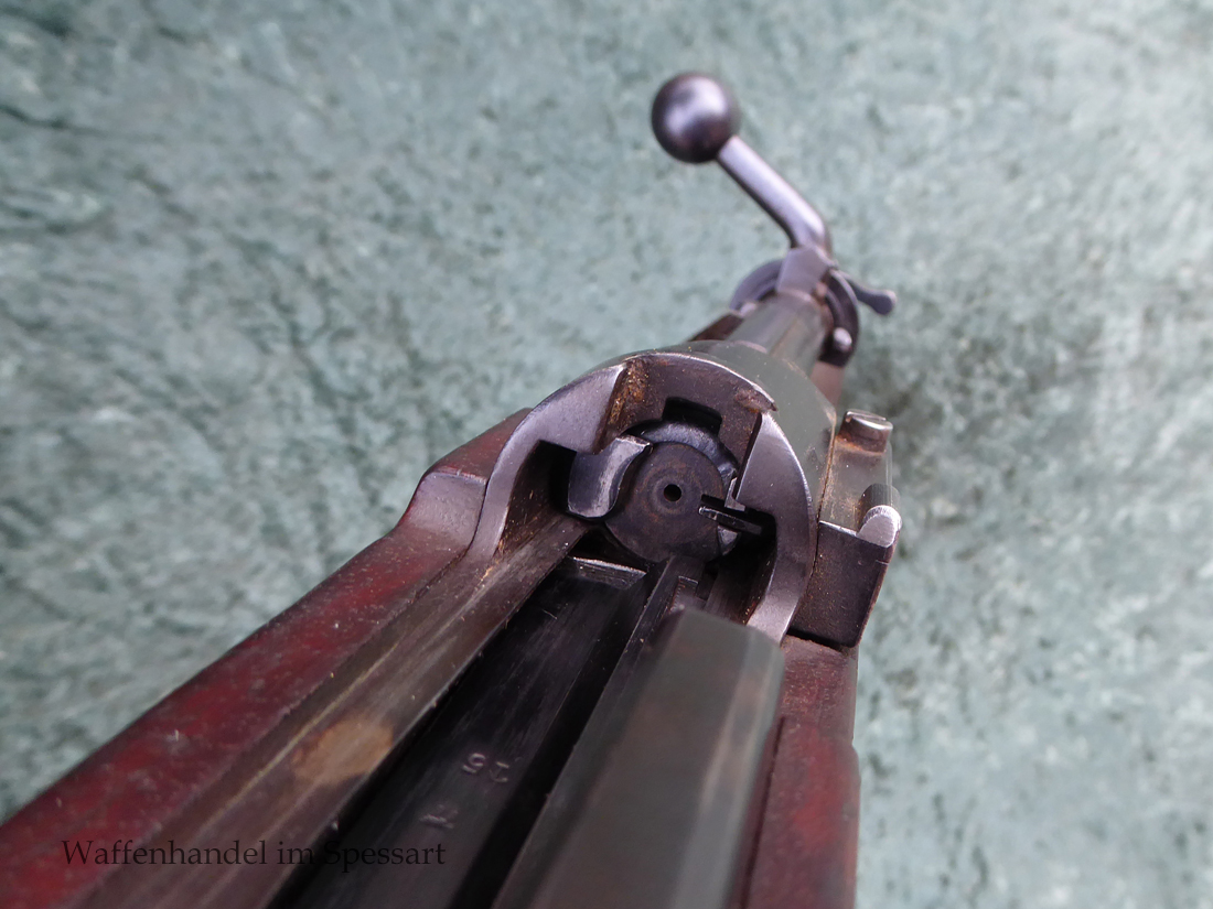 Hersteller Mauser Oberndorf. Kal.8x57is. Ser.Nr. C18515. Nummerngleich. Mit nummerngleichem Bajonett. Das Laufinnere hat scharfkantige Felder und Züge und ist blank. Gute und schöne originale Brünierung mit Spuren des Gebrauches. Der Nußbaum Schaft mit geringen Gebrauchspuren und allen tief erhaltenen Abnahmen. Durch die frühe Fertigung für Portugal bedingt haben alle Teile die Abnahme Waa 63. Diese Serie hat original ein Balkenkorn und eine Kimme mit U Ausschnitt für besseres Zielen!
