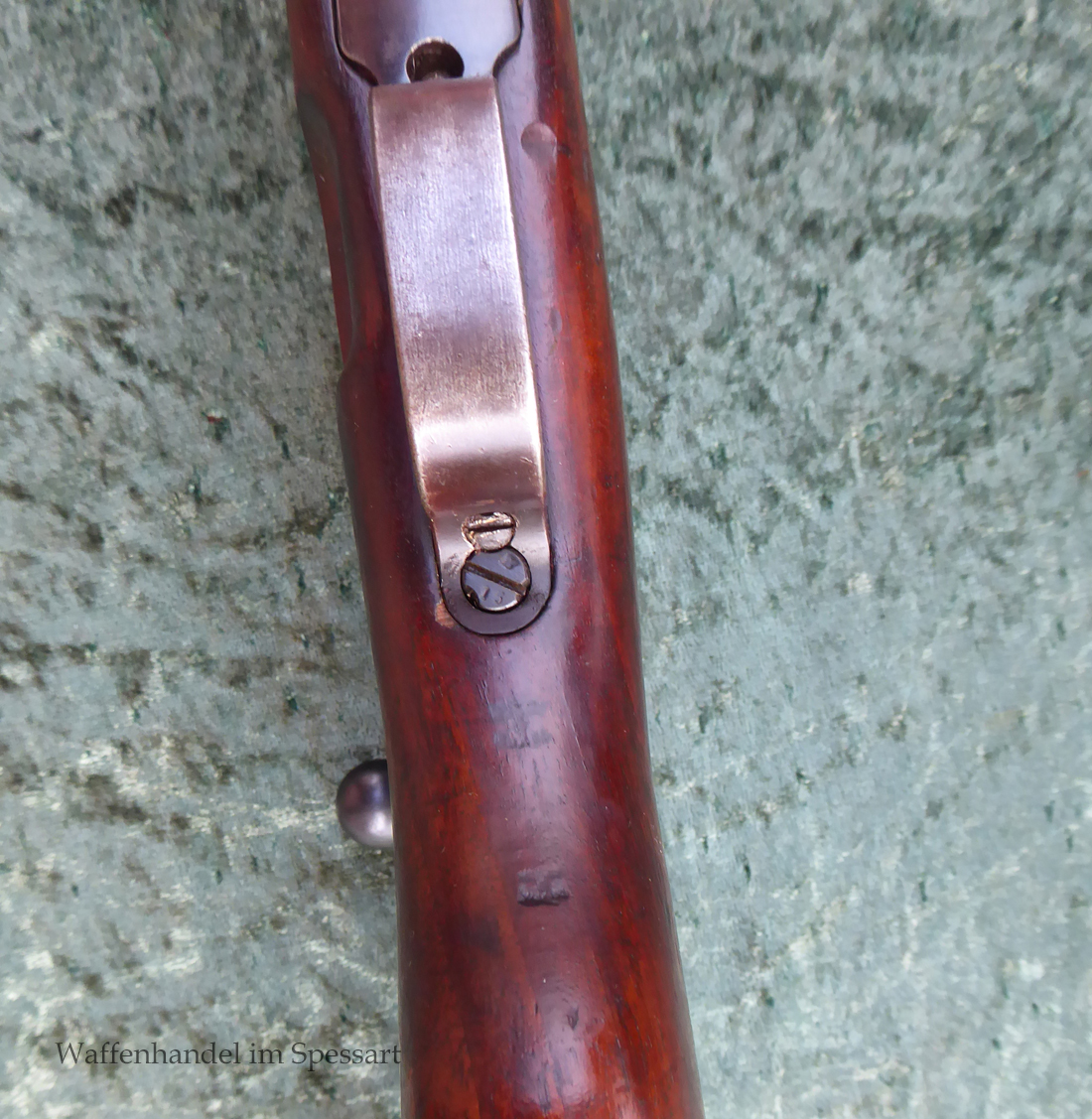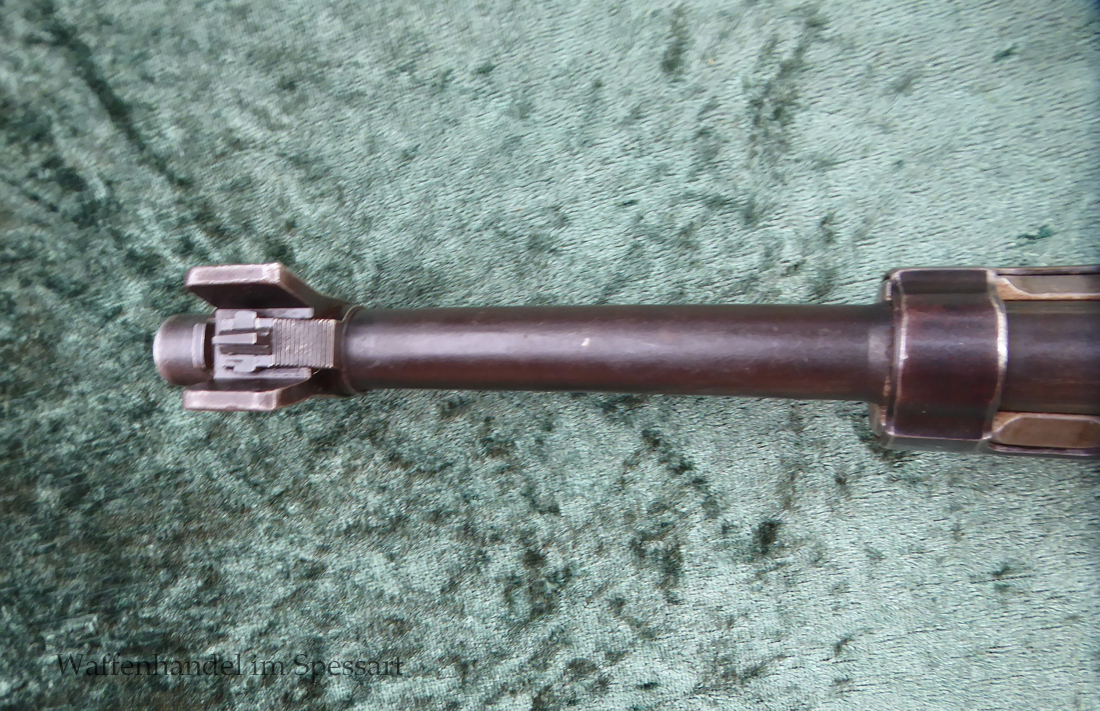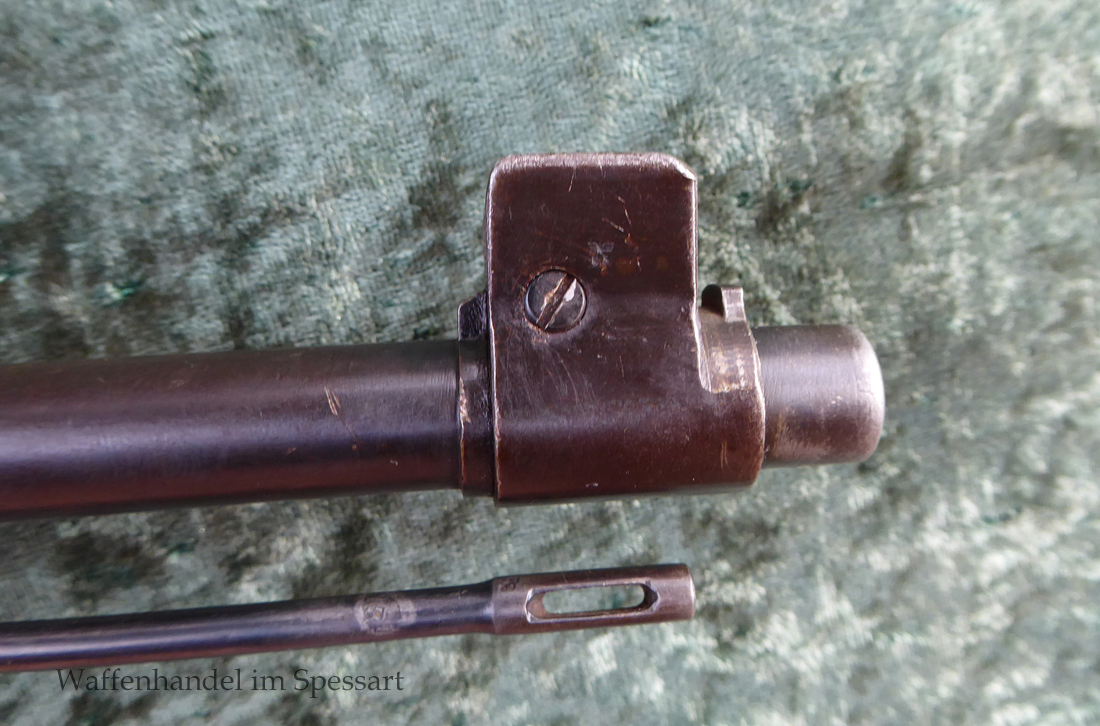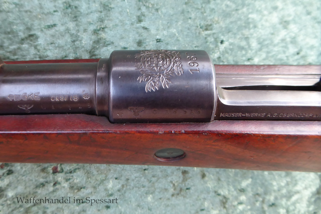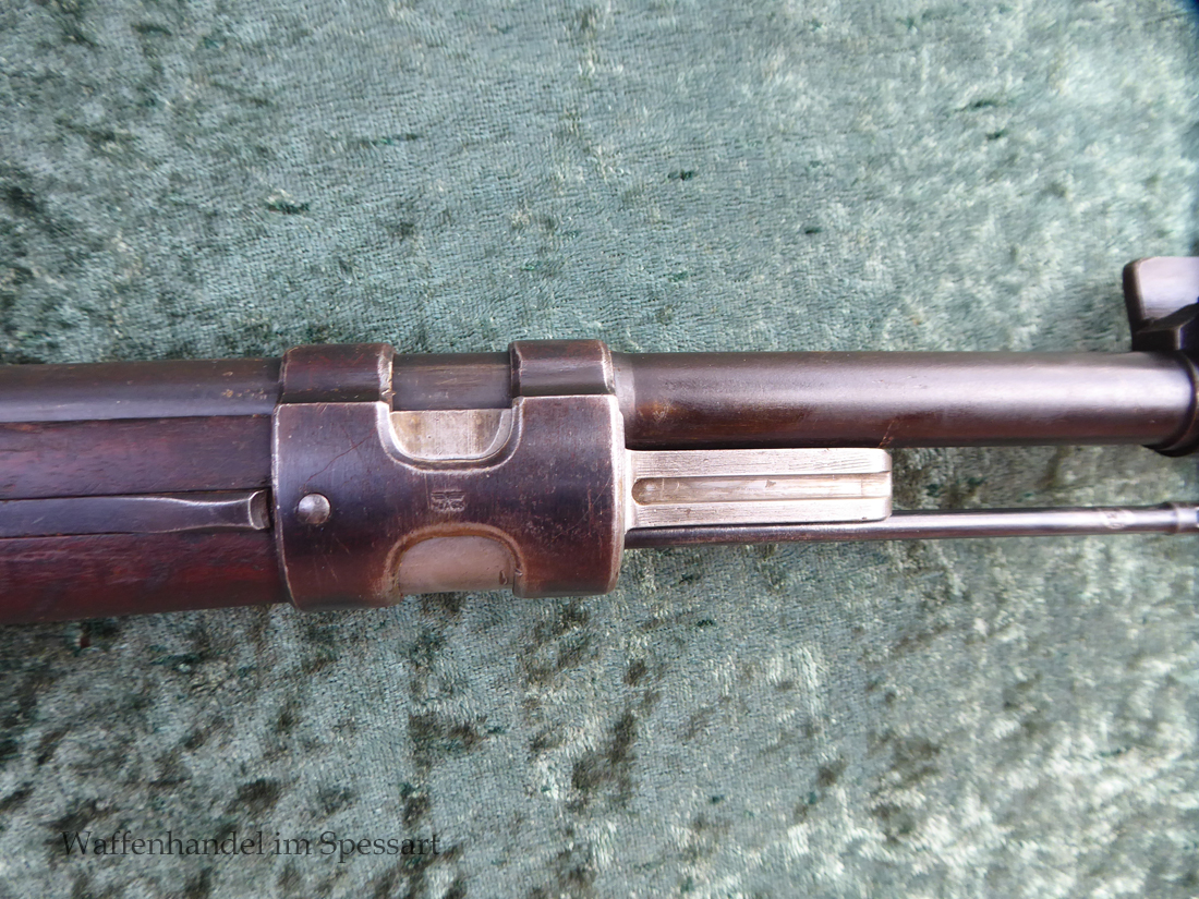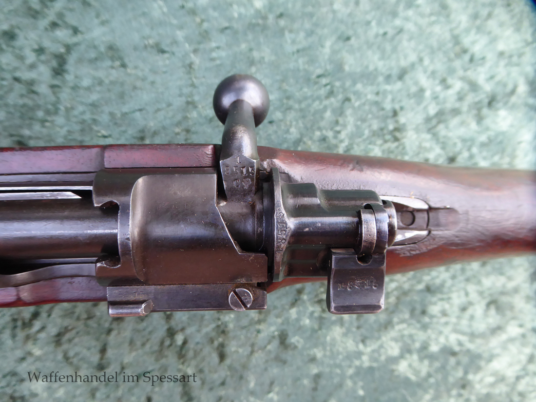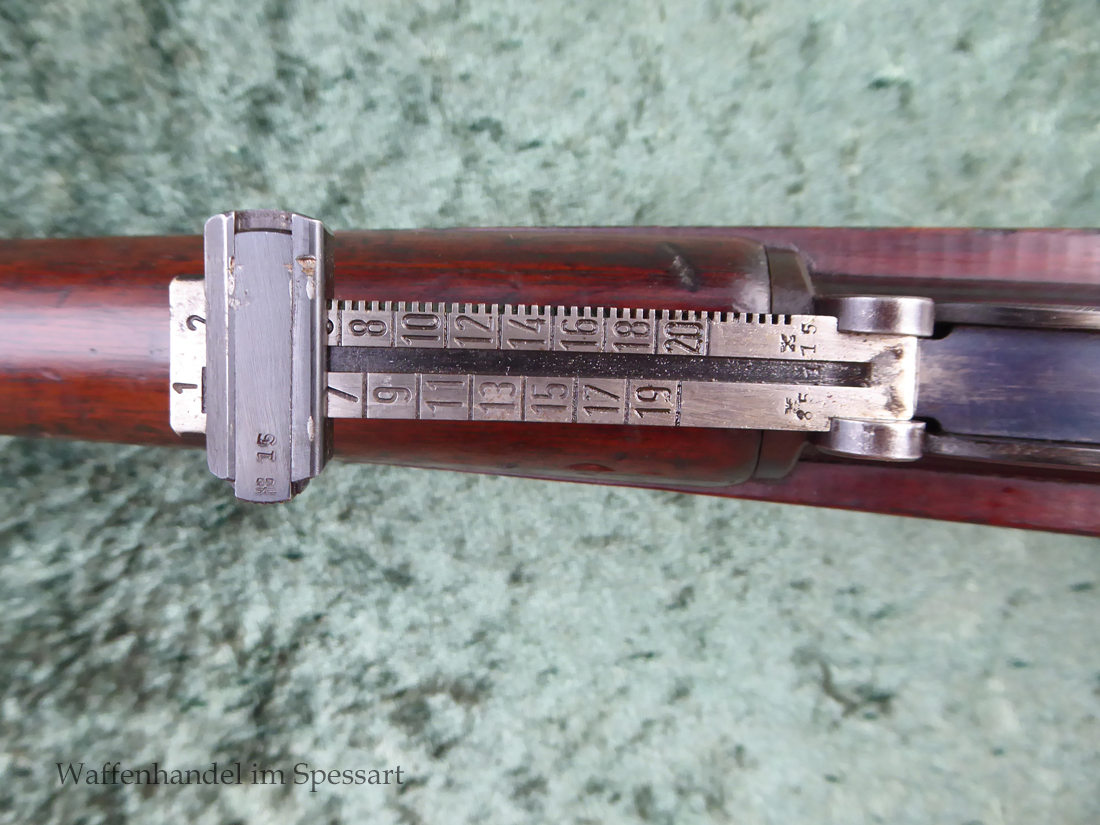 Hersteller Mauser Oberndorf. Kal.8x57is. Ser.Nr. C18515. Nummerngleich. Mit nummerngleichem Bajonett. Das Laufinnere hat scharfkantige Felder und Züge und ist blank. Gute und schöne originale Brünierung mit Spuren des Gebrauches. Der Nußbaum Schaft mit geringen Gebrauchspuren und allen tief erhaltenen Abnahmen. Durch die frühe Fertigung für Portugal bedingt haben alle Teile die Abnahme Waa 63. Diese Serie hat original ein Balkenkorn und eine Kimme mit U Ausschnitt für besseres Zielen!