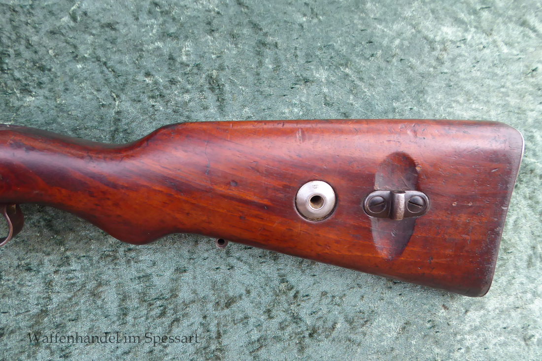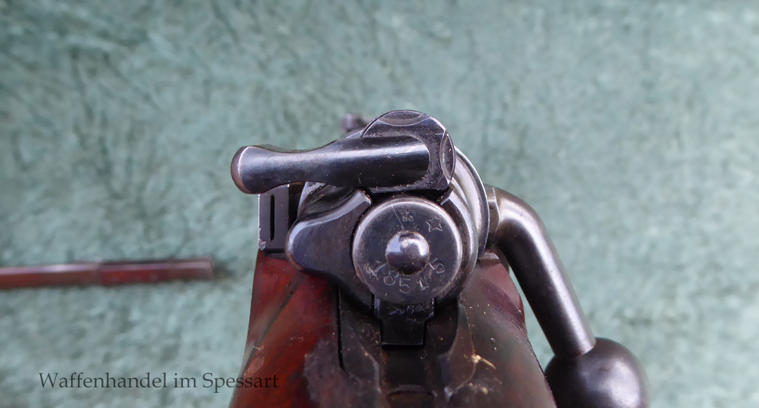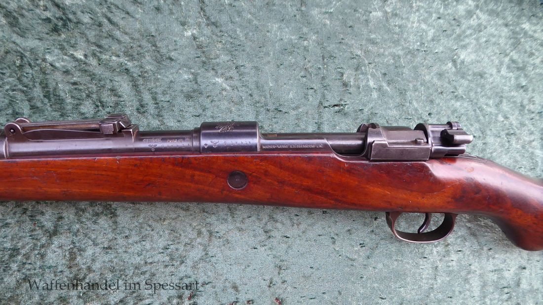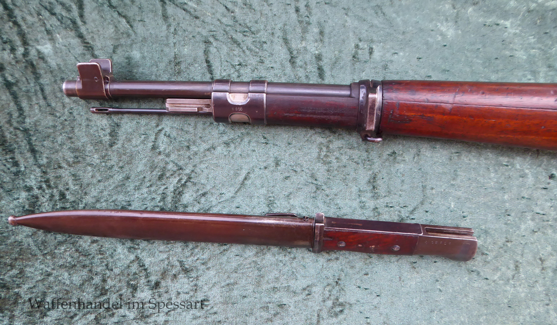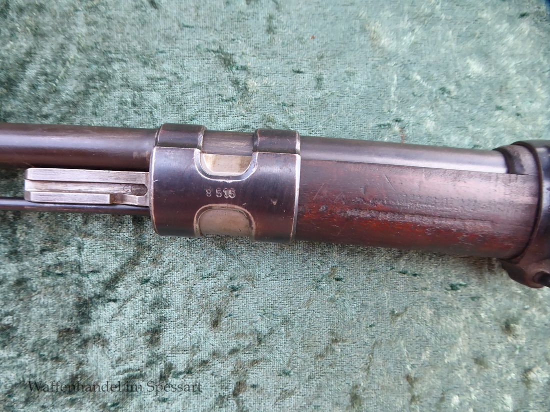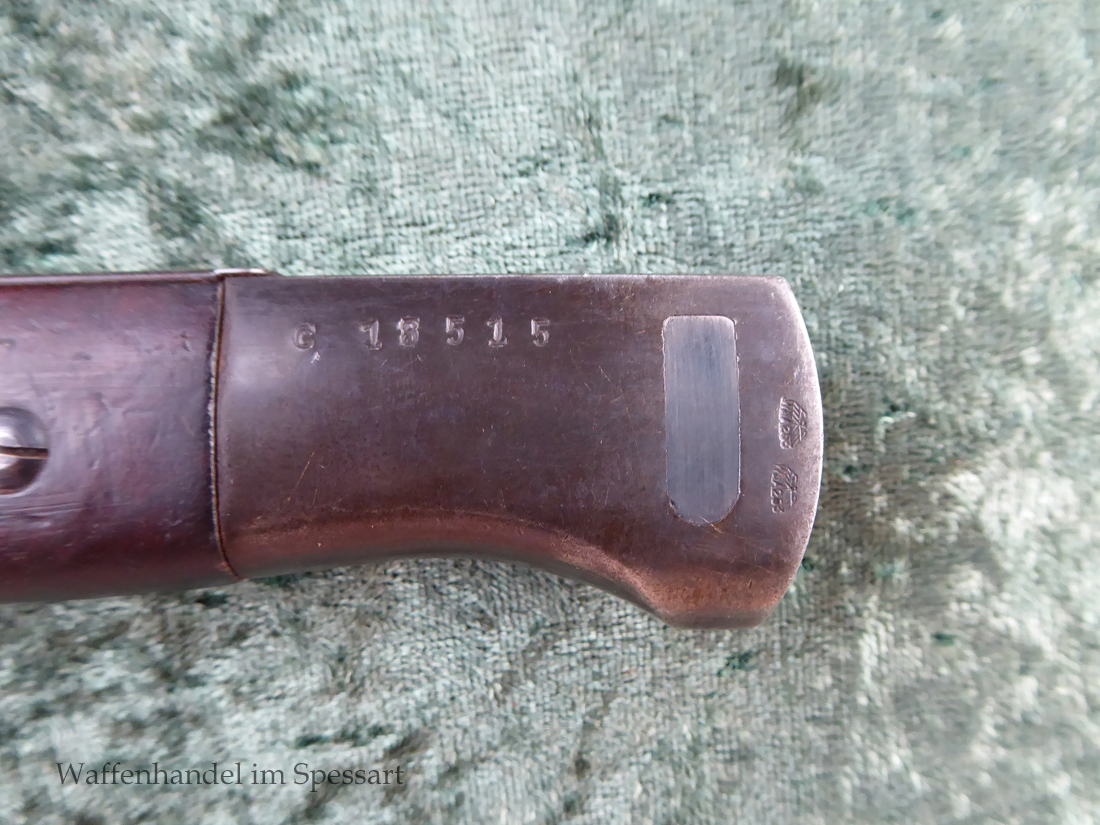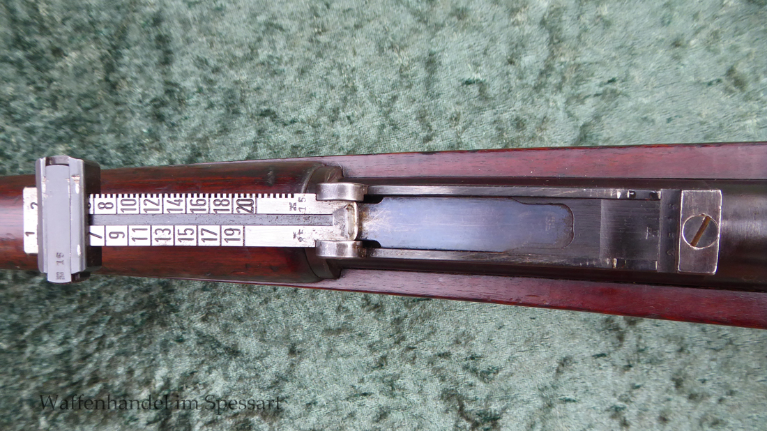 Hersteller Mauser Oberndorf. Kal.8x57is. Ser.Nr. C18515. Nummerngleich. Mit nummerngleichem Bajonett. Das Laufinnere hat scharfkantige Felder und Züge und ist blank. Gute und schöne originale Brünierung mit Spuren des Gebrauches. Der Nußbaum Schaft mit geringen Gebrauchspuren und allen tief erhaltenen Abnahmen. Durch die frühe Fertigung für Portugal bedingt haben alle Teile die Abnahme Waa 63. Diese Serie hat original ein Balkenkorn und eine Kimme mit U Ausschnitt für besseres Zielen!