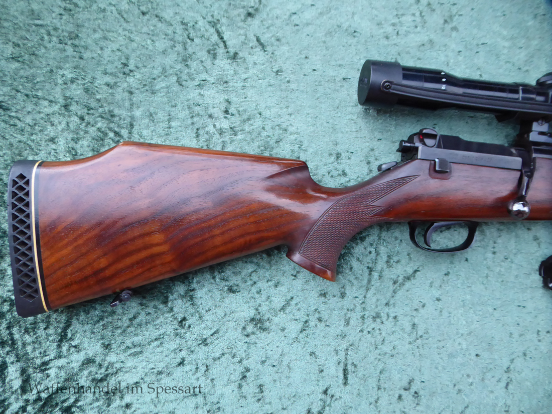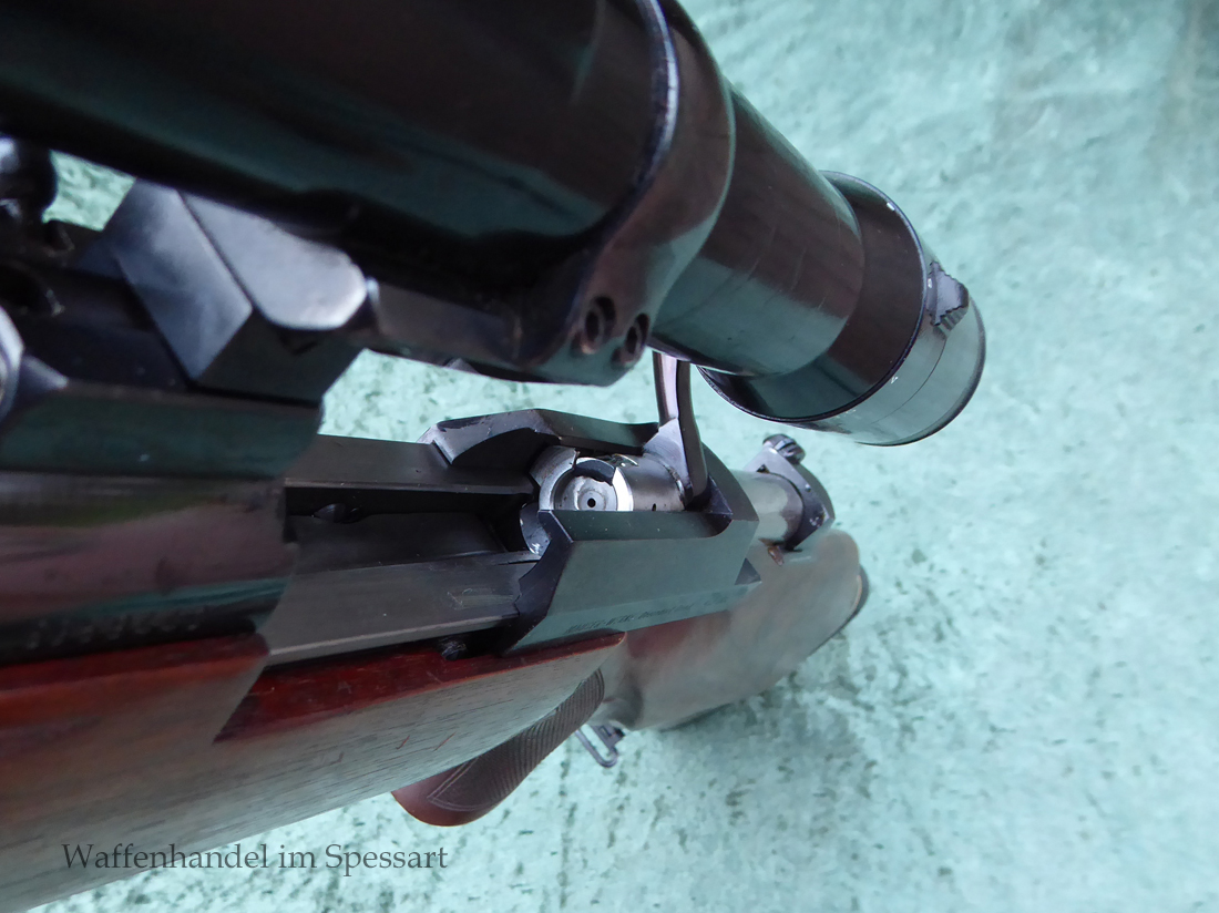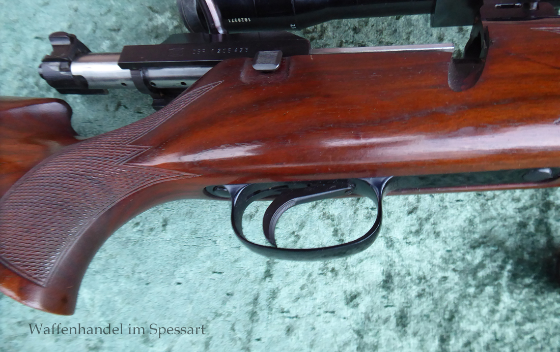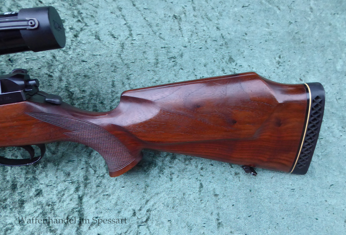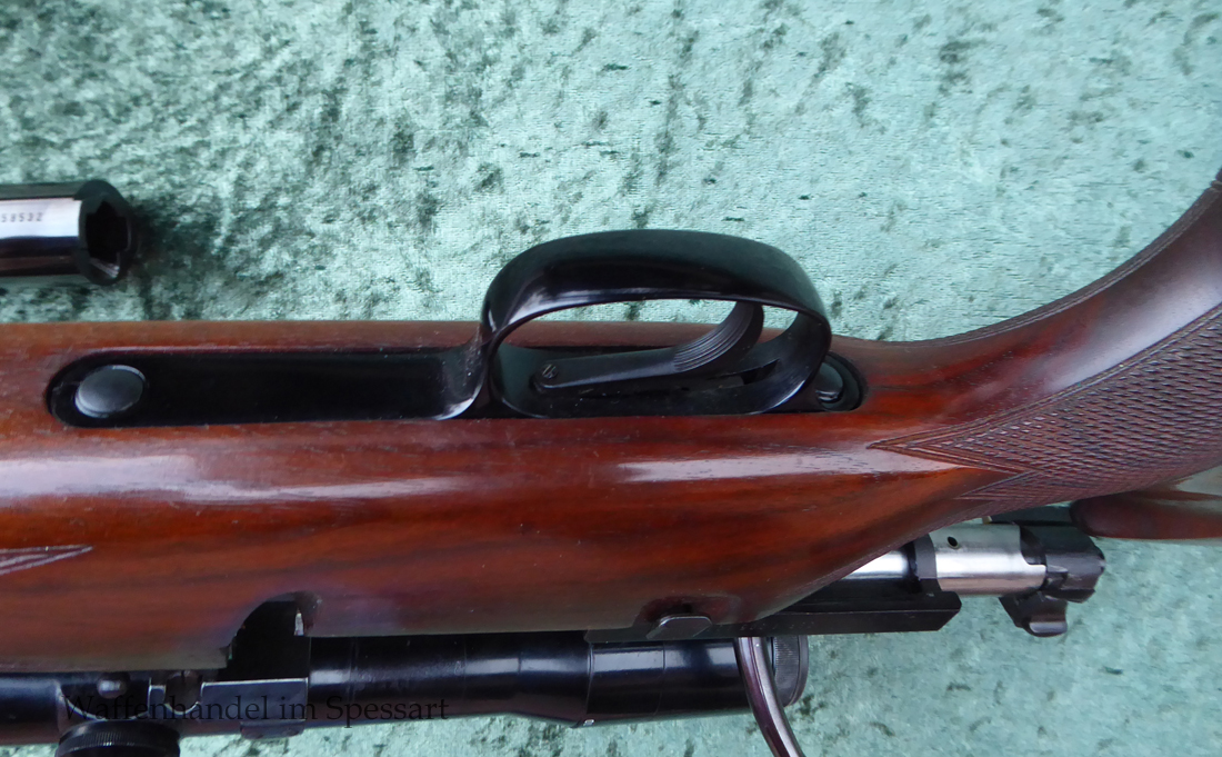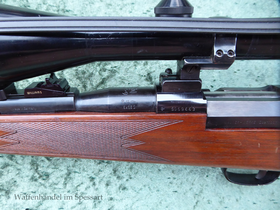 Hersteller Mauser Oberndorf. Kal.8x68S. Ser.Nr. SG59443. Beschuß in Ulm 1994. Die Besonderheit dieser Mauser 66SL ist das diese die modernere Sicherung zum Schieben nach Vorne und Hinten hat, sowie den Stecher auf dem Kolbenhals. Einstellbarer Direktabzug macht diese zur "modernen" Büchse! Scharfkantiges blankes Laufinnere. Fast vollständige Hochglanzbrünierung. Nußbaumschaft mit geringen Gebrauchspuren (leichte Kratzer durch das Stellen im Tresor).