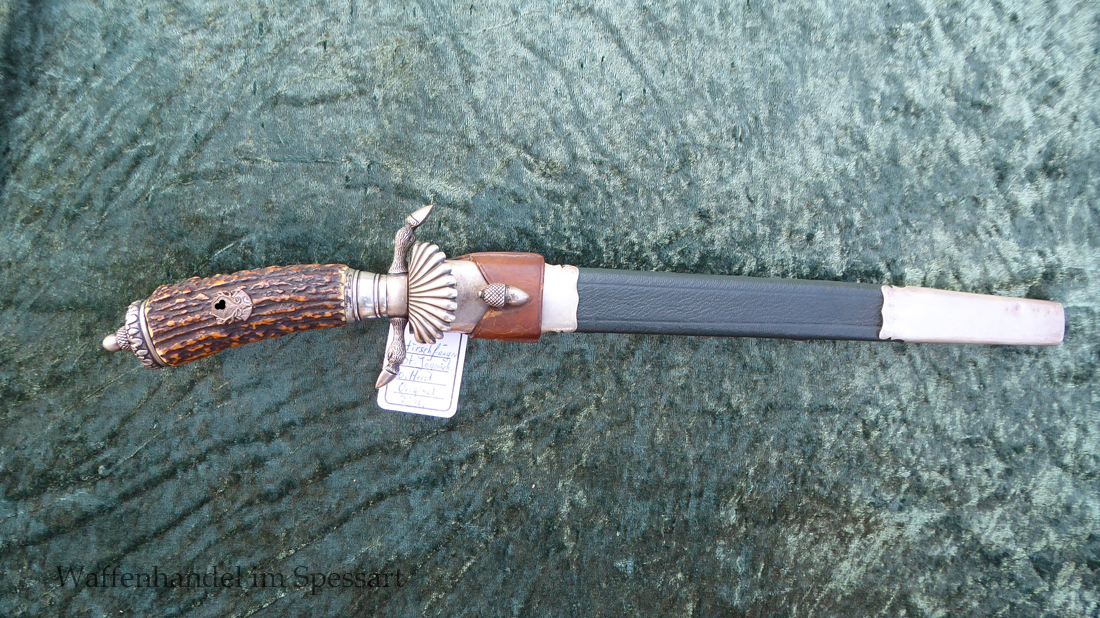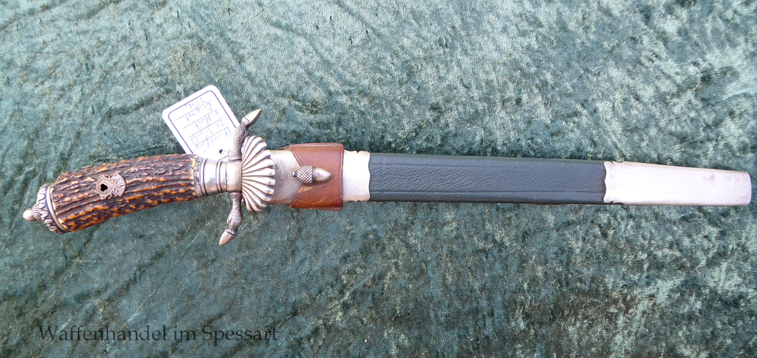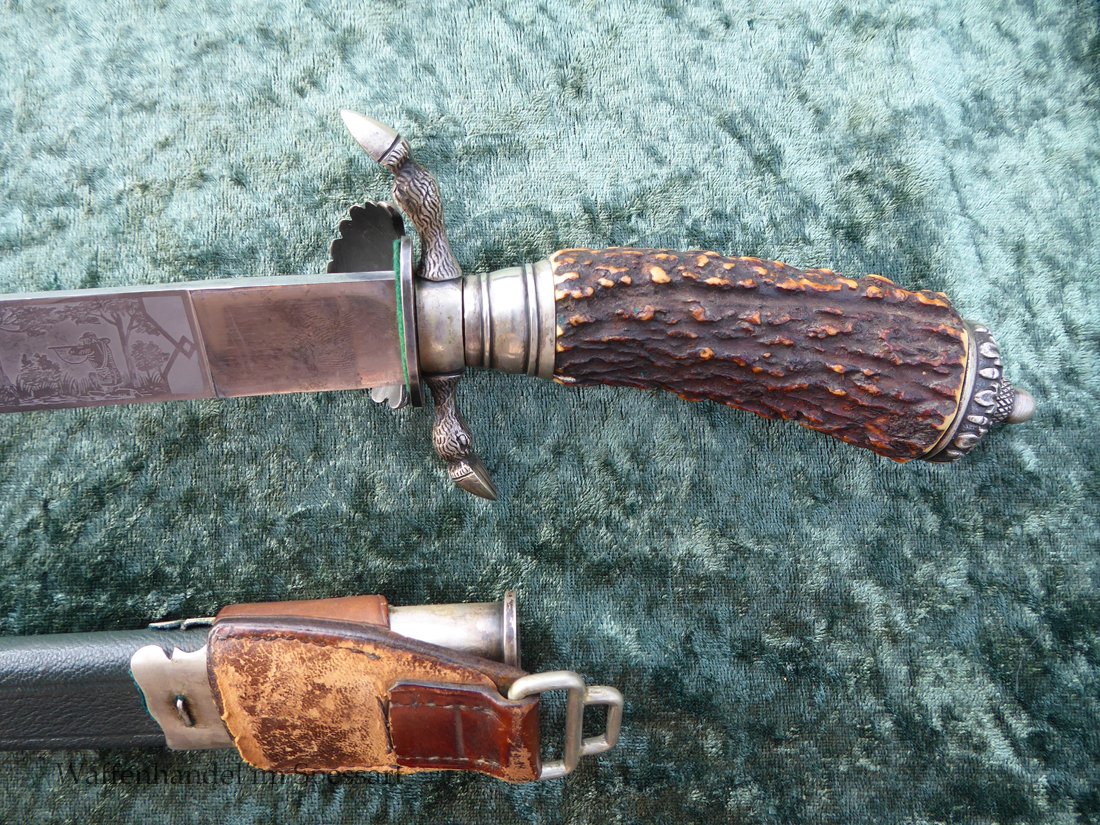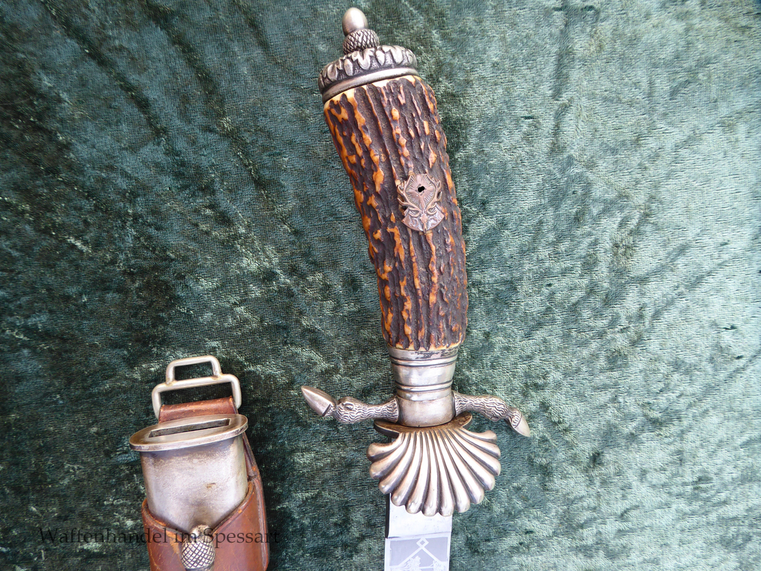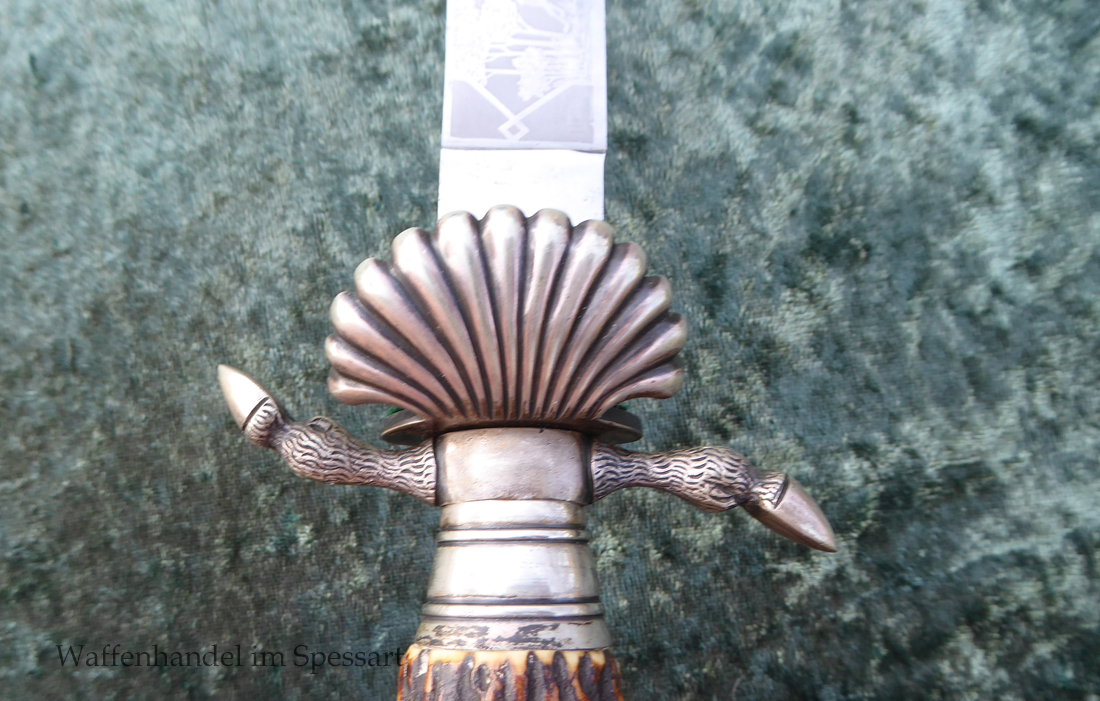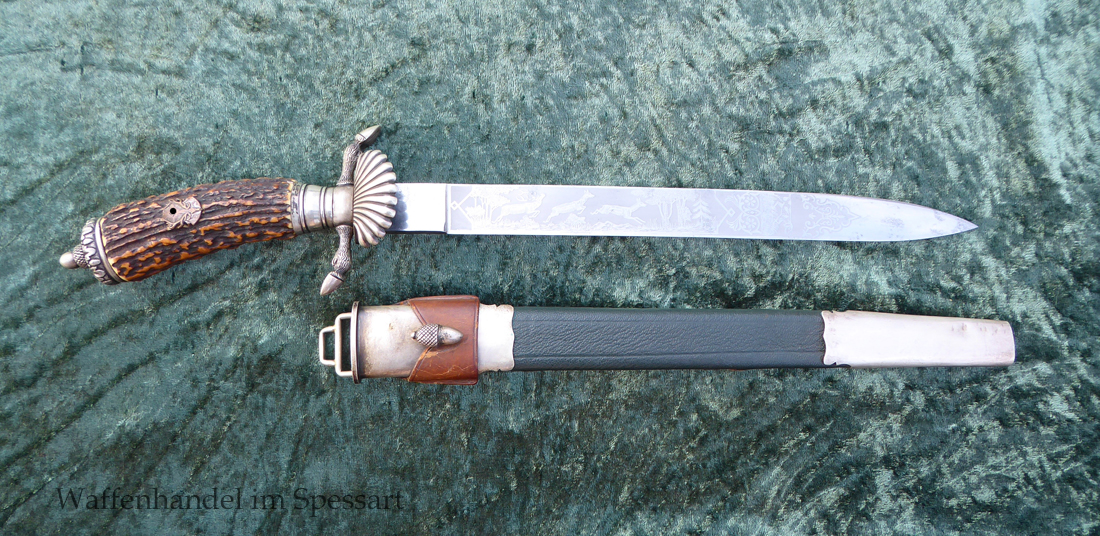 Hergestellt in Solingen ohne Herstellermarkierung. Echter schön geperlter Hirschhorngriff. Fein geätzte fast perfekt erhaltene Klinge. Originales Abzeichen der deutschen Jägerschaft! Es ist magnetisch, Trägeschicht Kupfer und hat keine Versilberung mehr (abgegriffen) mit Patina. Grüne Saffian Lederscheide die geklammert ist. Versilberte Montur. Sehr schön plastisch gearbeiteter Griffabschluß mit Eichenlaub und Eichel.