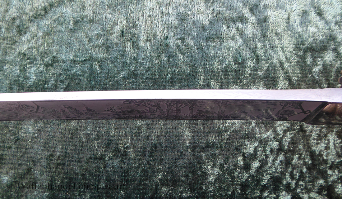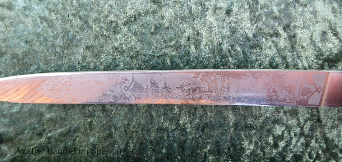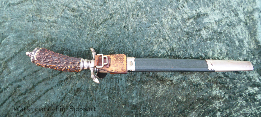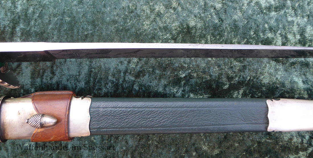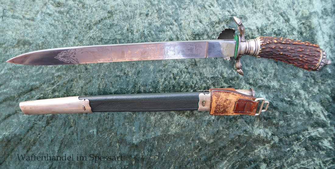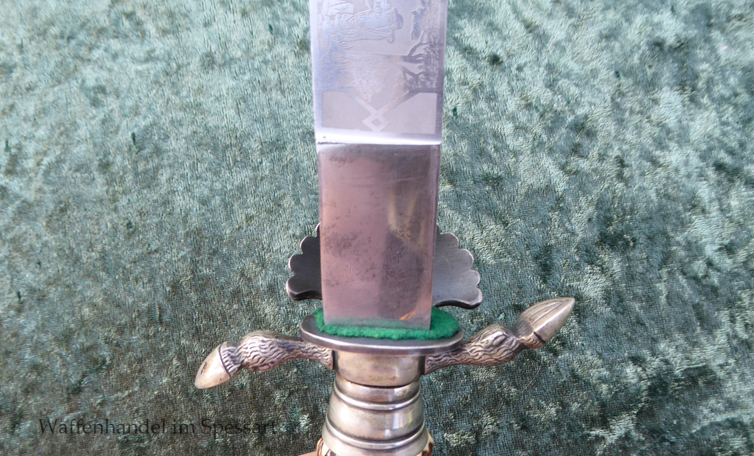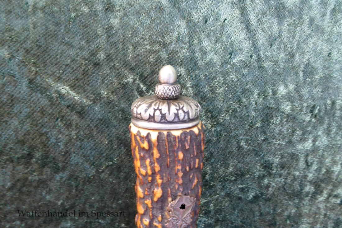 Hergestellt in Solingen ohne Herstellermarkierung. Echter schön geperlter Hirschhorngriff. Fein geätzte fast perfekt erhaltene Klinge. Originales Abzeichen der deutschen Jägerschaft! Es ist magnetisch, Trägeschicht Kupfer und hat keine Versilberung mehr (abgegriffen) mit Patina. Grüne Saffian Lederscheide die geklammert ist. Versilberte Montur. Sehr schön plastisch gearbeiteter Griffabschluß mit Eichenlaub und Eichel.