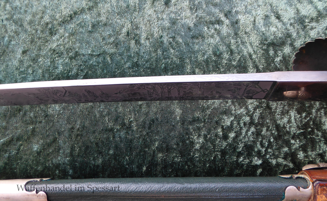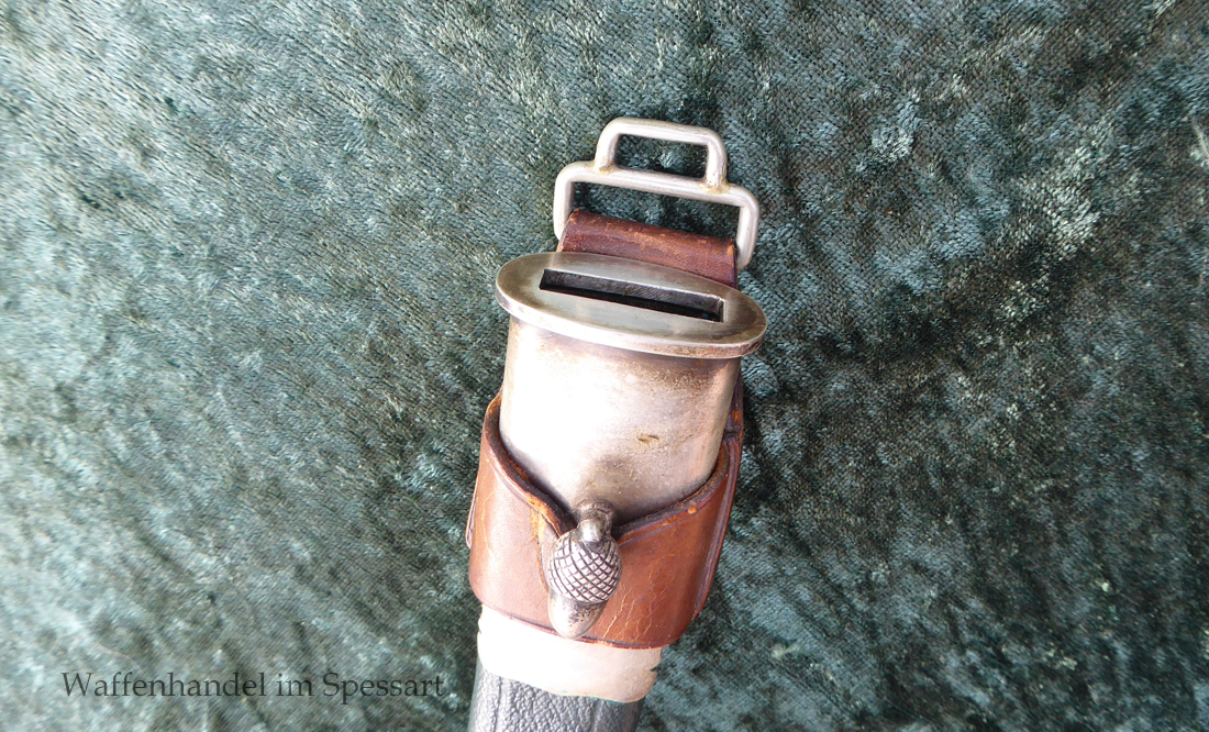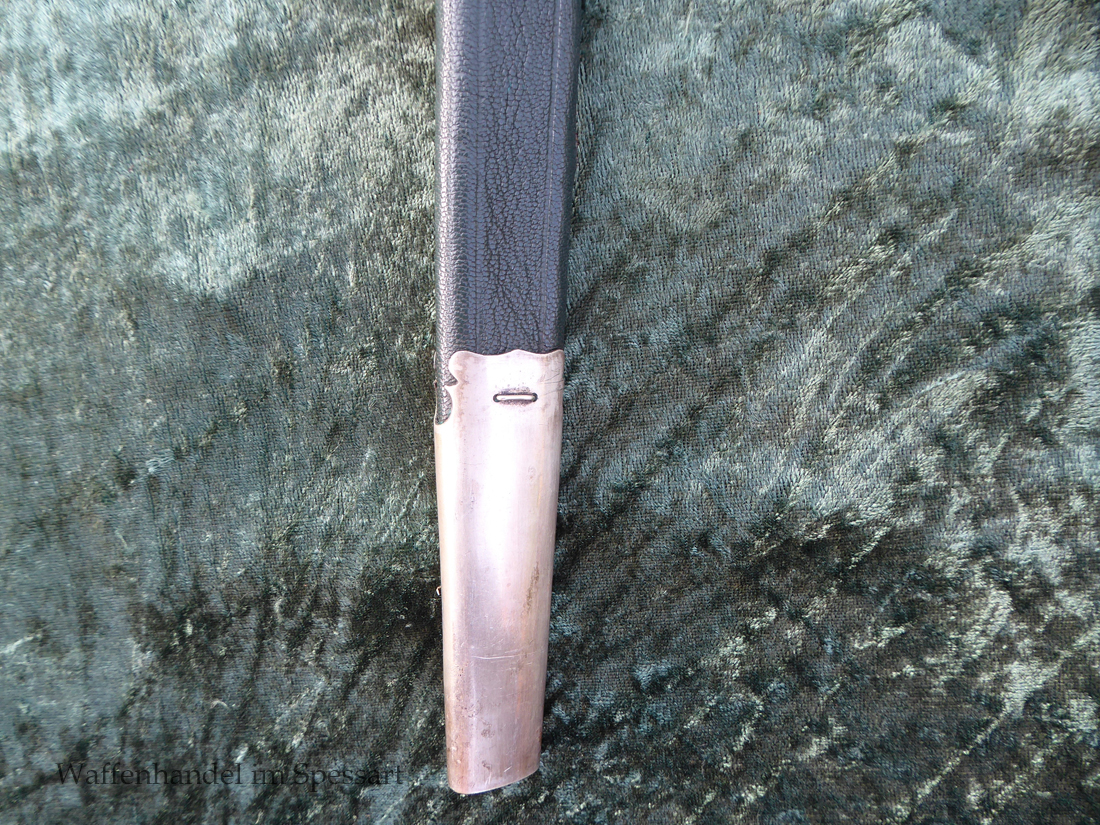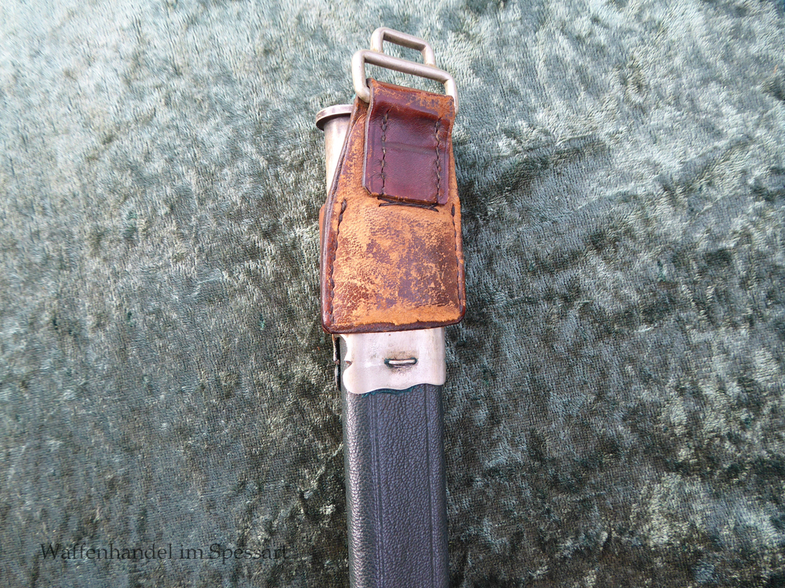 Gesamtlänge mit Scheide 49,5cm. Hirschfängerlänge 47cm, Klingenlänge 32,5cm, Klingenbreite 26mm. Mit orig. dazu gehörigem braunen Koppelschuh.