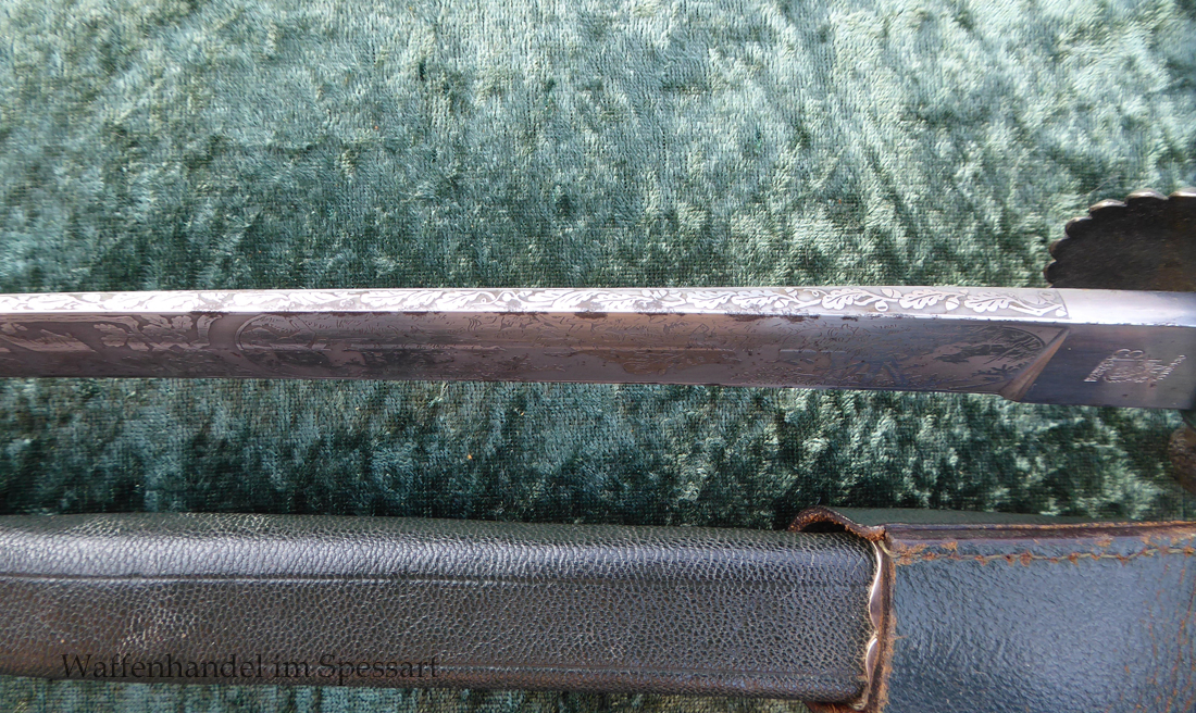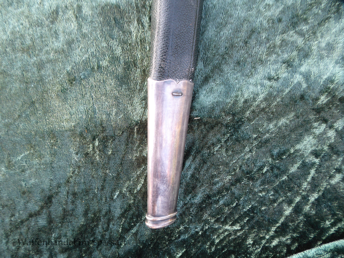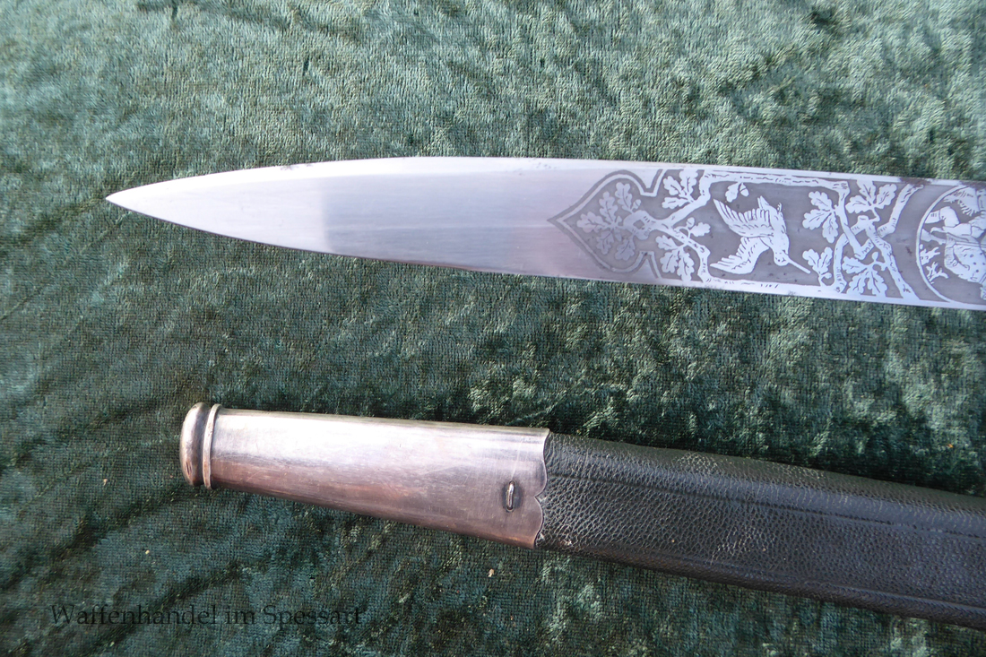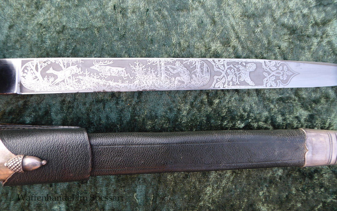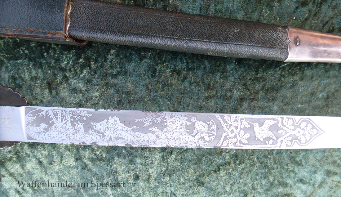 Gesamtlänge mit Scheide 48,5cm. Hirschfängerlänge 46,5cm, Klingenlänge 33cm, Klingenbreite 27mm. Mit orig. dazu gehörigem Koppelschuh.