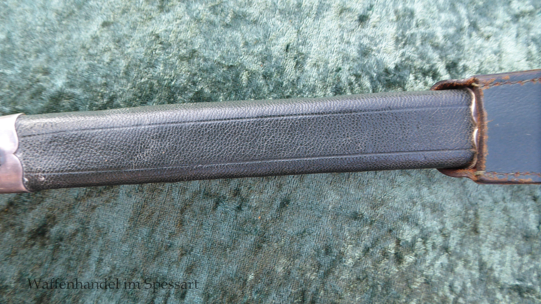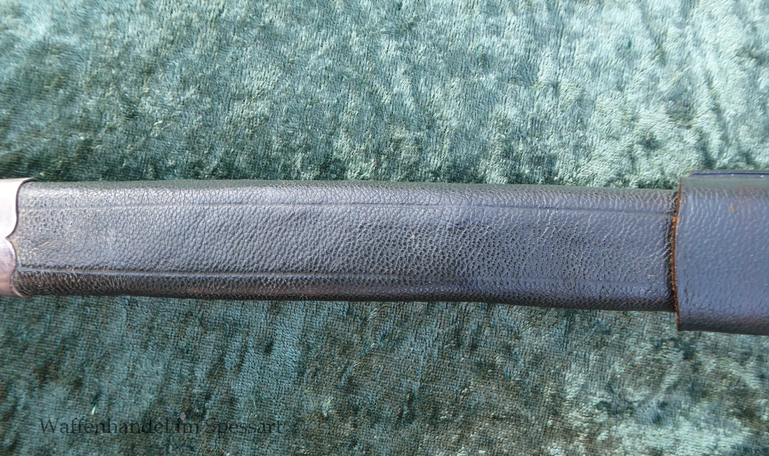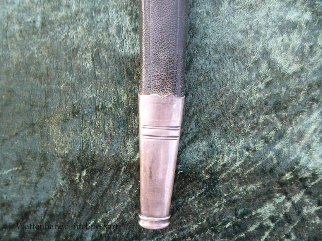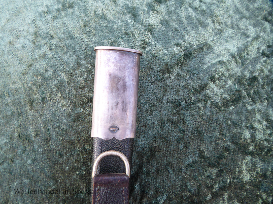 Gesamtlänge mit Scheide 48,5cm. Hirschfängerlänge 46,5cm, Klingenlänge 33cm, Klingenbreite 27mm. Mit orig. dazu gehörigem Koppelschuh.