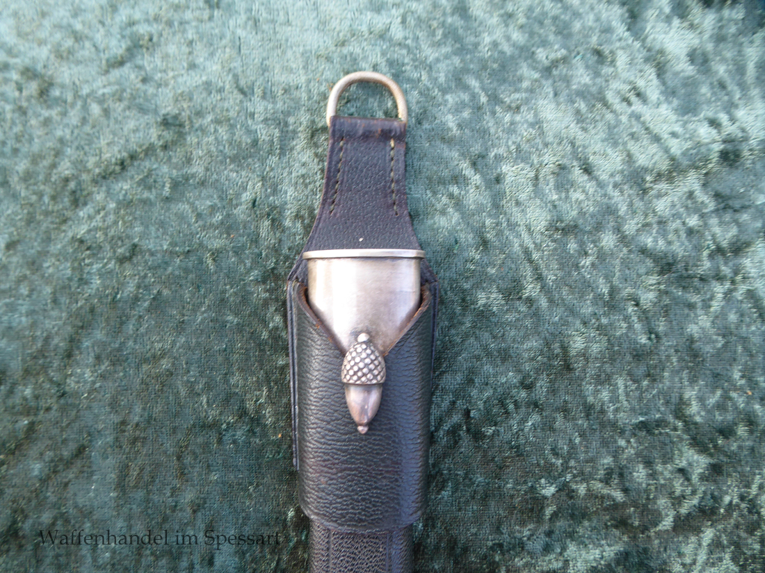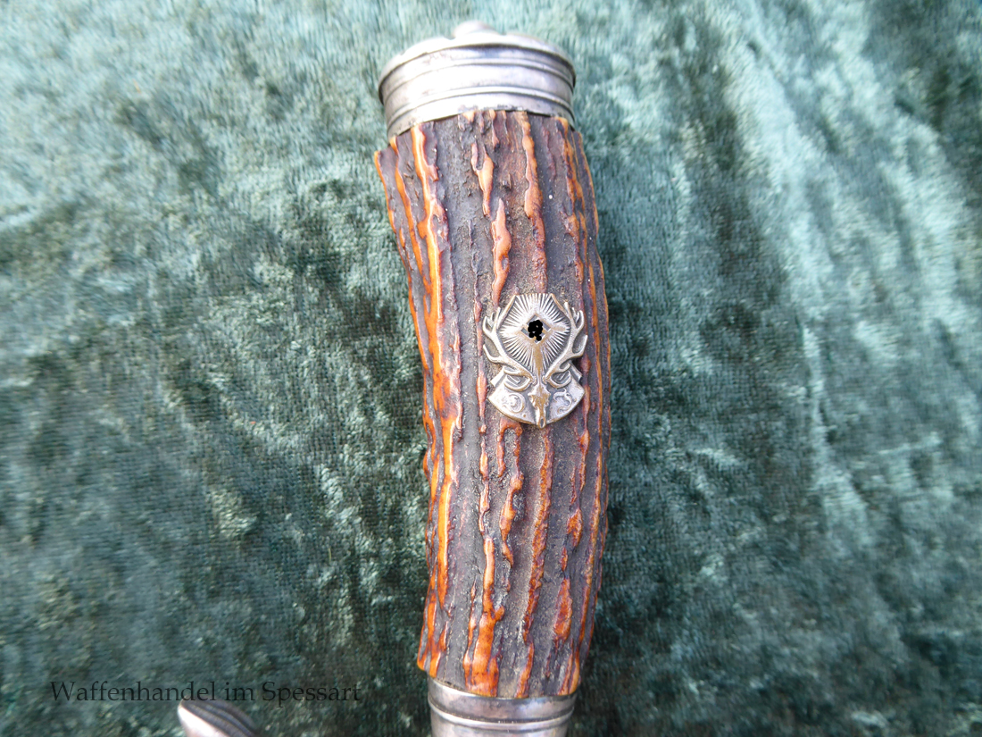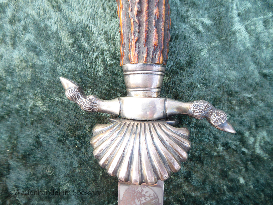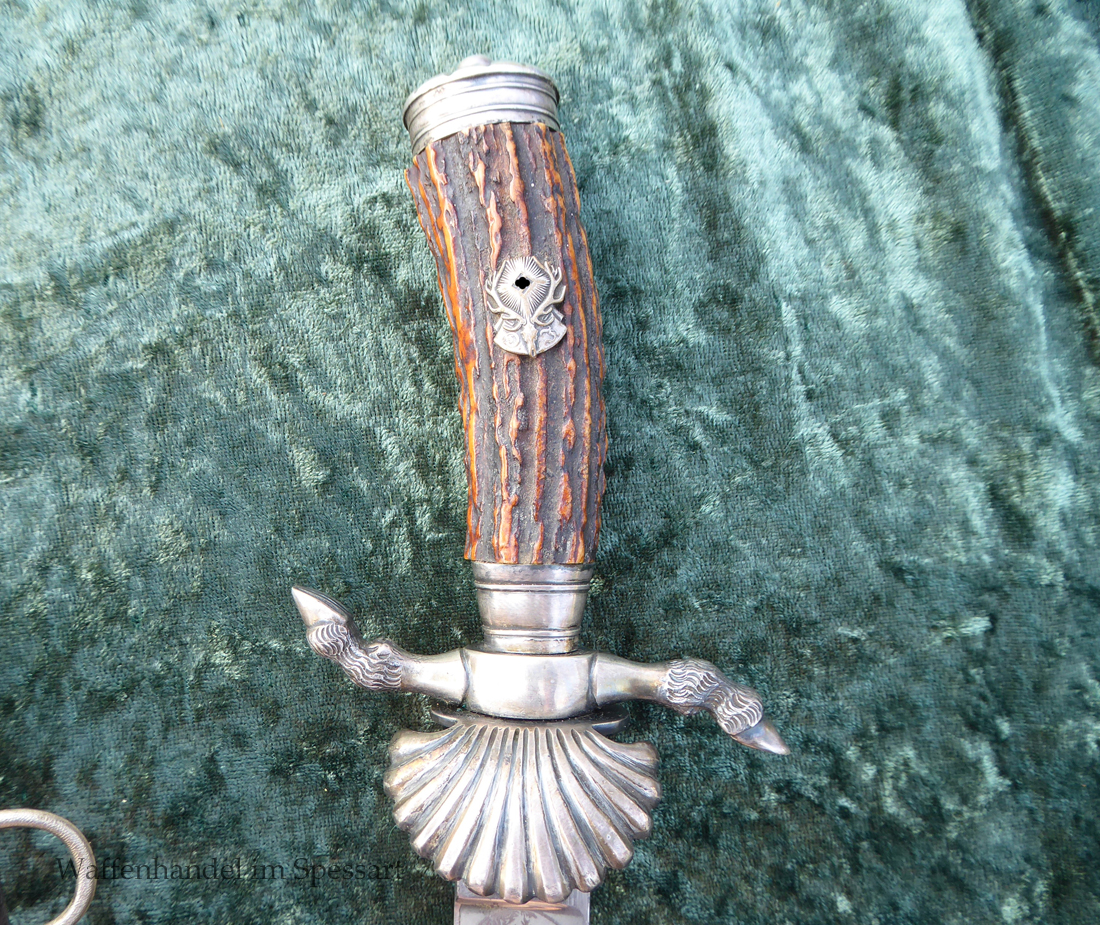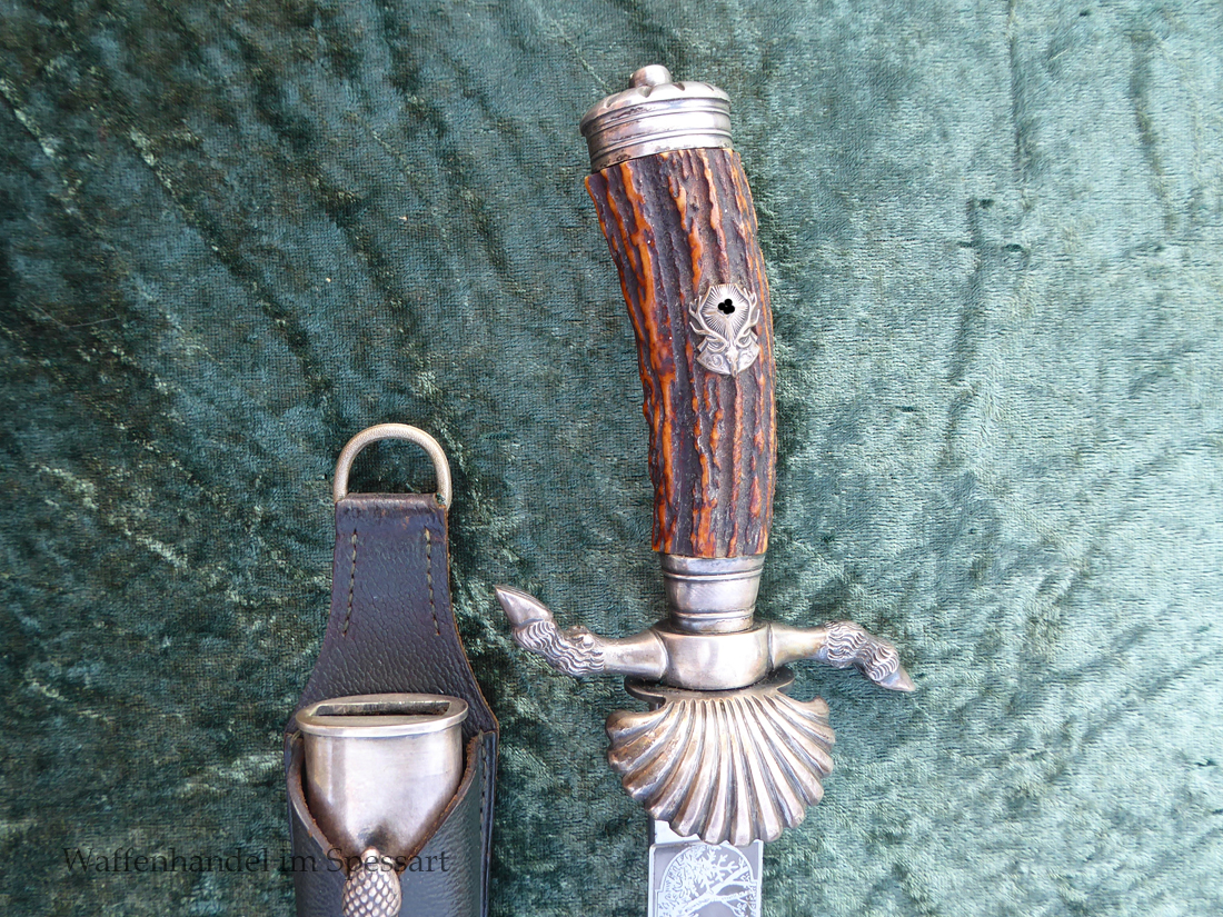 Hergestellt von Eickhorn in Solingen. Echter schöner Hirschhorngriff. Fein geätzte fast perfekt erhaltene Klinge (geringe Fleckchen an den Kanten). Originales Abzeichen der deutschen Jägerschaft! Es ist magnetisch, Trägeschicht Kupfer und hat keine Versilberung mehr (abgegriffen) mit Patina. Grüne Saffian Lederscheide die geklammert ist. Versilberte Montur.